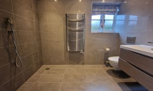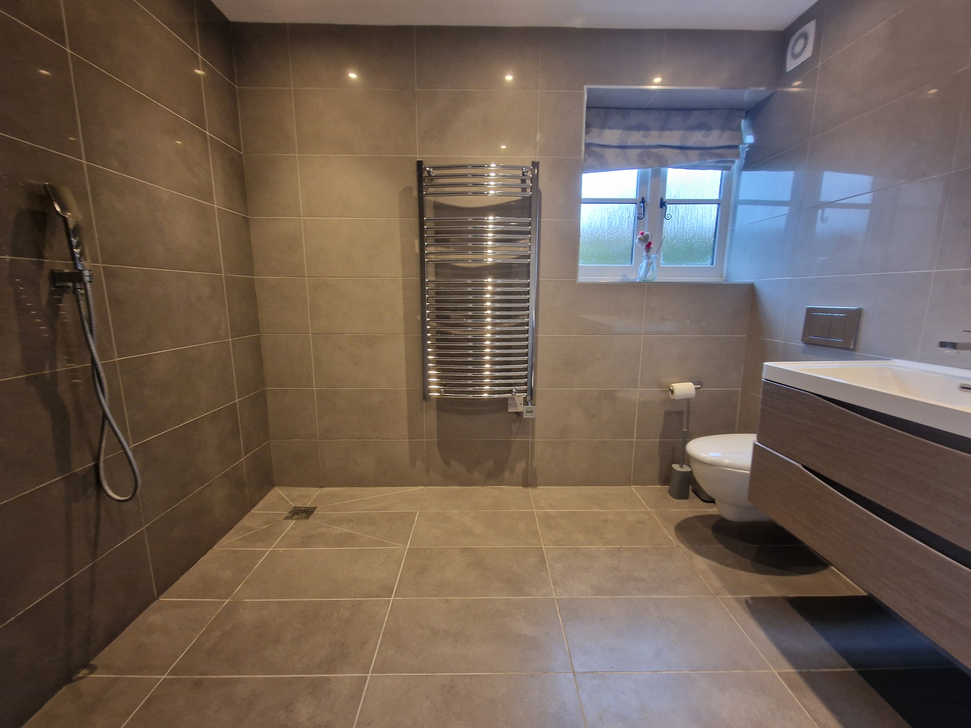 En-suite wet room: tiled floor and walls, double washbasin, wc with concealed cistern, shower and heated towel rail, double glazed window