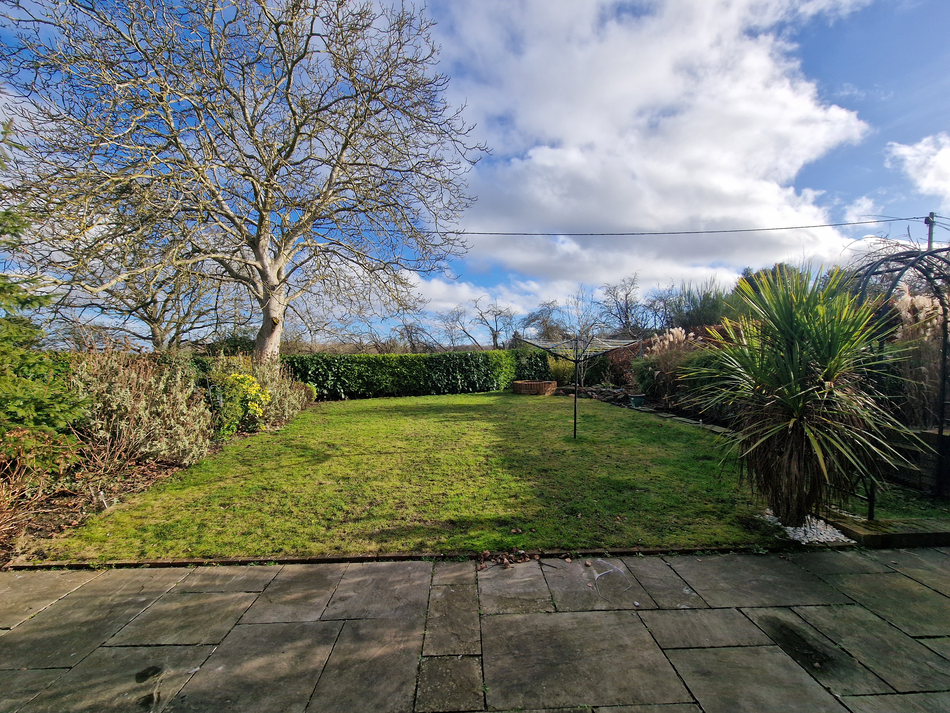 Gardens to front, rear and one side with patio areas to the rear and one side, a mature hedge, fruit bushes, a walnut tree, pond and well.