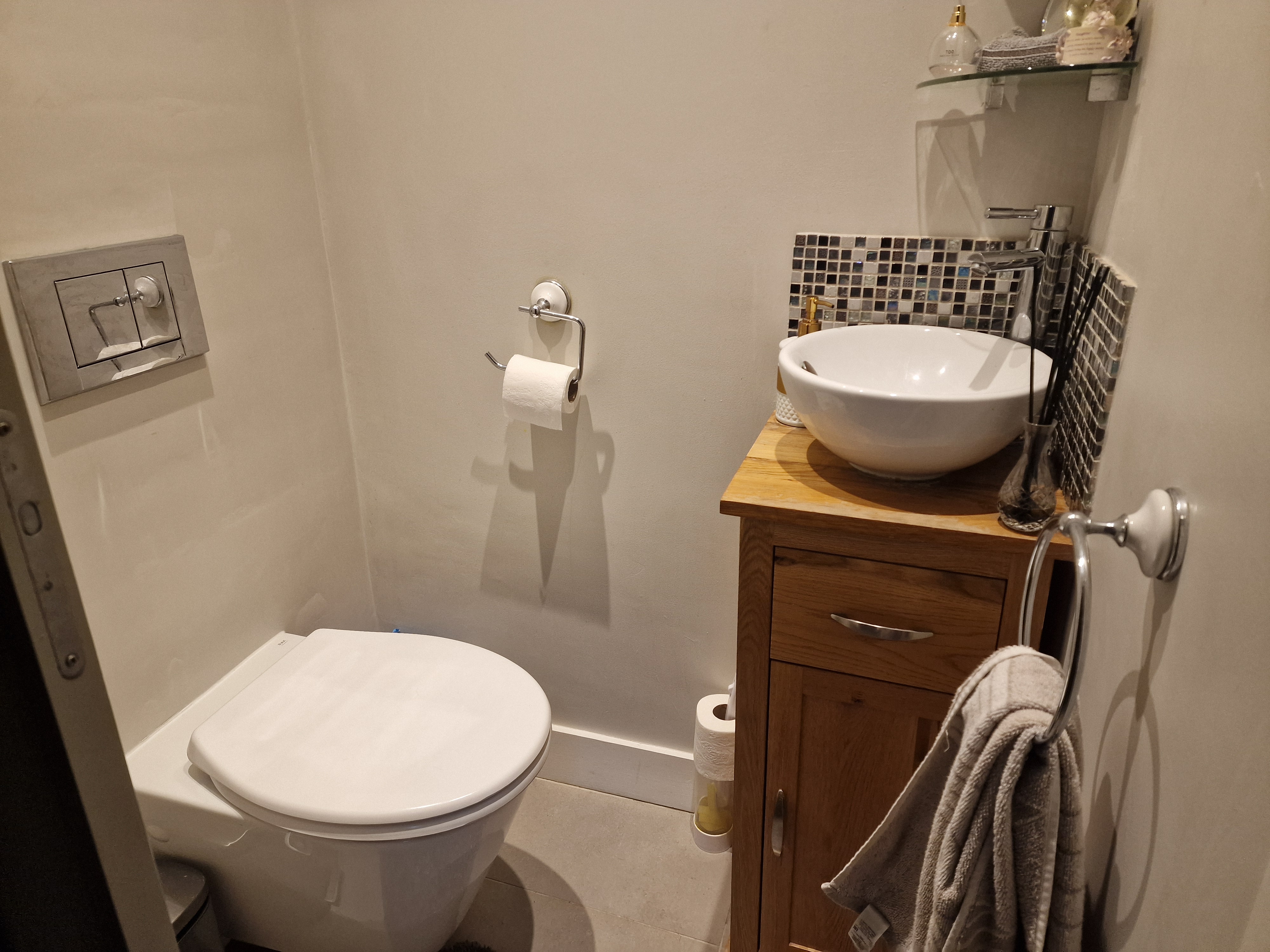 Guest cloakroom: with tiled floor, wc with concealed cistern and washbasin with cabinet