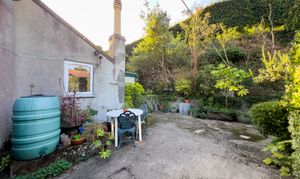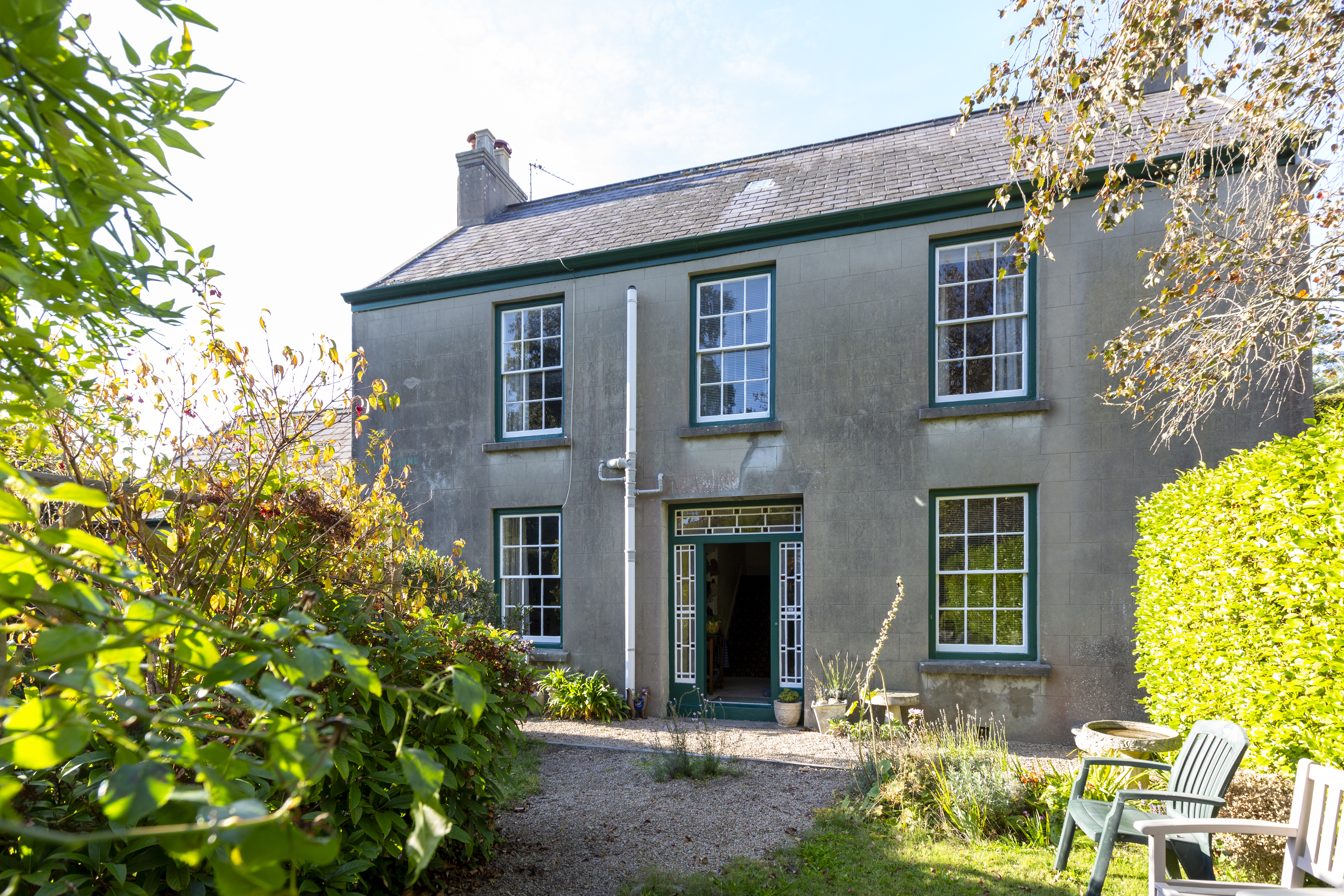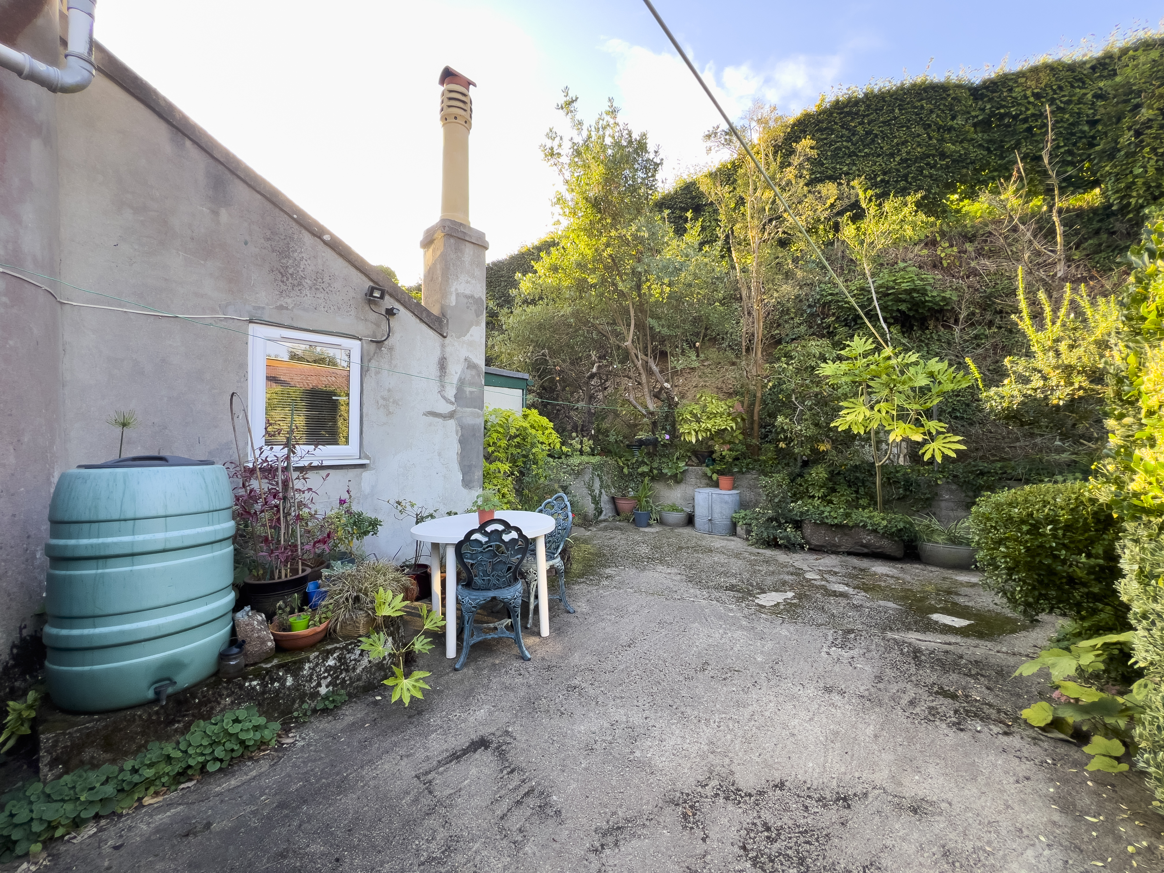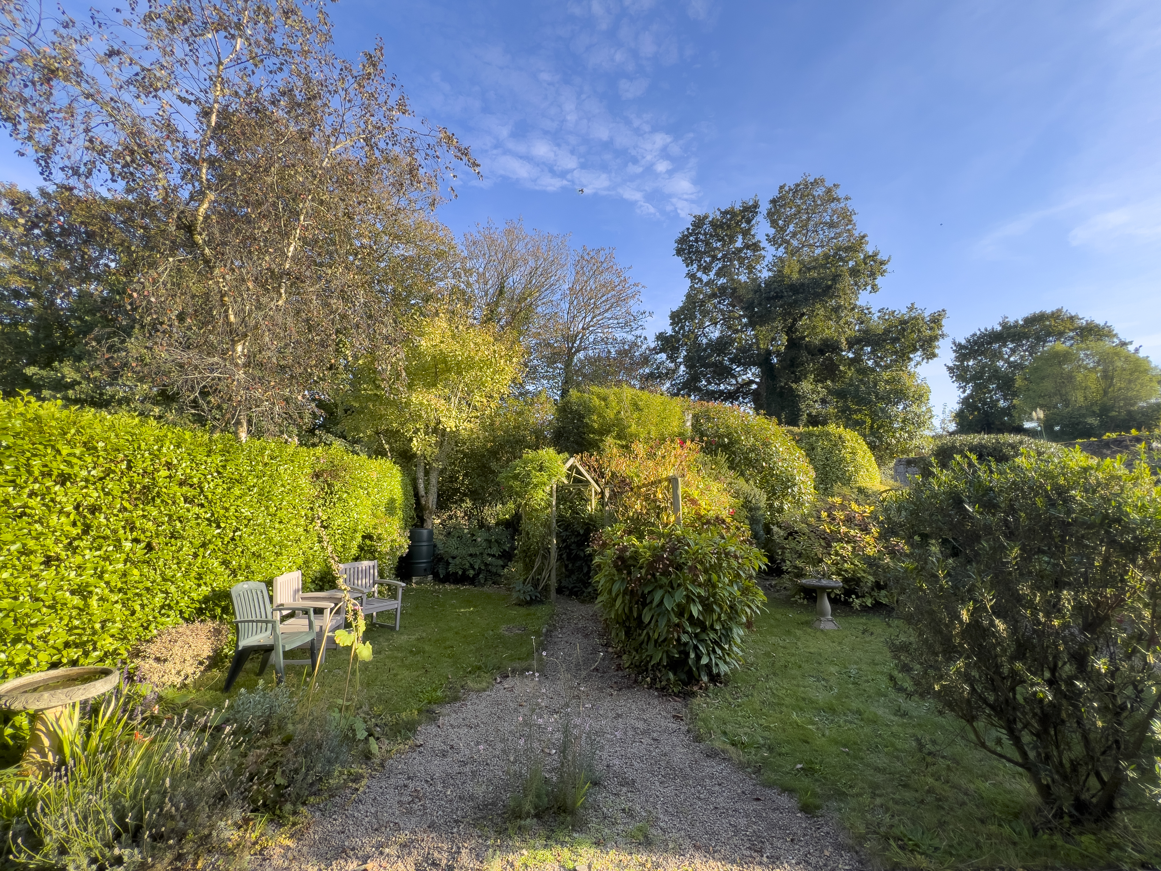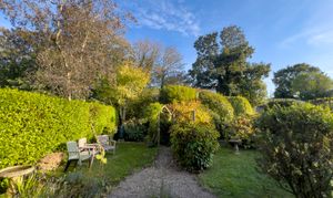 - Generous south-facing front garden with mature plants, trees, and shrubs