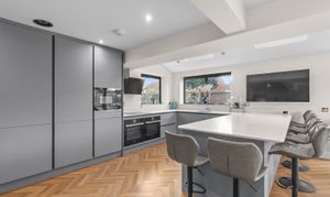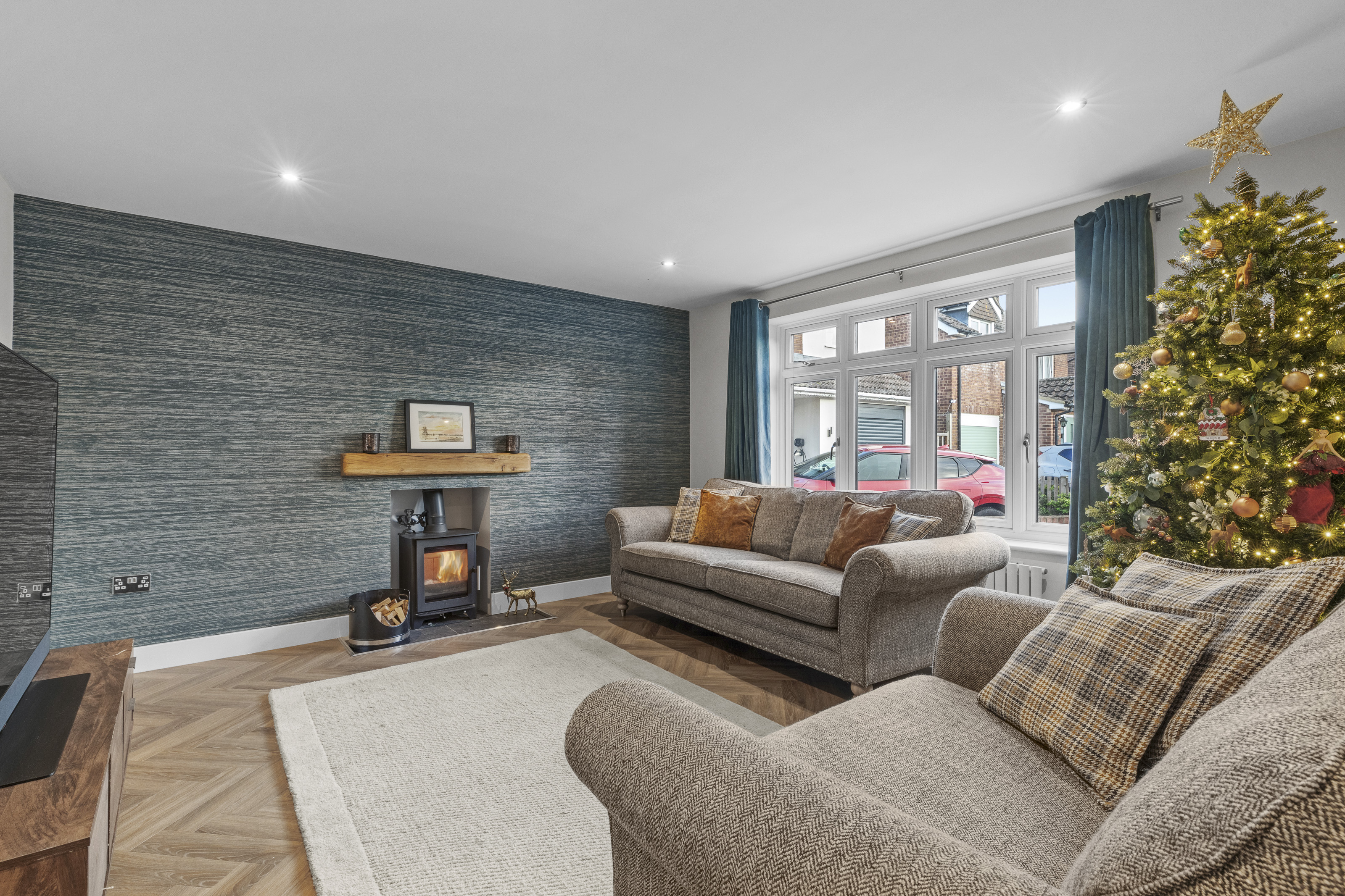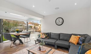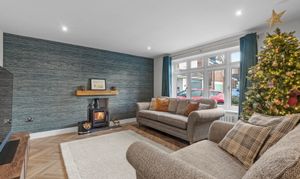 A remarkable blend of design and functionality, this property effortlessly balances contemporary style with everyday practicality, resulting in a living environment that impresses at every turn. At its core is the breathtaking open-plan kitchen, dining, and living area, where dual bifold doors bathe the space in natural light and create a warm, welcoming atmosphere. On cooler evenings, the cosy sitting room—with its crackling wood-burning stove—offers the perfect retreat.