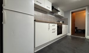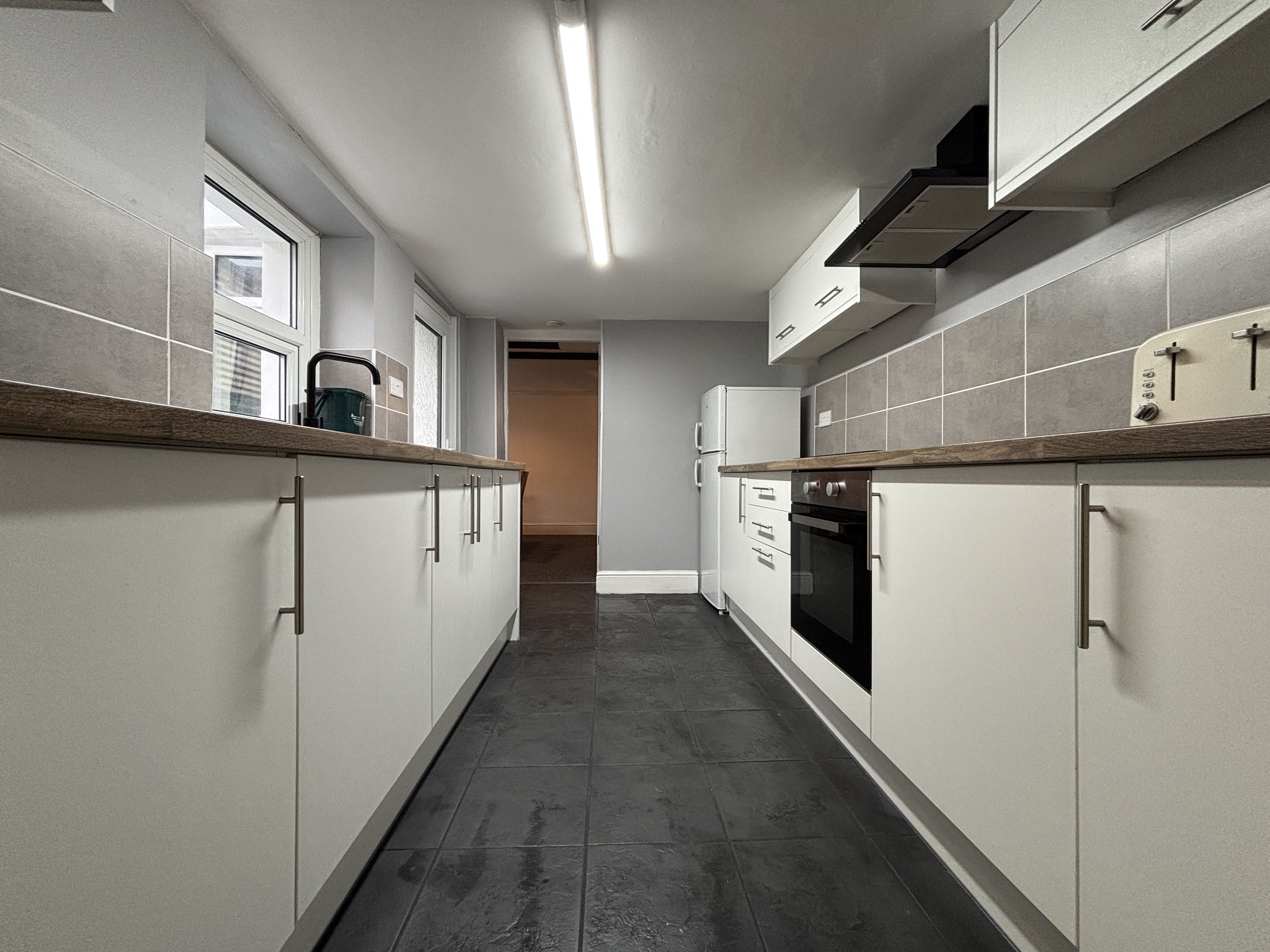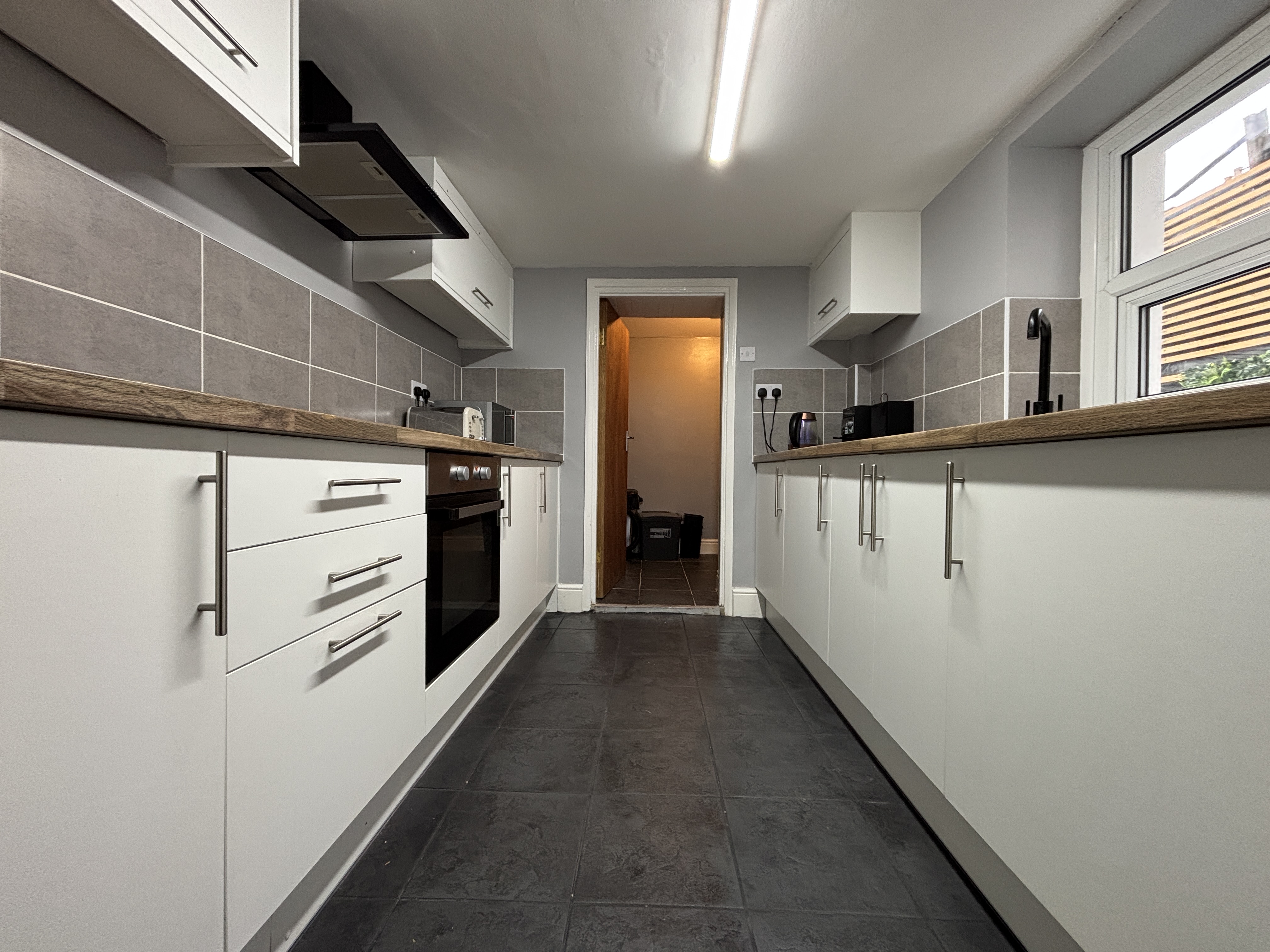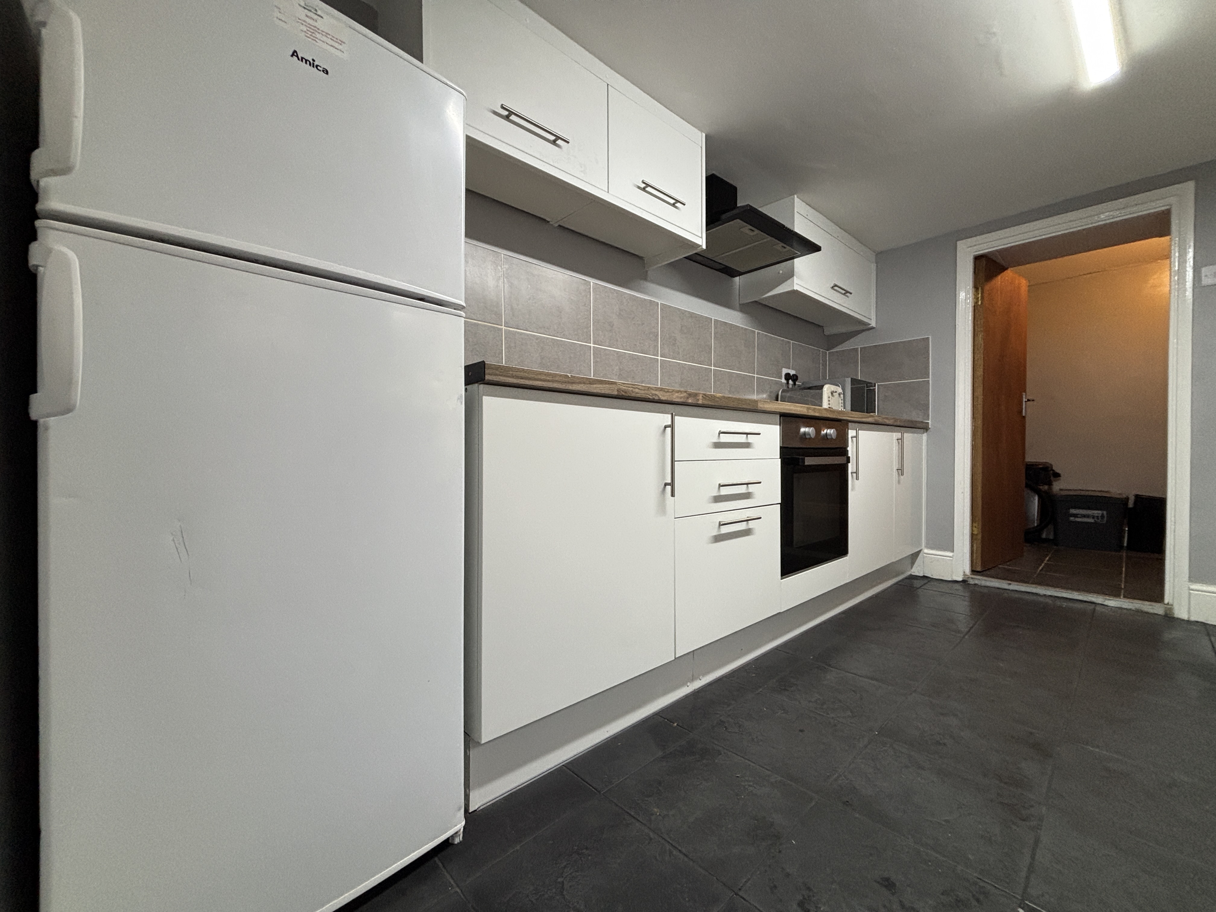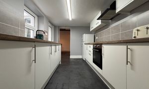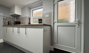 Tiled flooring, smooth walls and a smooth ceiling. A modern kitchen comprising a good range of white eye and base level units. Complementing wood effect worktops with a white composite sink inset with a black mixer tap overtop. Integrated appliances include a single oven, a four ring electric hob and an extractor hood. Space for a freestanding fridge/freezer. A side aspect window and a uPVC door with opaque glazing leading out into the garden. Open to the utility room.