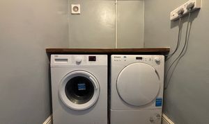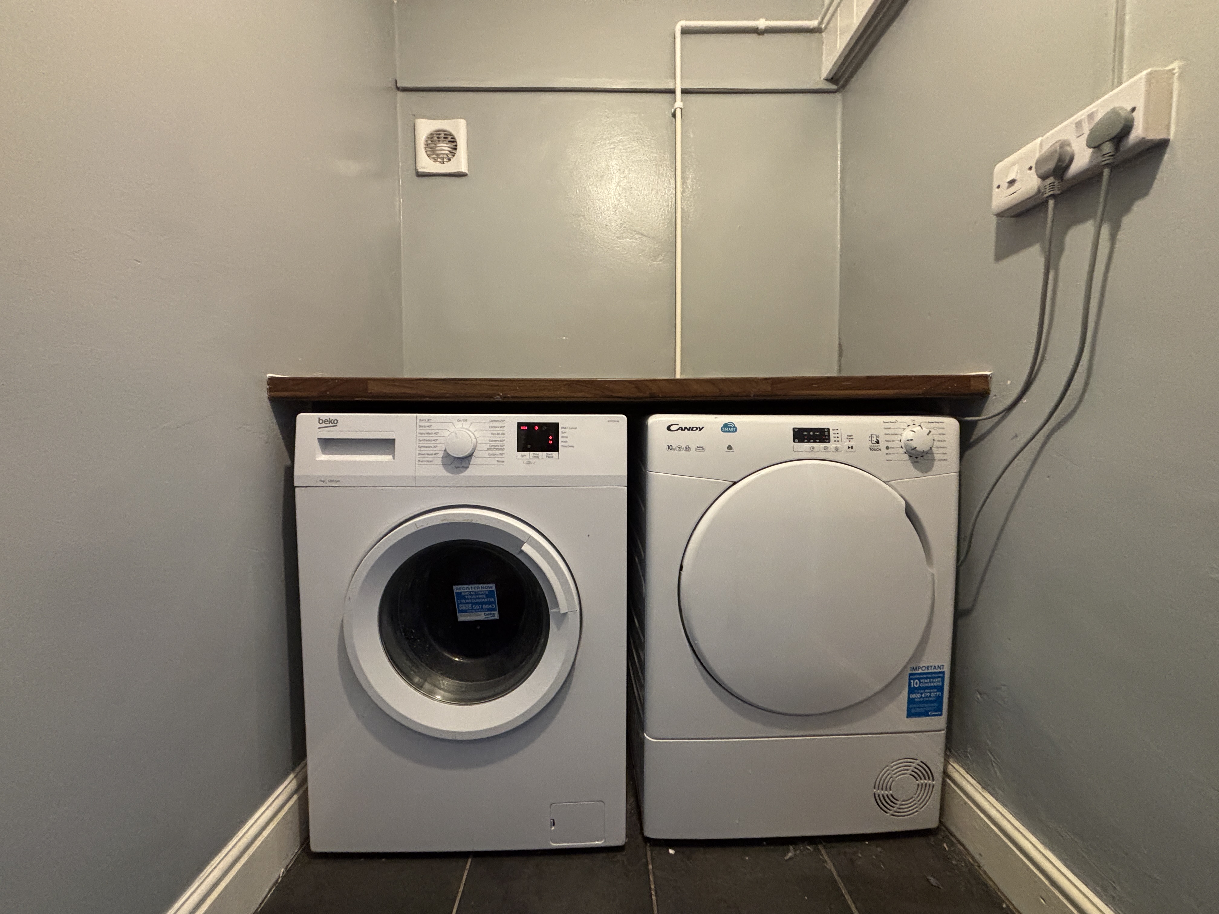 A continuation of the tiled flooring, smooth walls and a smooth ceiling. A wood effect worktop with space/plumbing beneath for a washing machine and tumble dryer.
