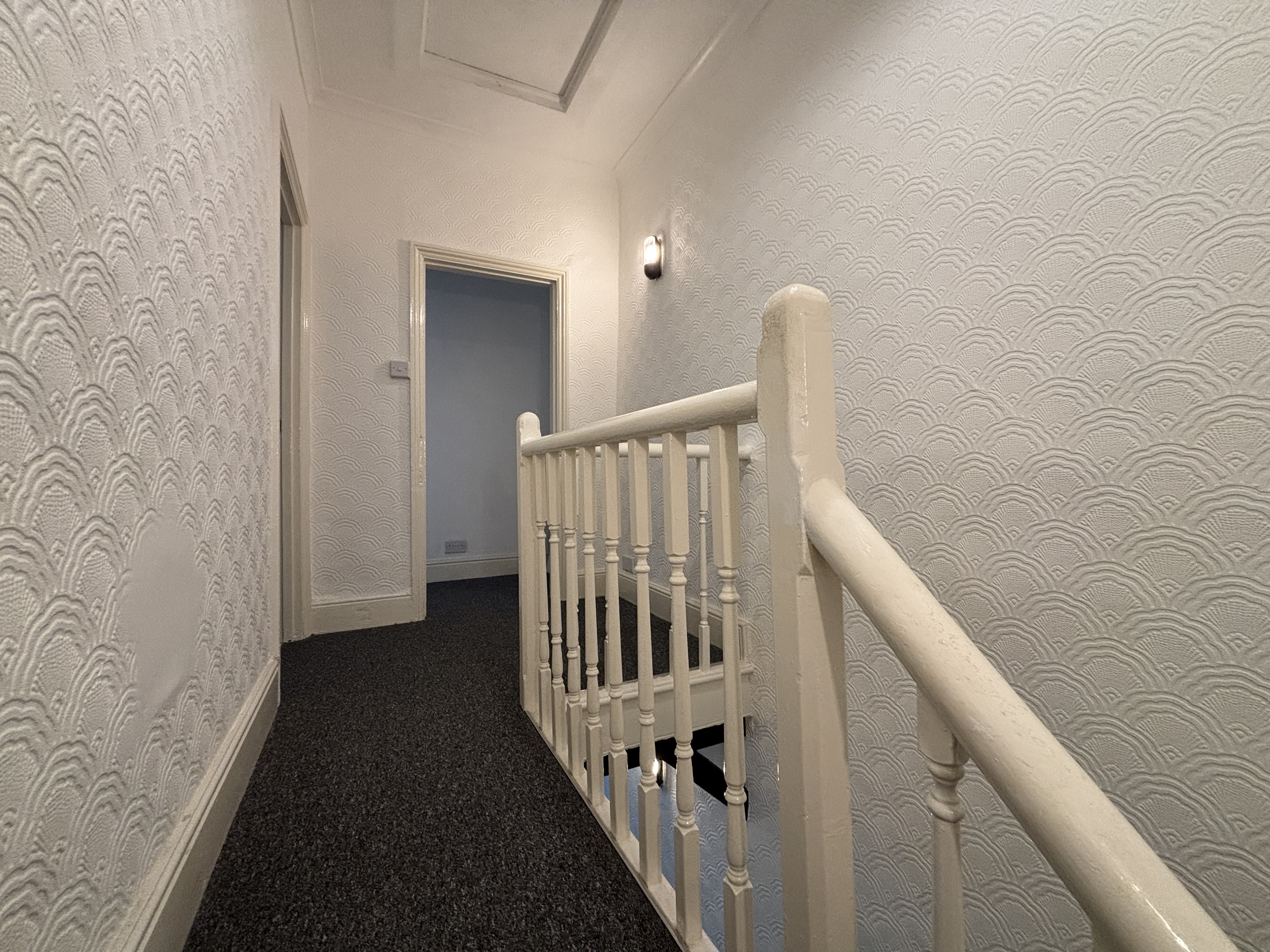 A carpeted staircase leads to a carpeted landing with wallpapered walls and a textured coved ceiling. Loft access. Doors lead off to three bedrooms and a bathroom.
