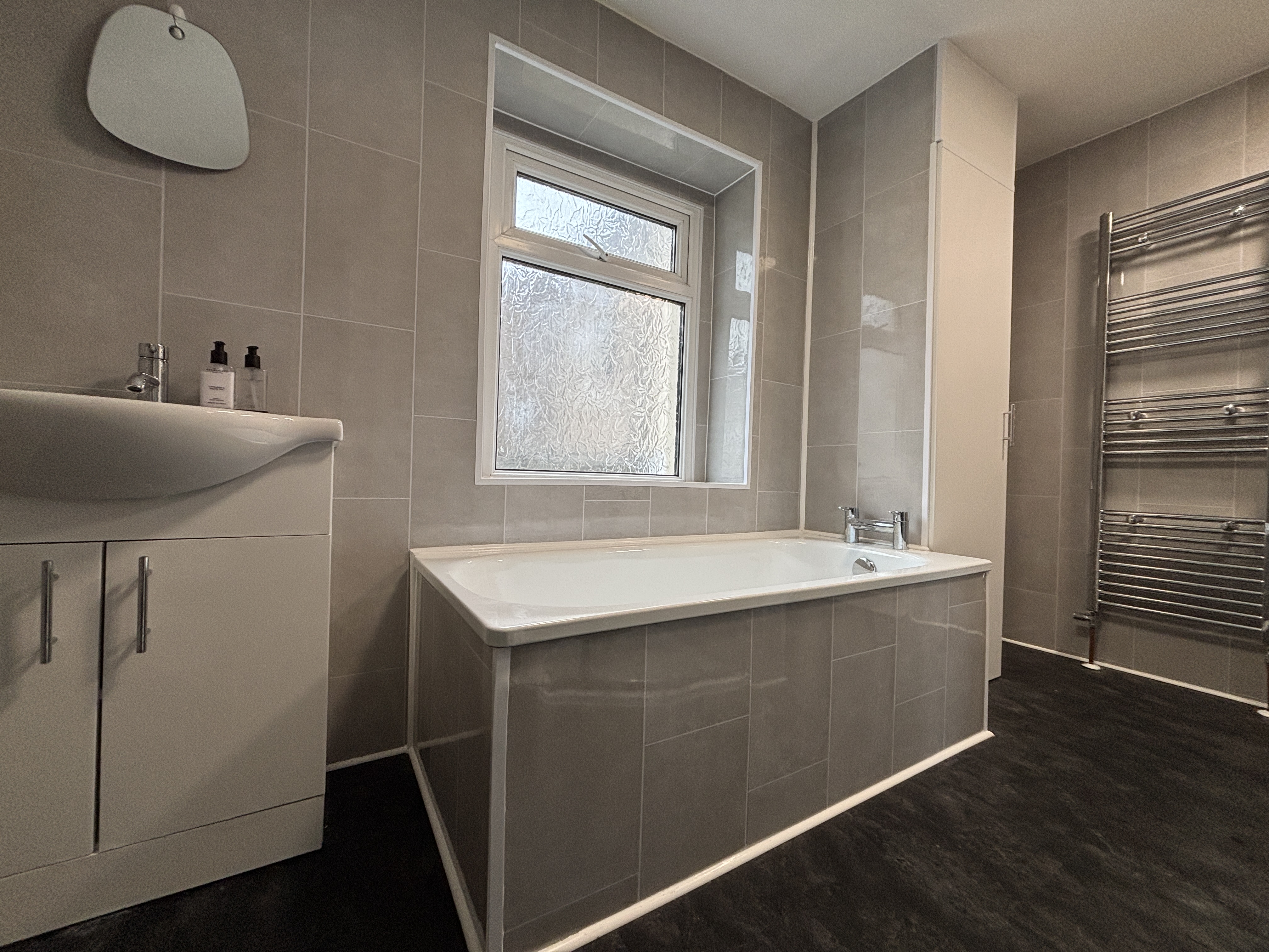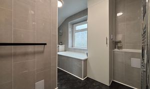 Vinyl flooring, full height tiling to the walls and a smooth ceiling. A four piece white suite comprising a WC with a push button flush, a vanity washbasin with a stainless steel mixer tap overtop, a white bath with a stainless steel mixer tap overtop and a walk-in shower cubicle with a stainless steel thermostatic shower inset and a glass sliding shower screen. A cupboard housing the combi boiler, a chrome towel rail and a side aspect opaque window.