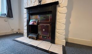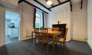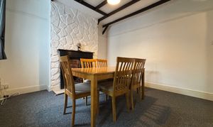 Carpeted with smooth walls and a papered ceiling. A carpeted staircase leads to the first floor with storage space beneath. There is a feature stove on a tiled hearth, a radiator and a rear aspect window. Open to the kitchen.