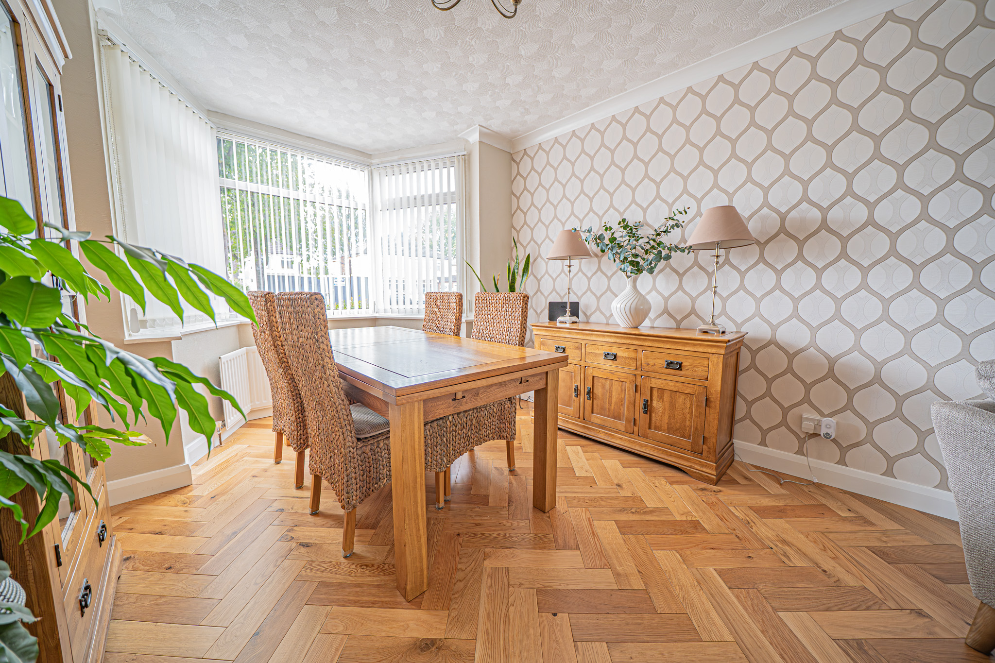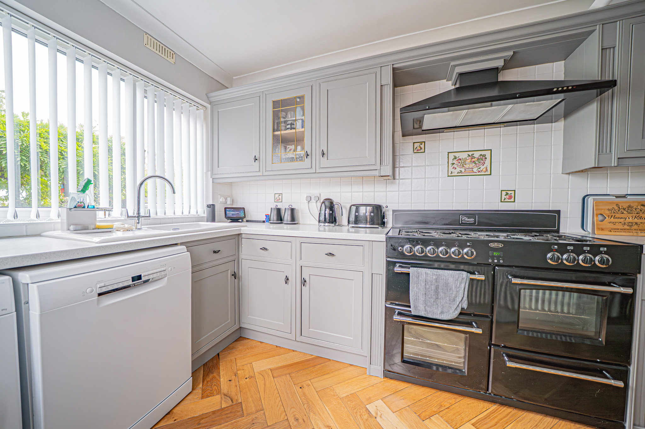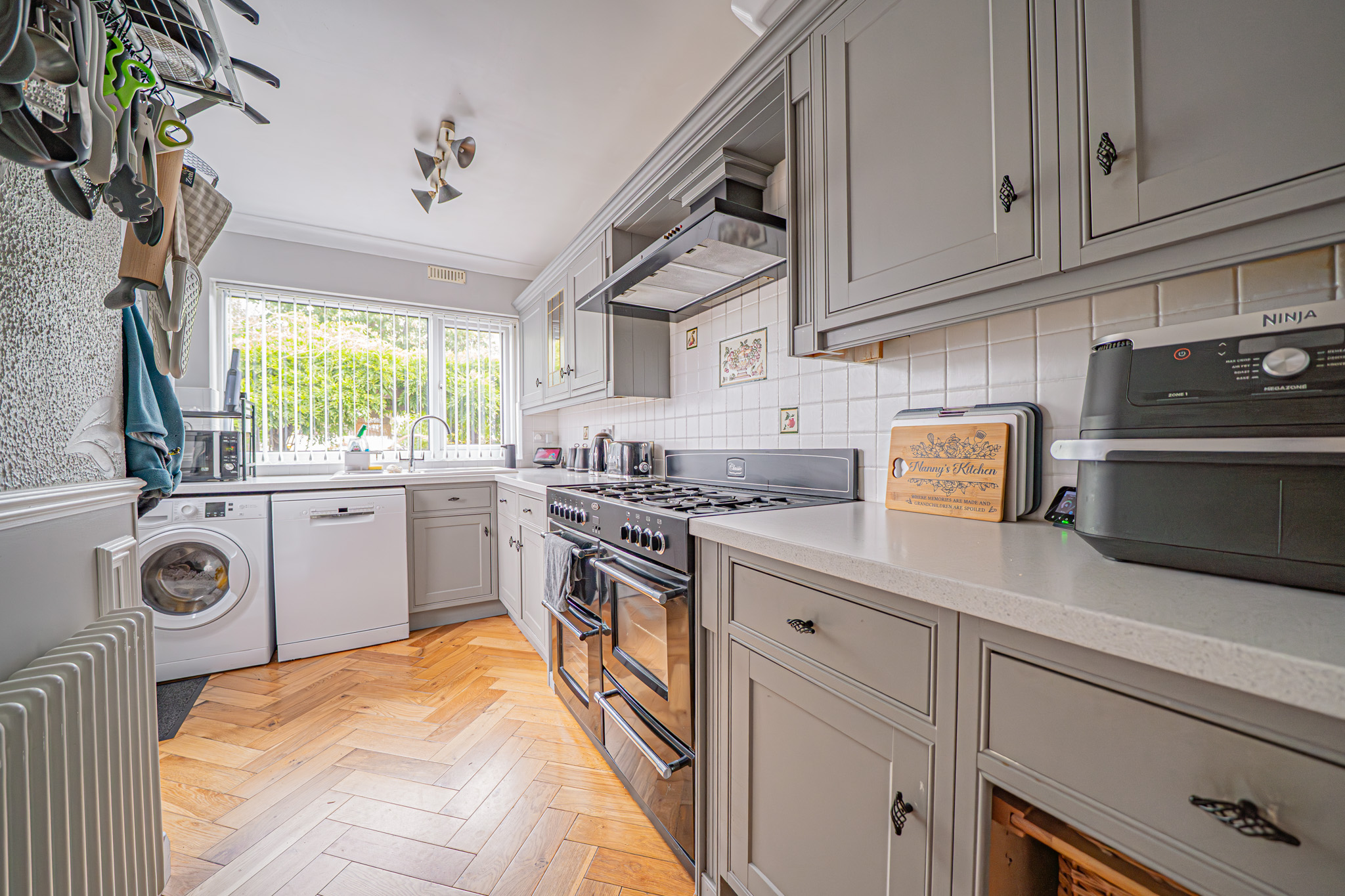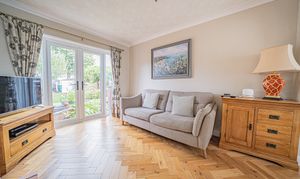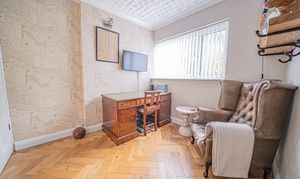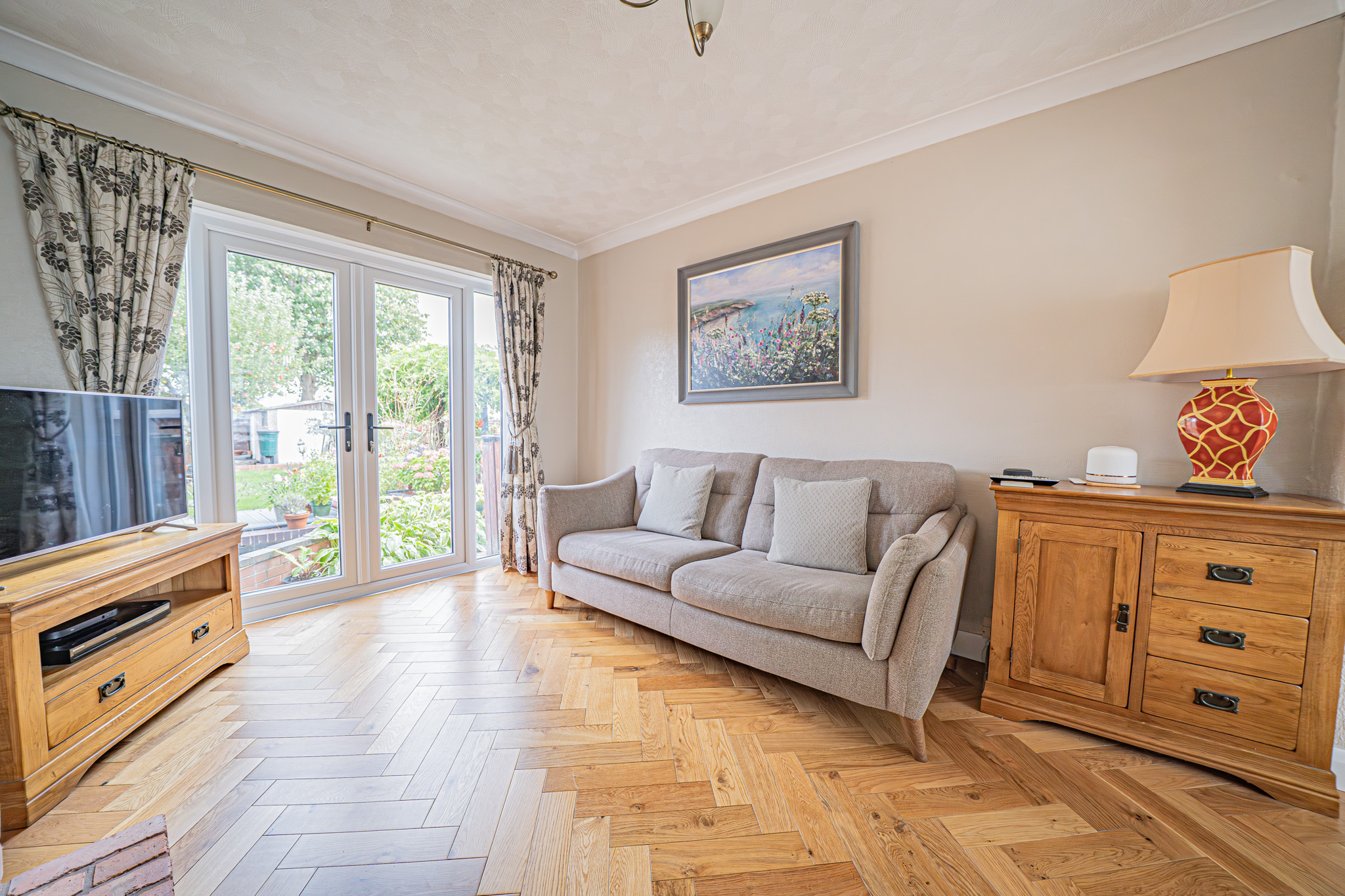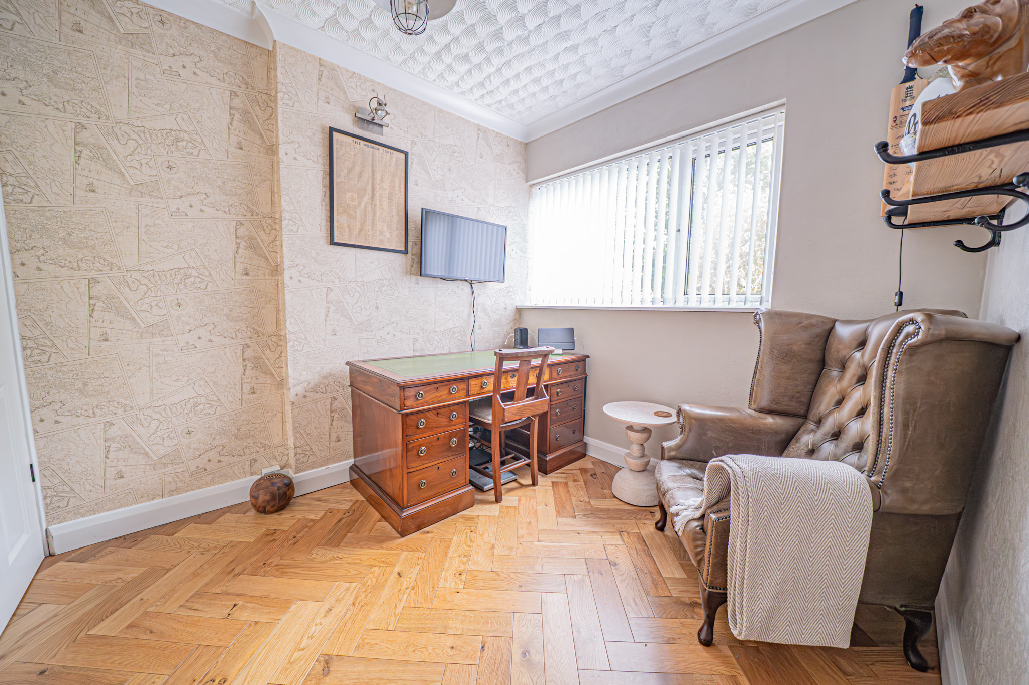 Upon entering the house, you are greeted by an entrance porch leading to a welcoming hallway. The large dual-aspect living room floods with natural light, offering stunning views of the rear garden. Adjacent to the living room is a versatile dining room, currently serving as a home office. This room leads to a fitted kitchen with ample work surfaces and yet again, views of the garden.