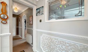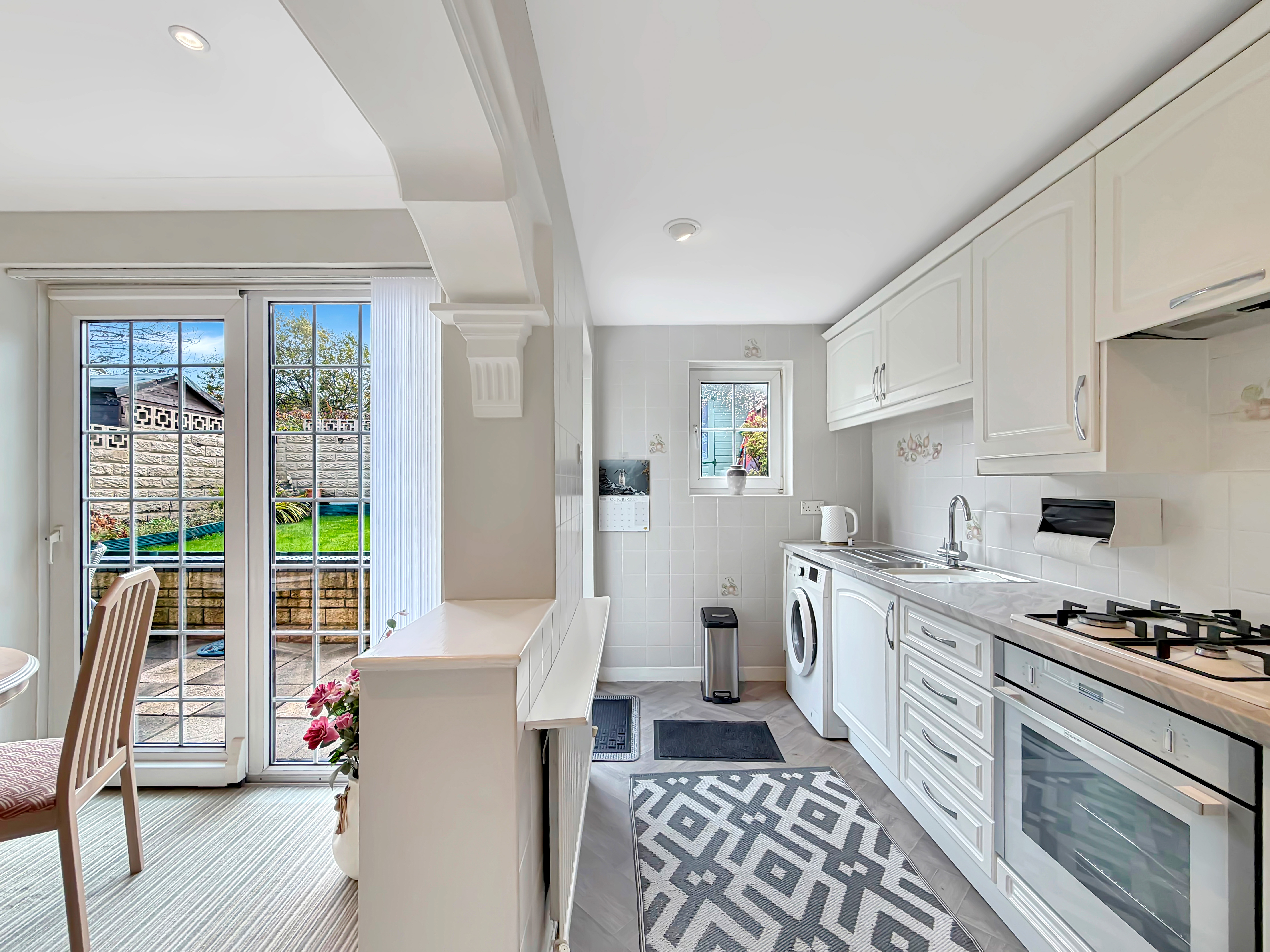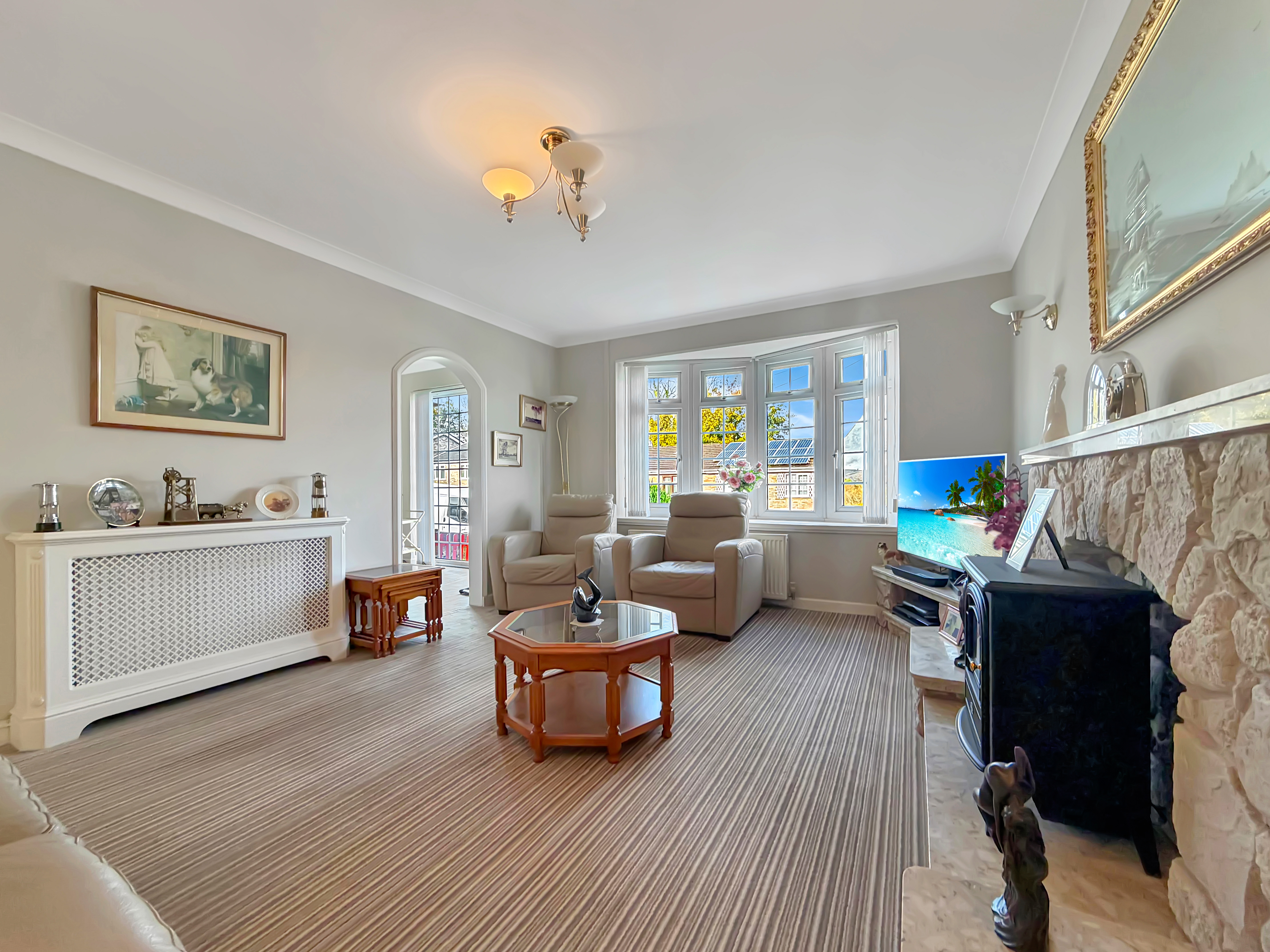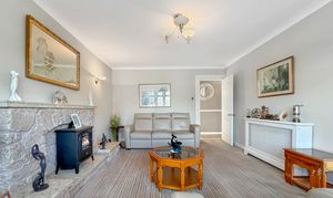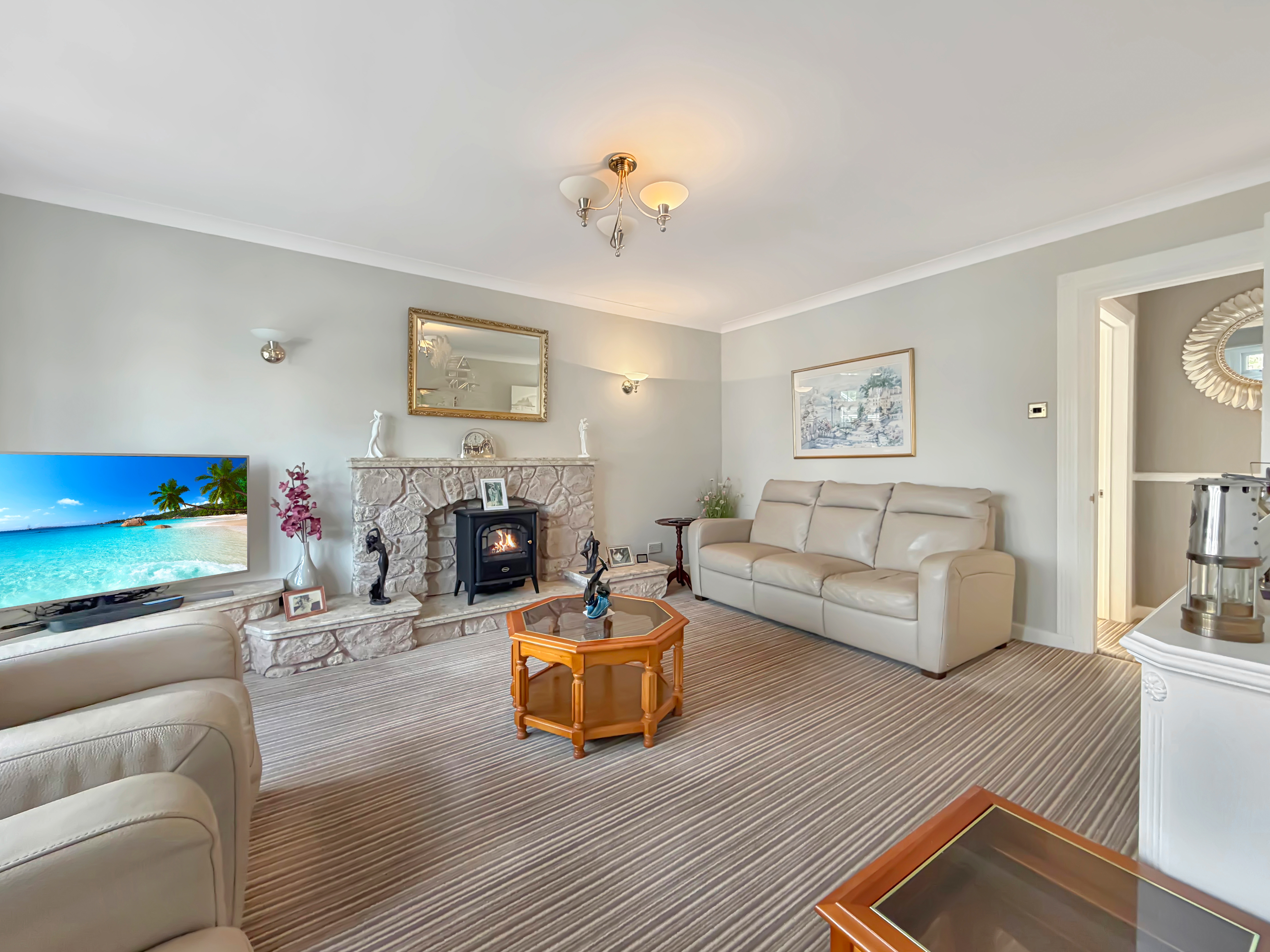 As you step through the front door, you are greeted by a generous lounge flooded with natural light from large windows, creating a warm and inviting ambience. A snug sitting room awaits, featuring sliding doors that open to the front garden, providing a cosy space to unwind and relax.