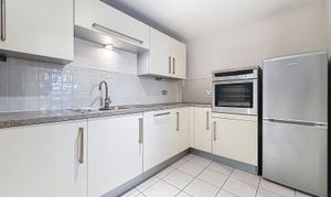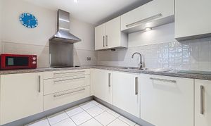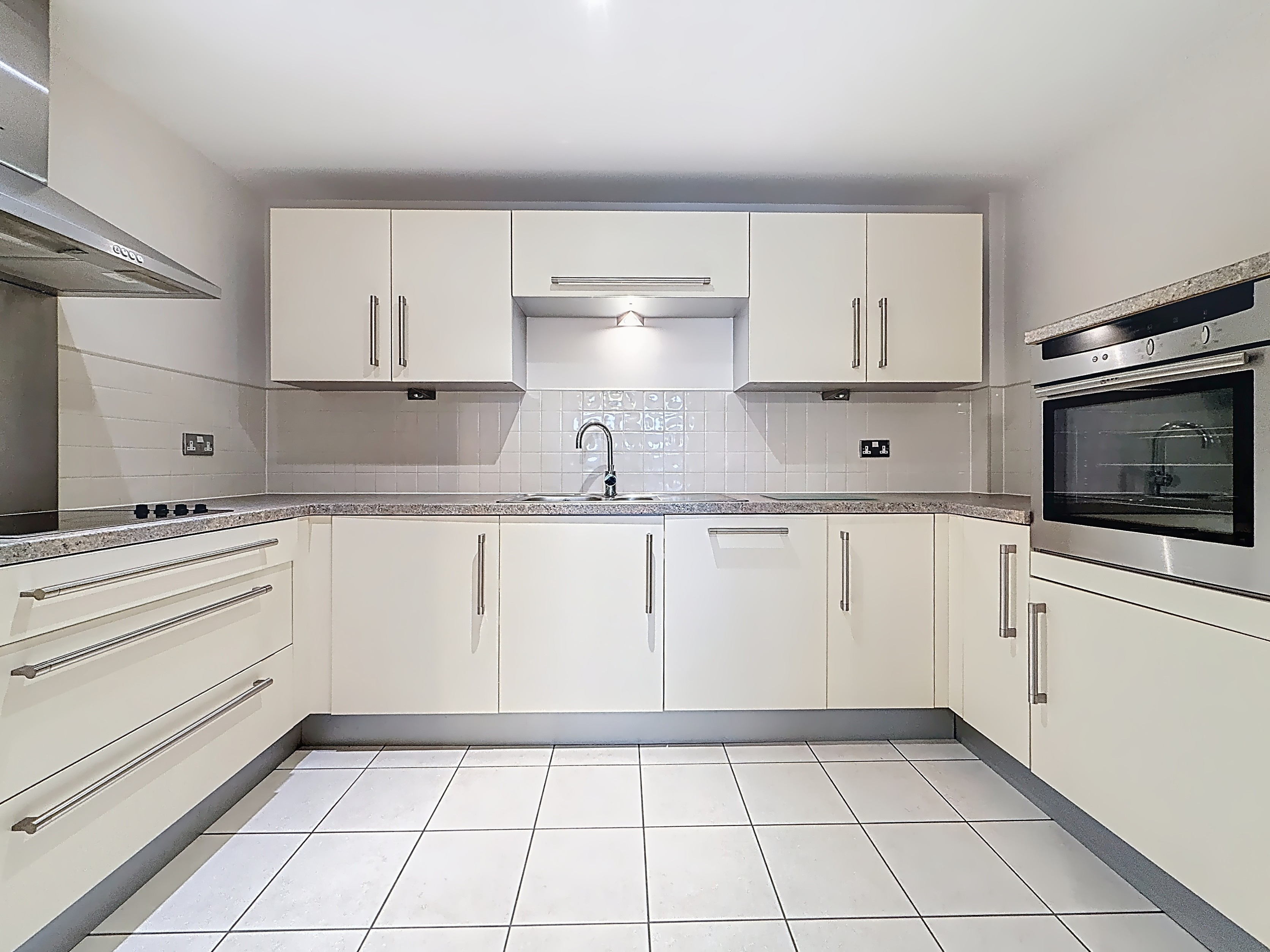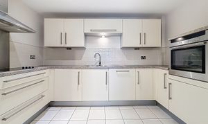 The contemporary kitchen is fitted with a range of sleek wall and base units complemented by integrated appliances. Designed with practicality in mind, there is ample worktop space and storage, making it a functional yet stylish environment for cooking and meal preparation.
