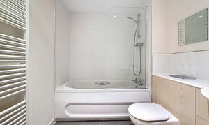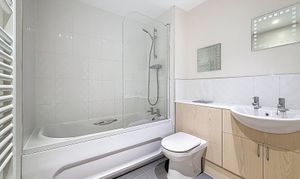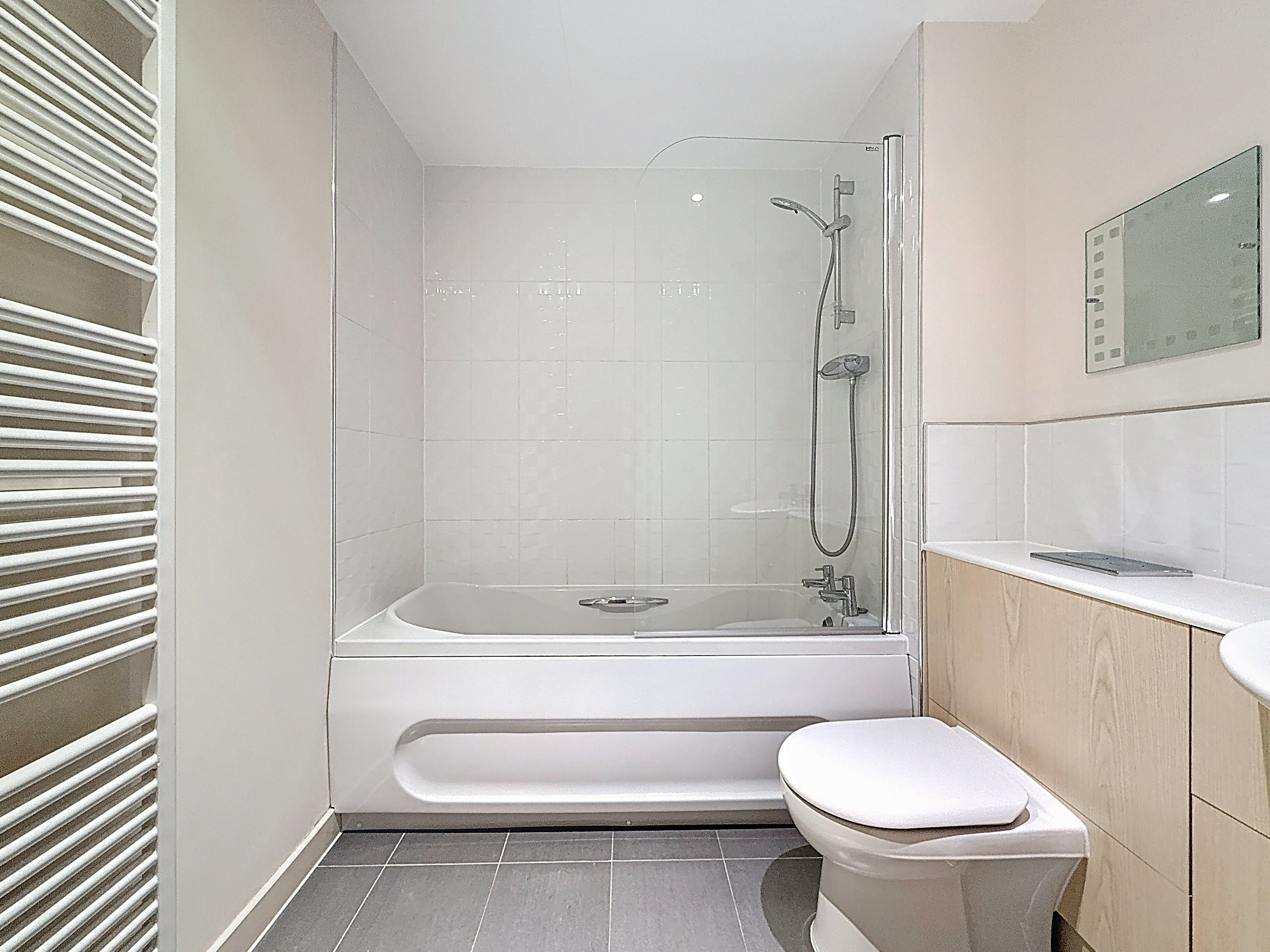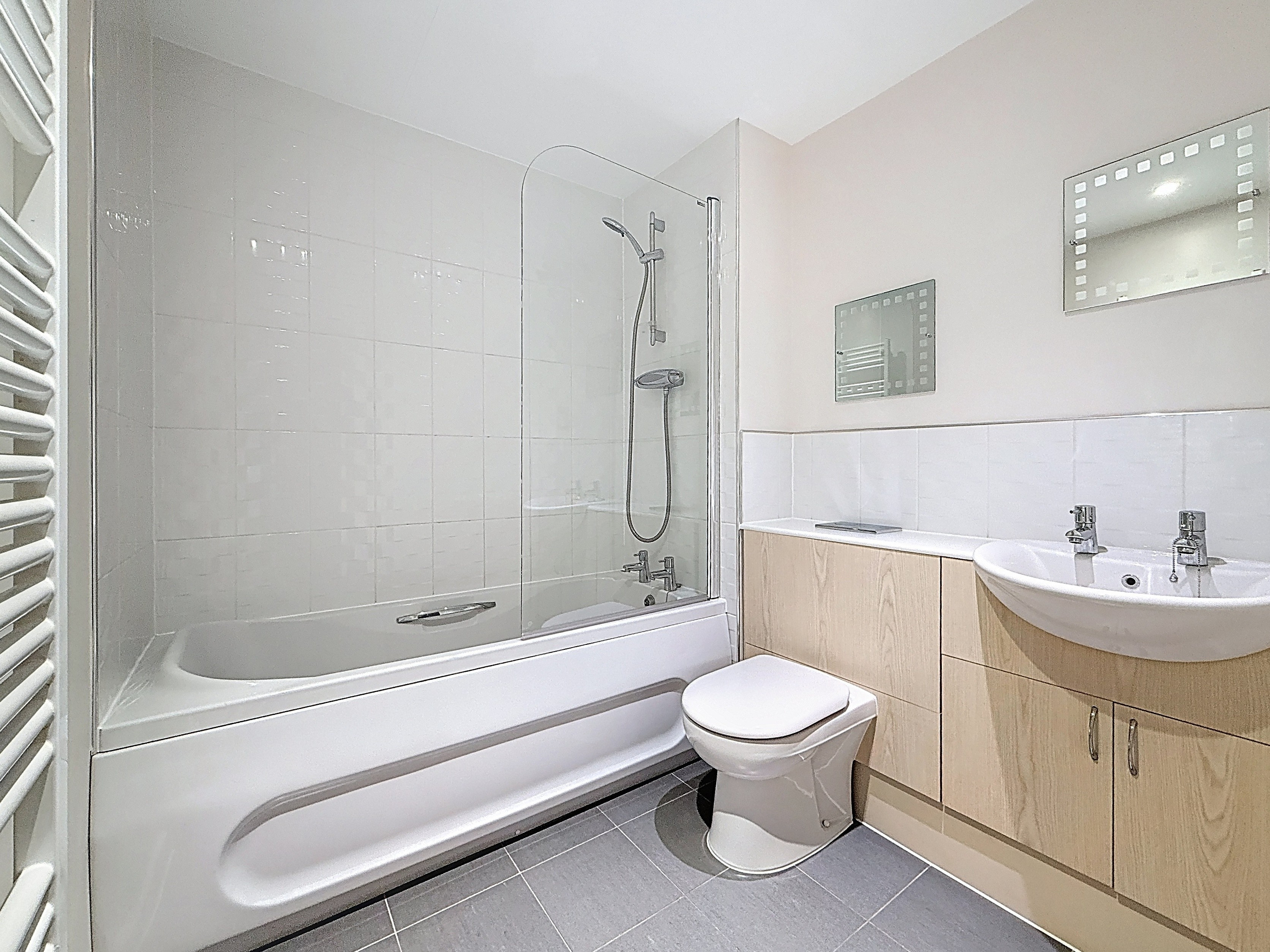 The main bathroom features a full-sized bath with shower over, contemporary tiling and vanity storage. Both spaces are well maintained and presented in neutral tones, ready for immediate occupation.