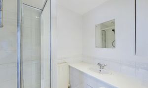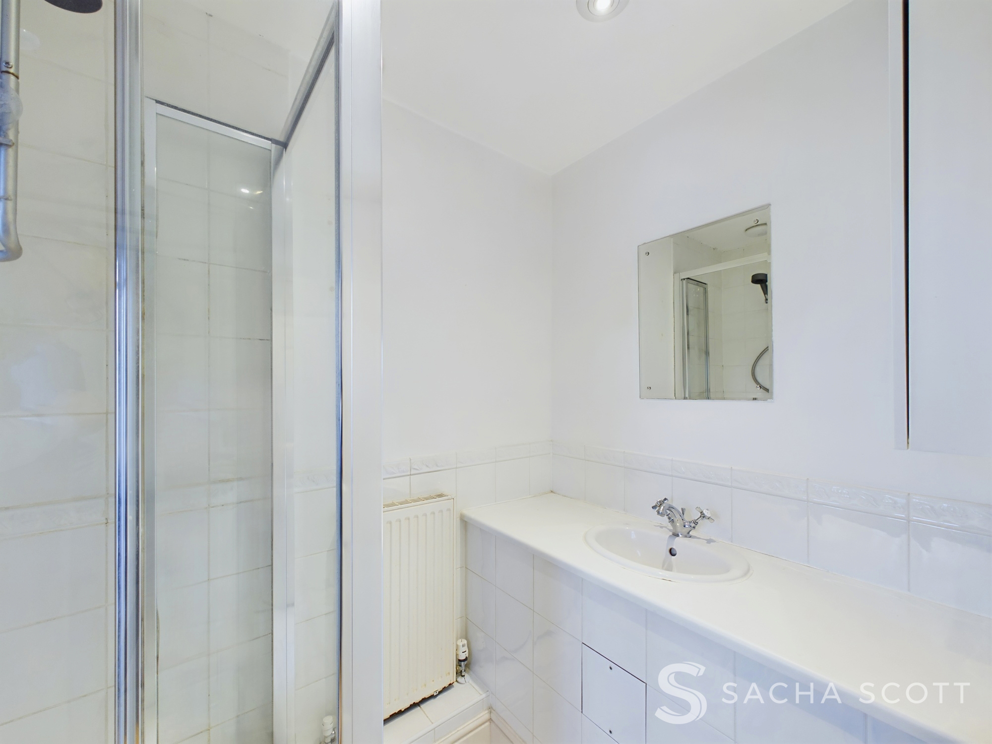 Offering a large shower enclosure, WC, and sink, the en-suite is part-tiled and neutral throughout.