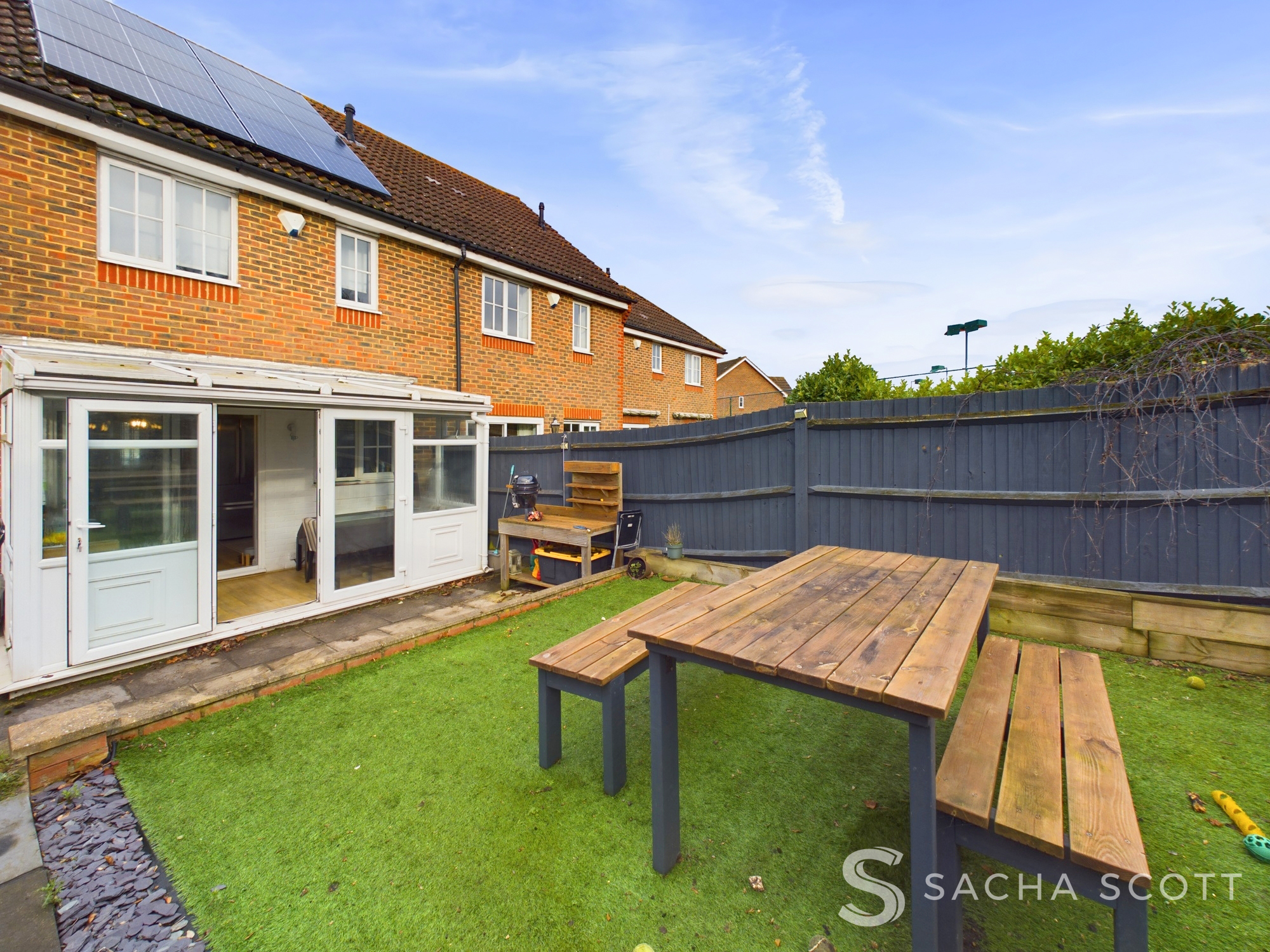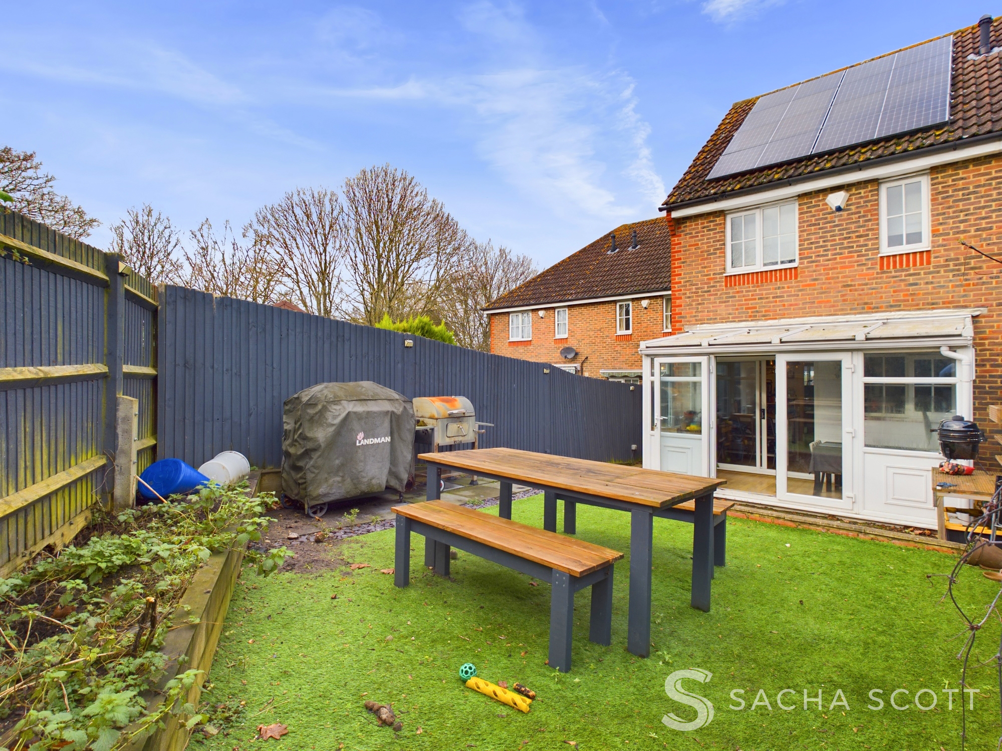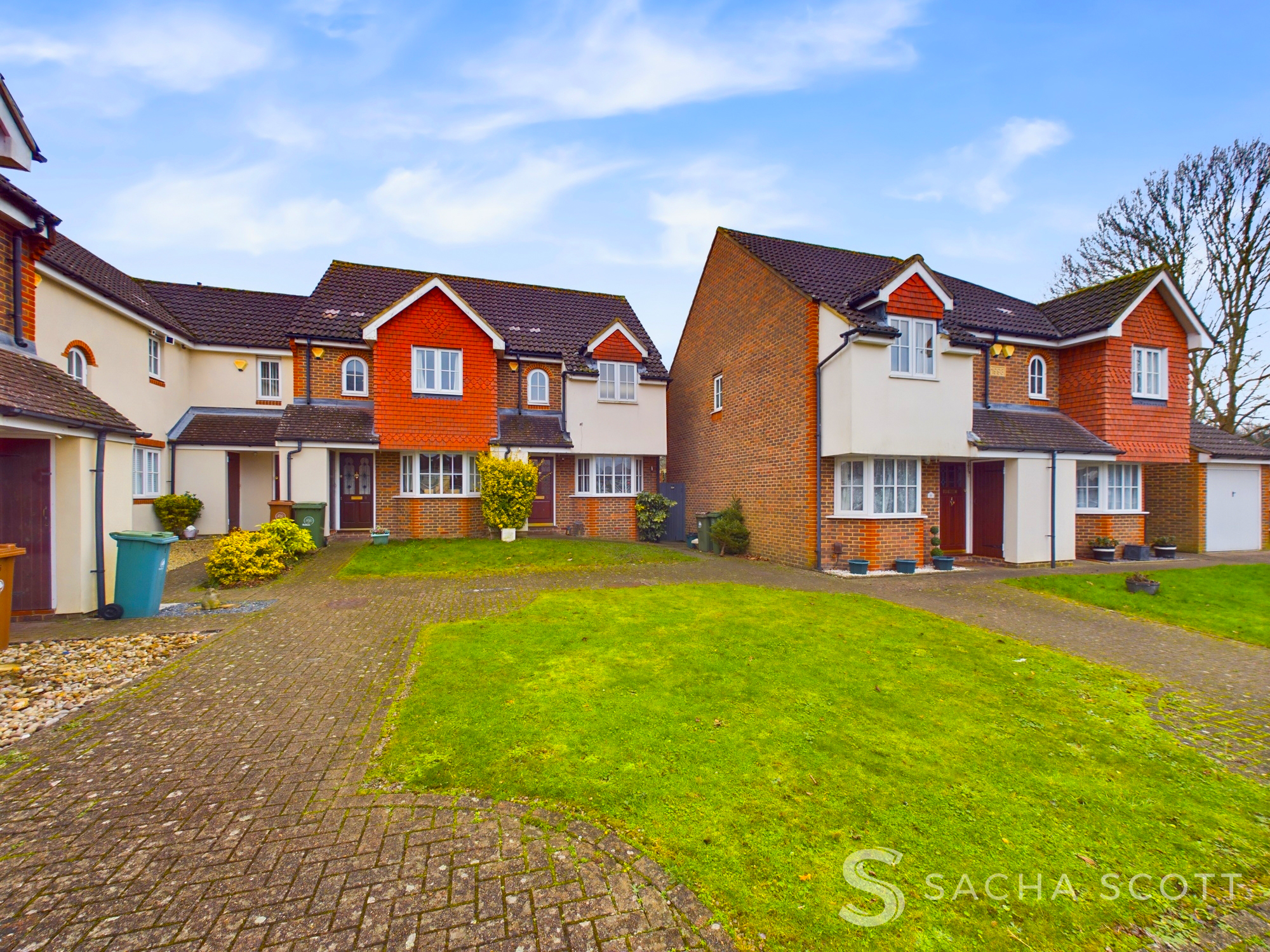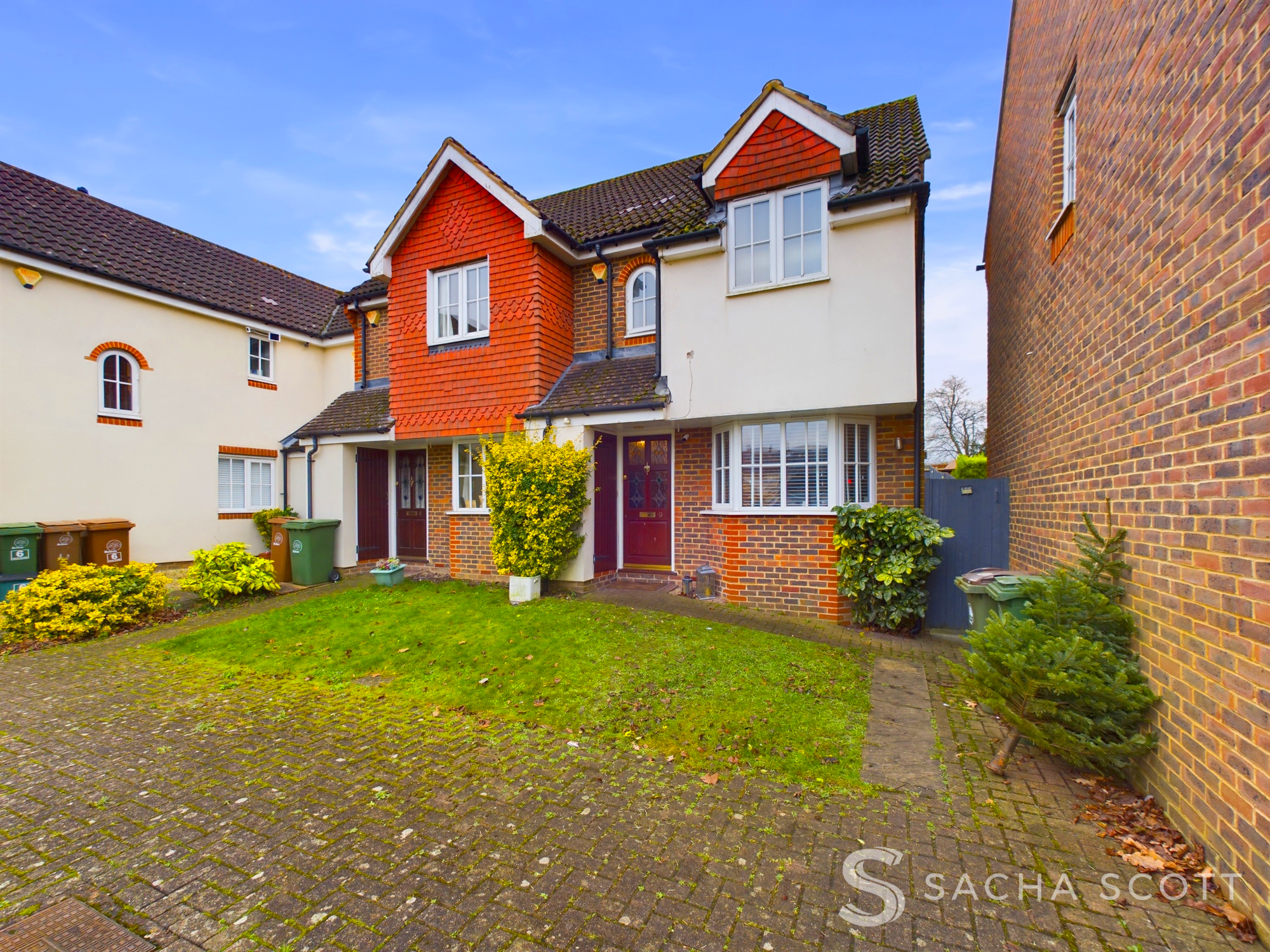 Offering a large living room, generous kitchen/diner and a conservatory to the ground floor, and two large double bedrooms and two bathrooms (one en-suite) to the first floor, this fabulous family home also benefits from an easy to maintain south-facing garden that overlooks Perretts Field, a community parkland that other neighbours have accessed via gate from their gardens. To the front, this lovely home is set back from the closes private small car park behind a lawned and paved area.