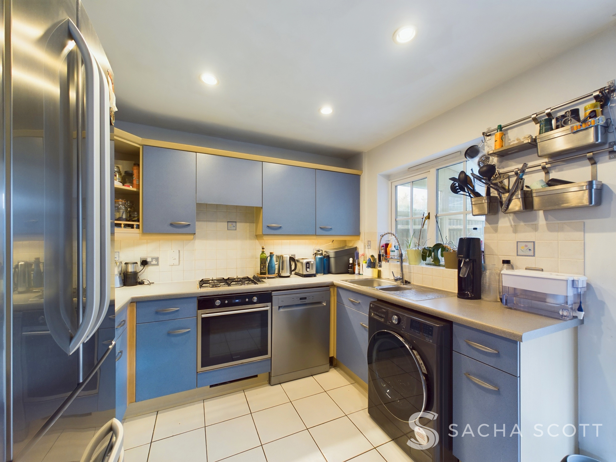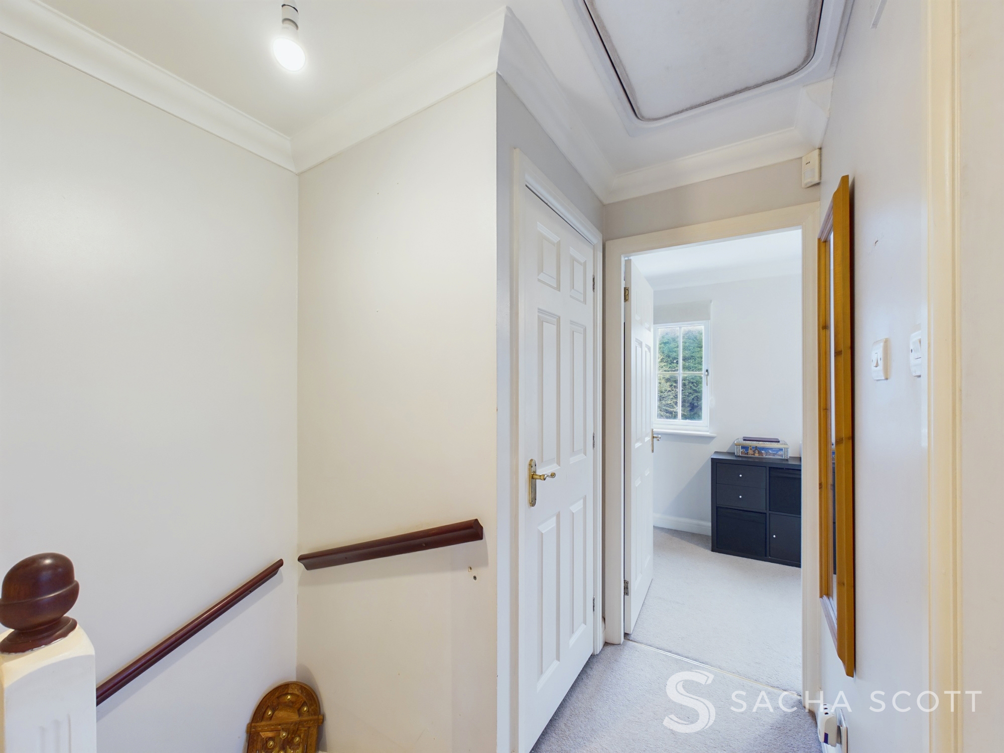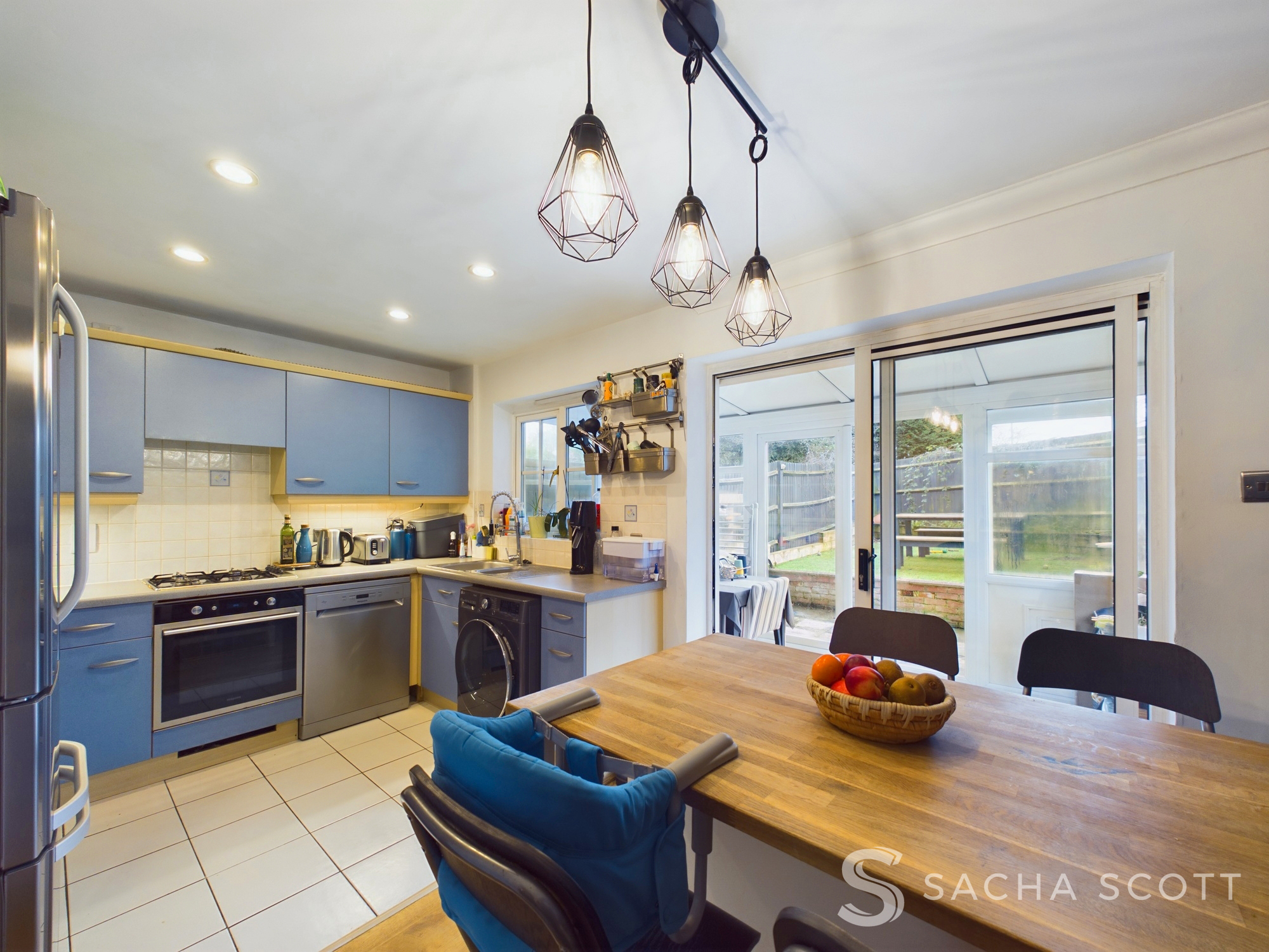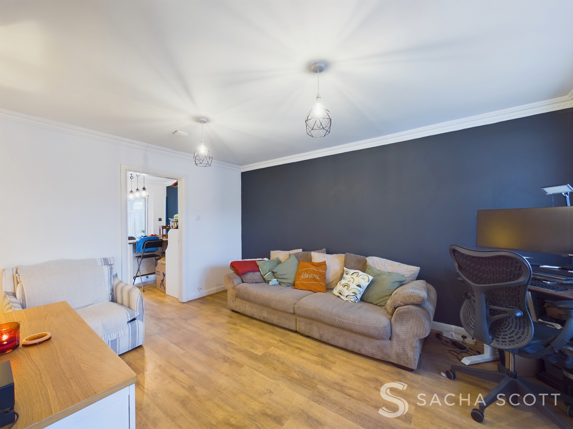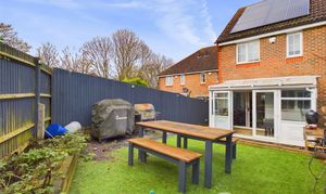 Offering a large living room, generous kitchen/diner and a conservatory to the ground floor, and two large double bedrooms and two bathrooms (one en-suite) to the first floor, this fabulous family home also benefits from an easy to maintain south-facing garden that overlooks Perretts Field, a community parkland that other neighbours have accessed via gate from their gardens. To the front, this lovely home is set back from the closes private small car park behind a lawned and paved area.