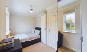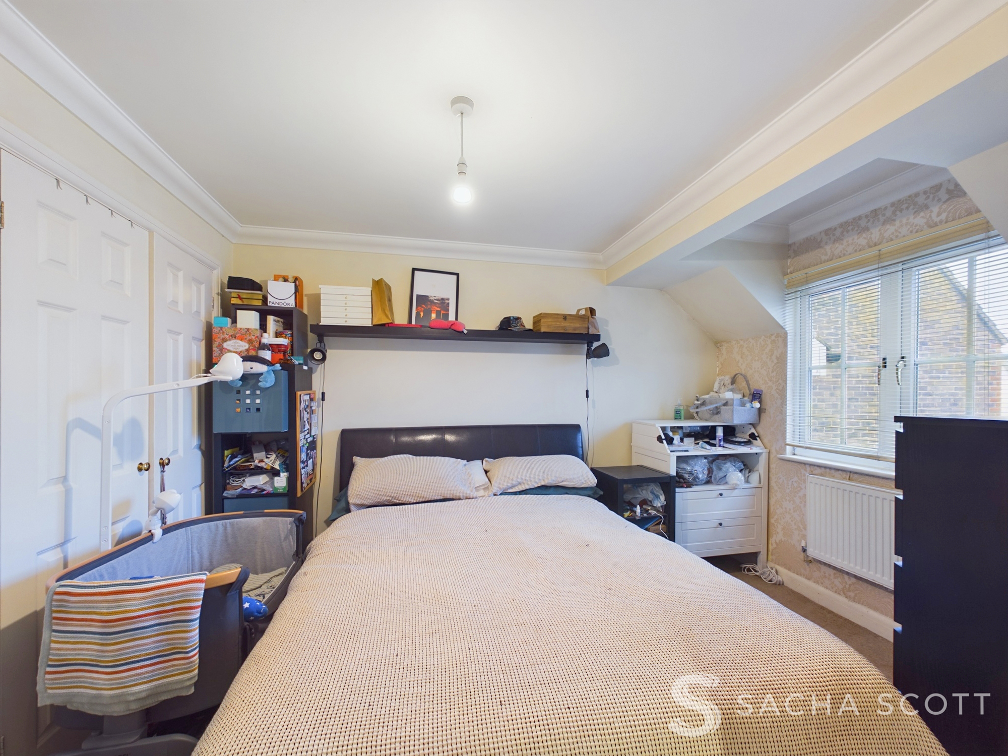 Neutrally presented and generous in size, the primary bedroom benefits from fitted wardrobes, views over the quiet close and an en-suite bathroom.