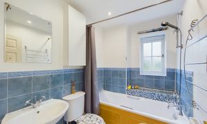 Part-tiled, the family bathroom offers a shower over bath, sink and WC.