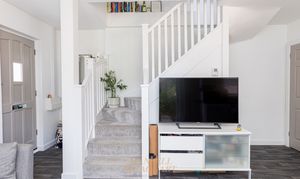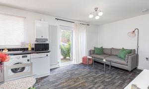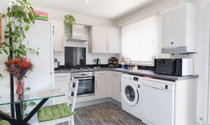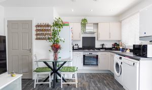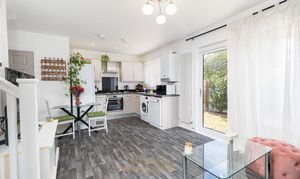 Upon approach to the property, you will see the treelined boarder of the garden, and around to the side porch access. Here there is space for shoes and coats, with access to the open plan living space. Here there is a tastefully designed kitchen with stylish wall and base units, fitted and freestanding appliances and ample work surfaces. There is also space for a small dining table, family sofas and freestanding appliances. Furthermore, the space benefits from a downstairs cloakroom, fitted storage and a window and sliding patio door to the garden.
