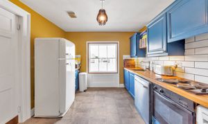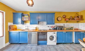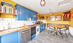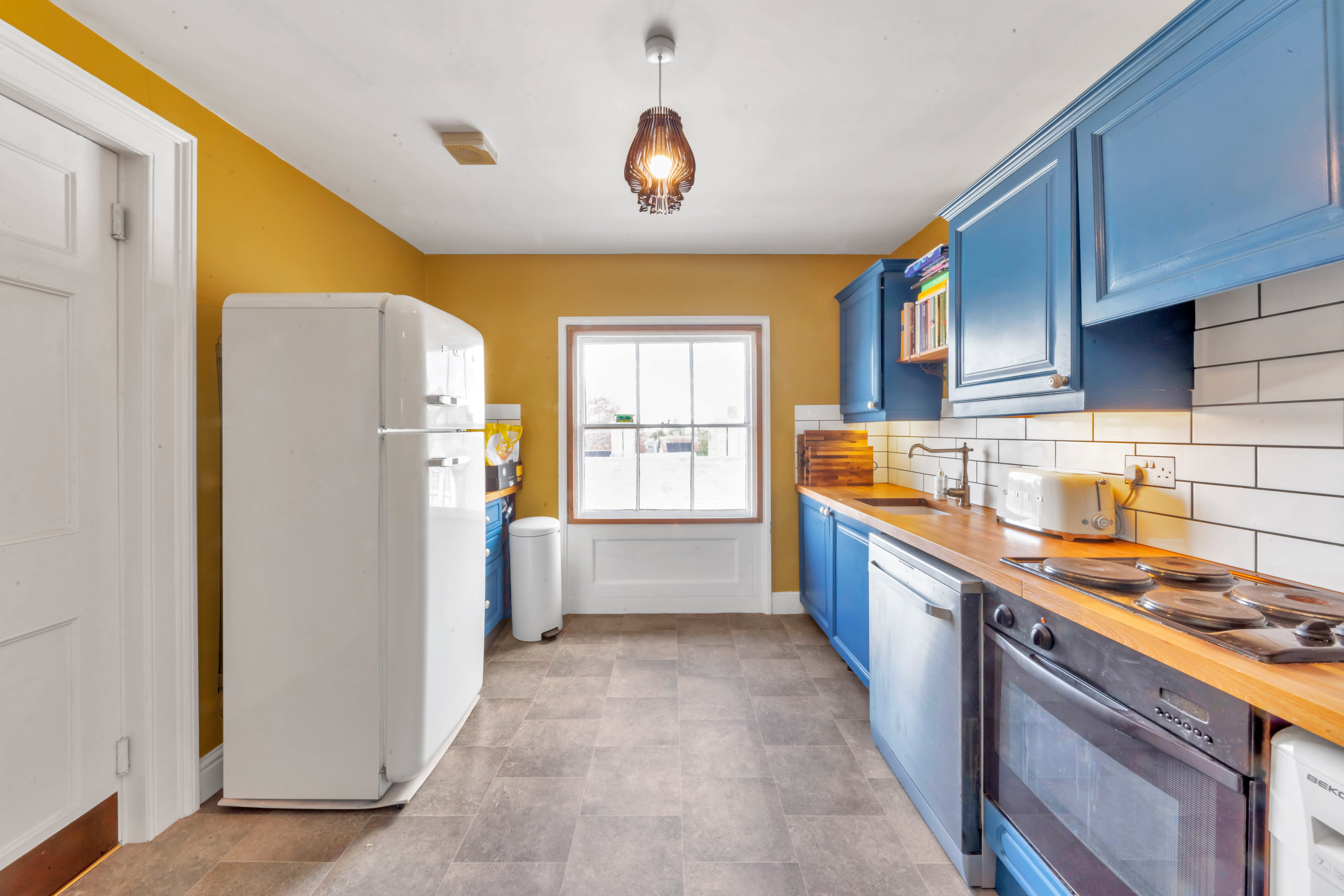The kitchen/dining room is an incredible size, with a beautiful sash window, a range of base and wall units, solid oak worktops, pendant lighting, tiled flooring and splashbacks, an integrated oven, hob and extractor fan, and space for a washing machine, fridge/freezer, dining setting and other kitchen appliances.