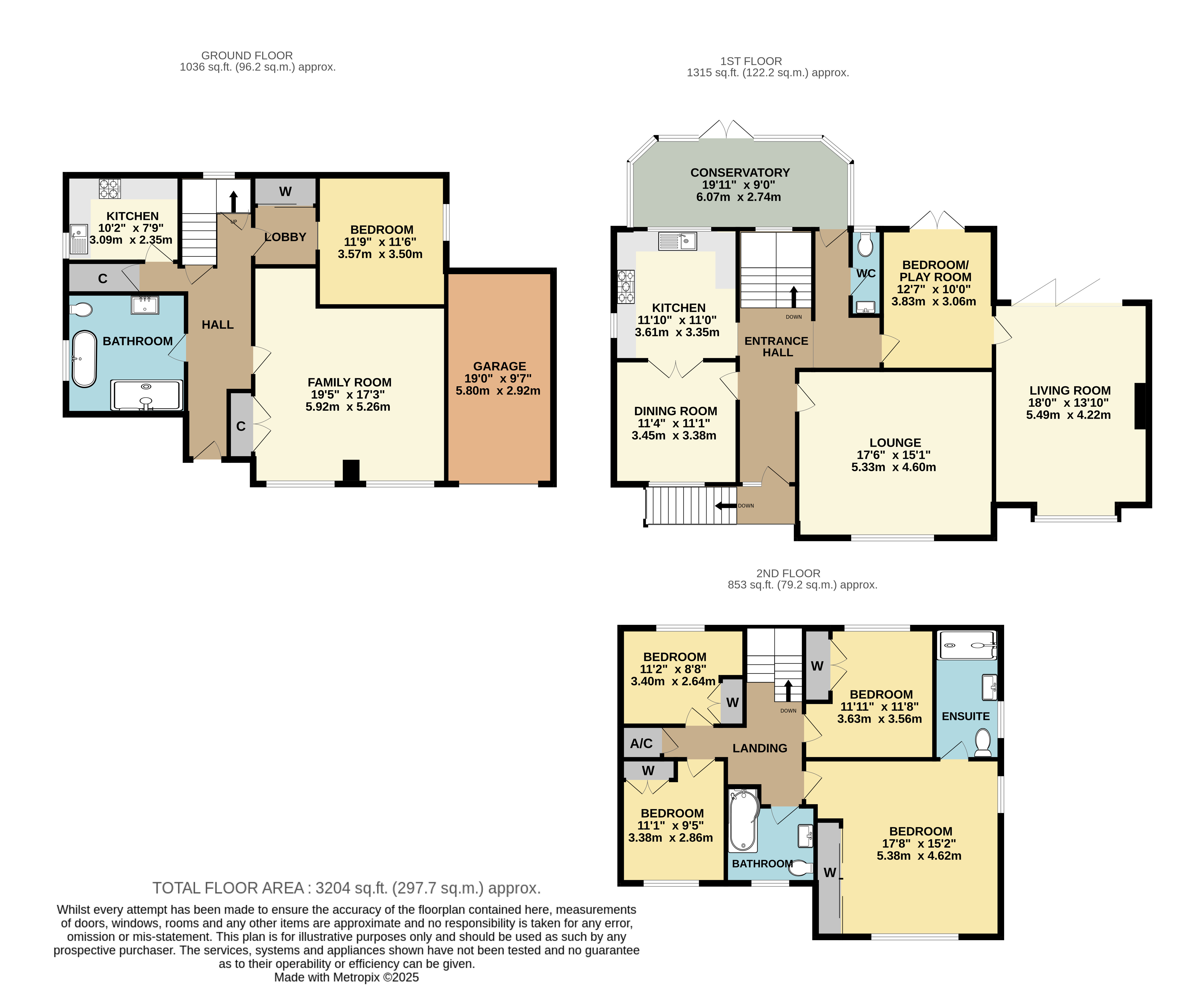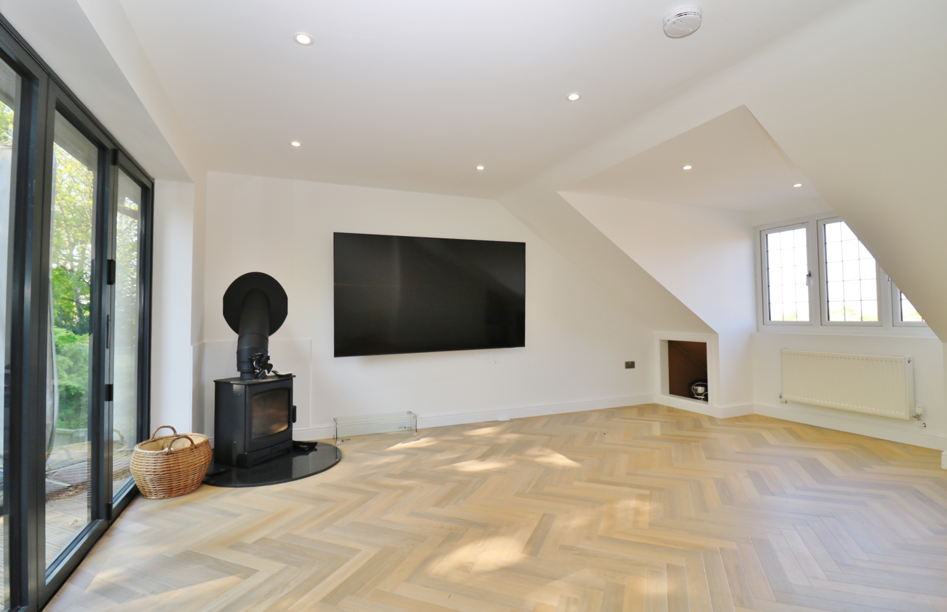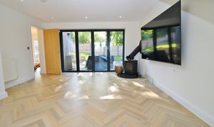 On the first floor there is a generous lounge, modern kitchen with adjoining dining room, living room with bi-folding doors to the garden, playroom/bedroom, conservatory and a WC.