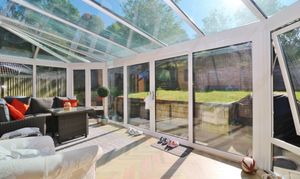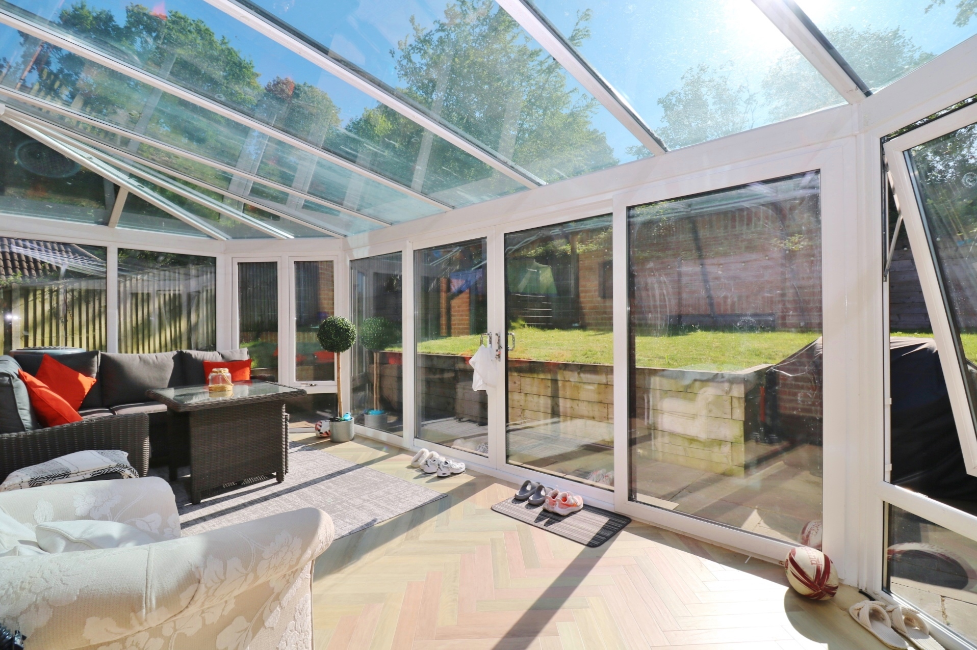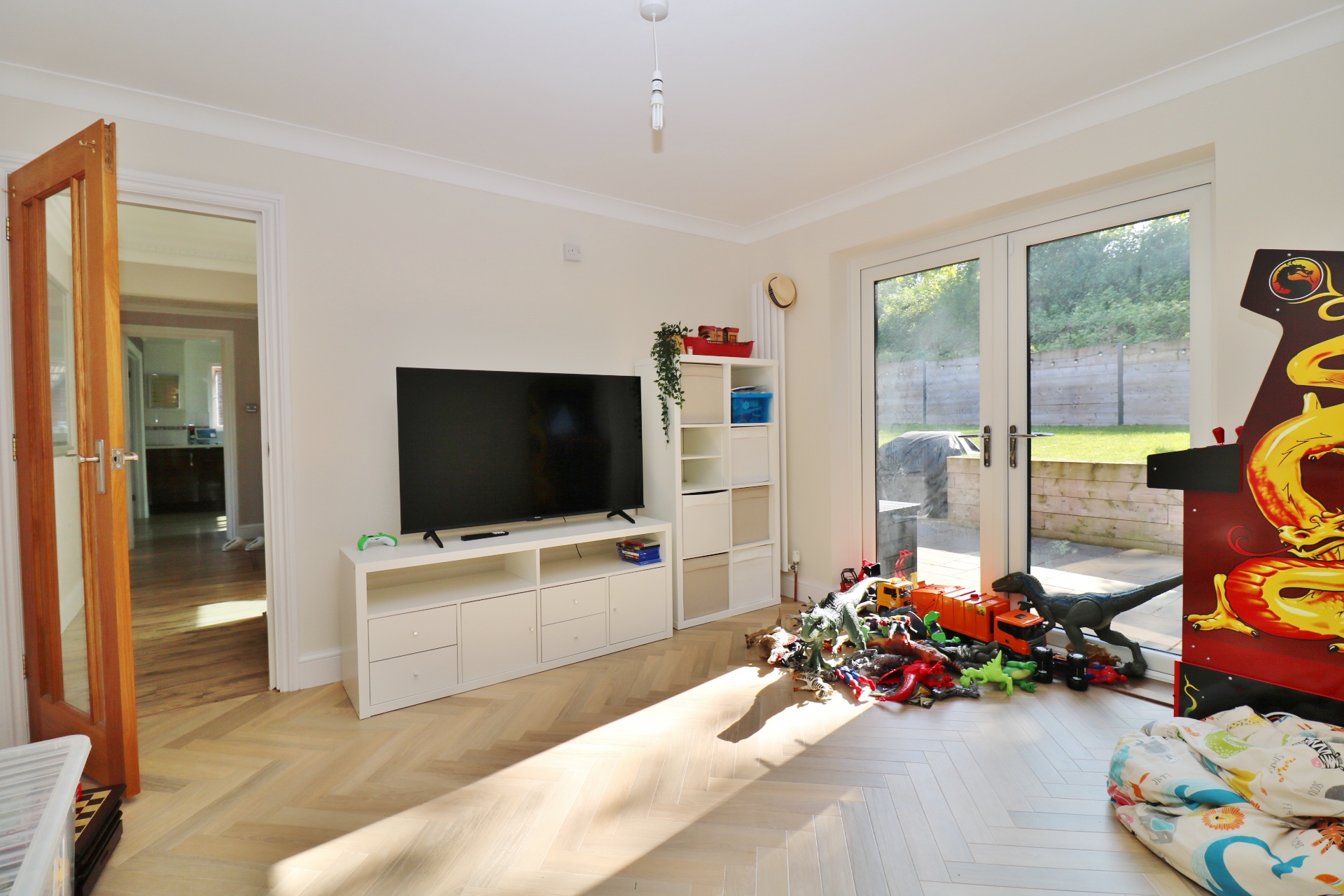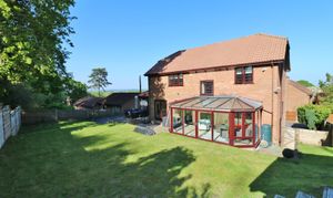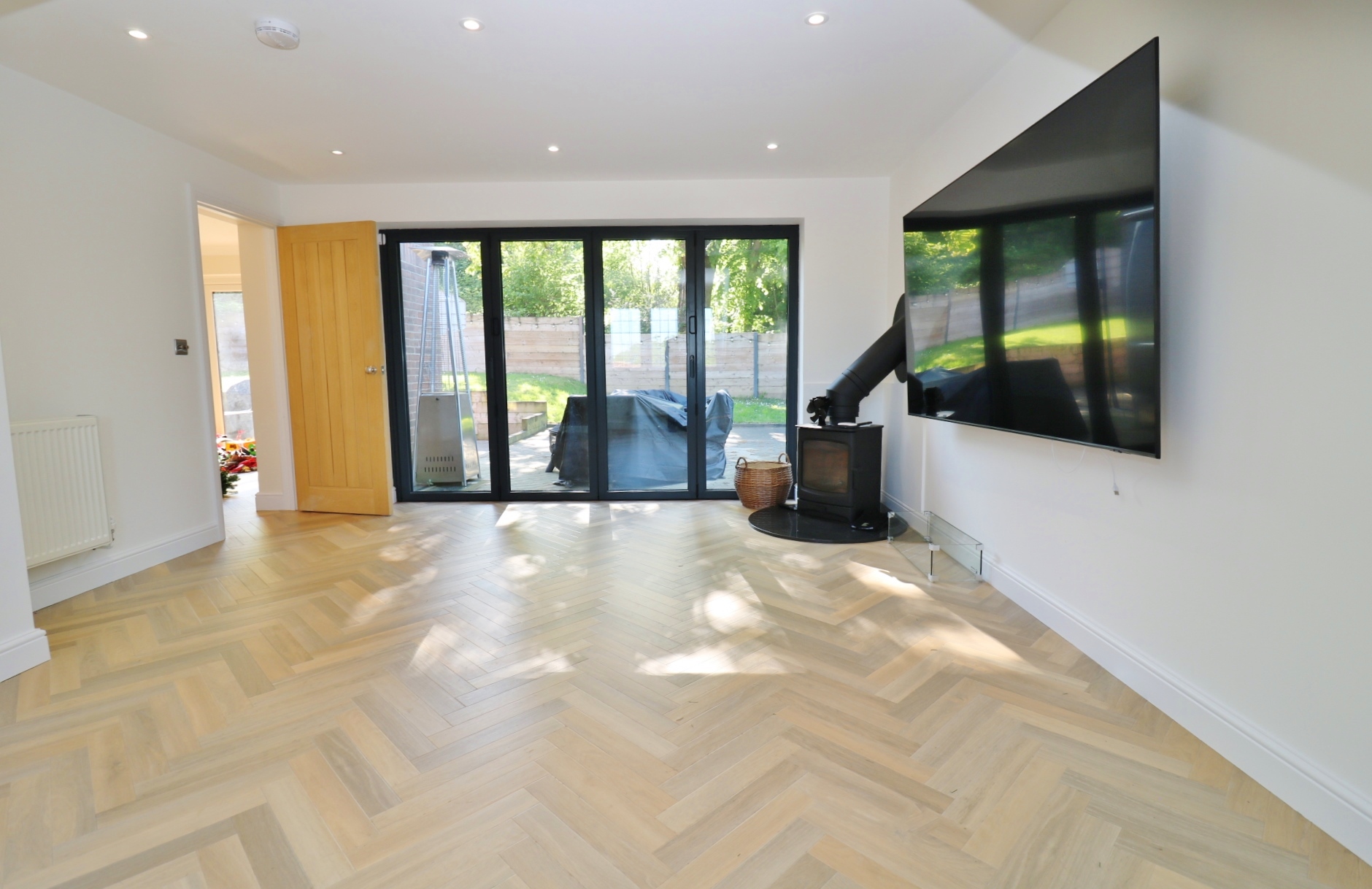 The generous lounge faces the front of the property, whilst the living room extension is a dual aspect room with a wood burner and bi-folding doors opening out to the rear garden. There is also a playroom/bedroom with French doors to the rear, a WC and a UPVC double glazed conservatory enjoying views of the garden.