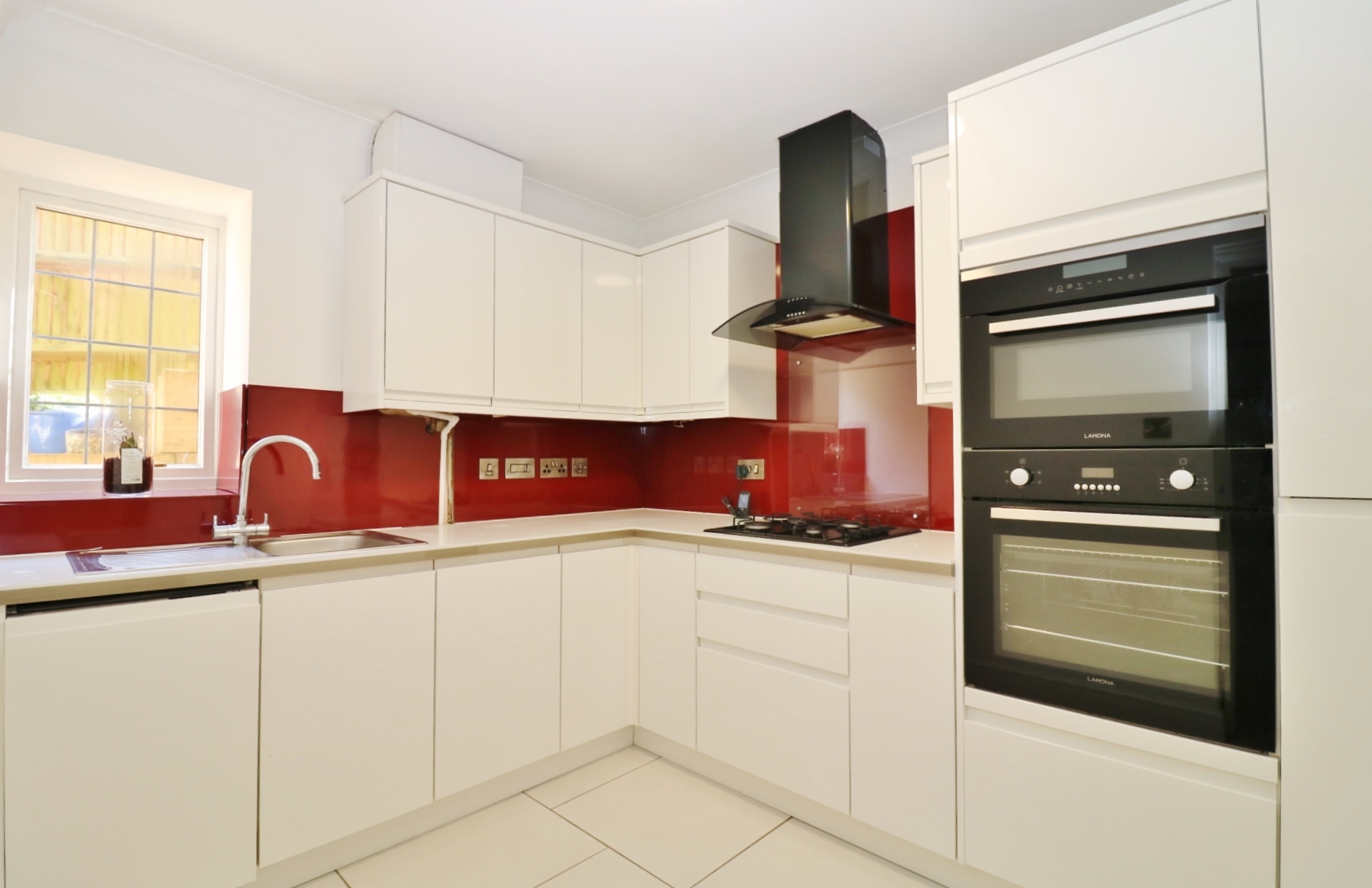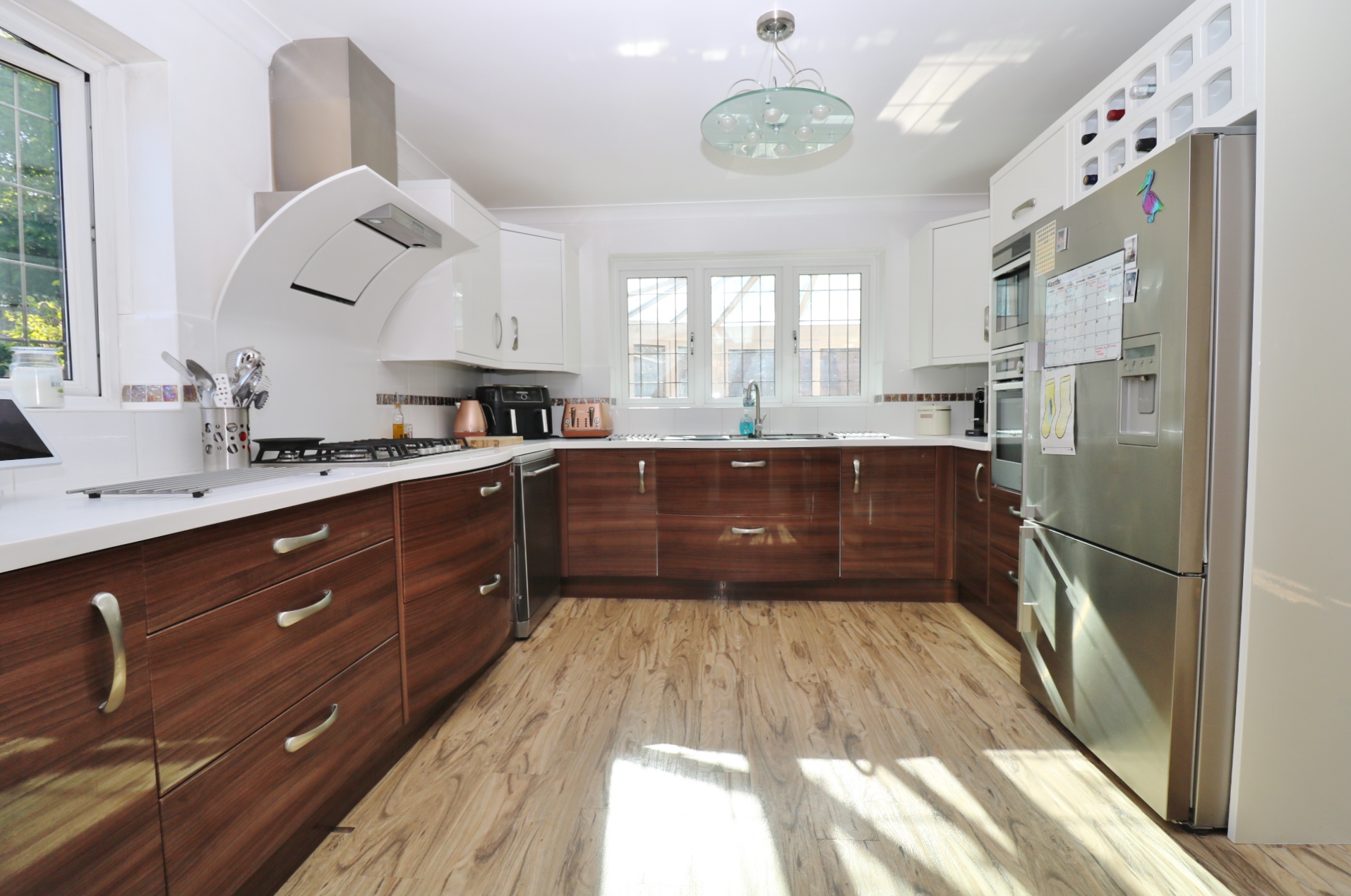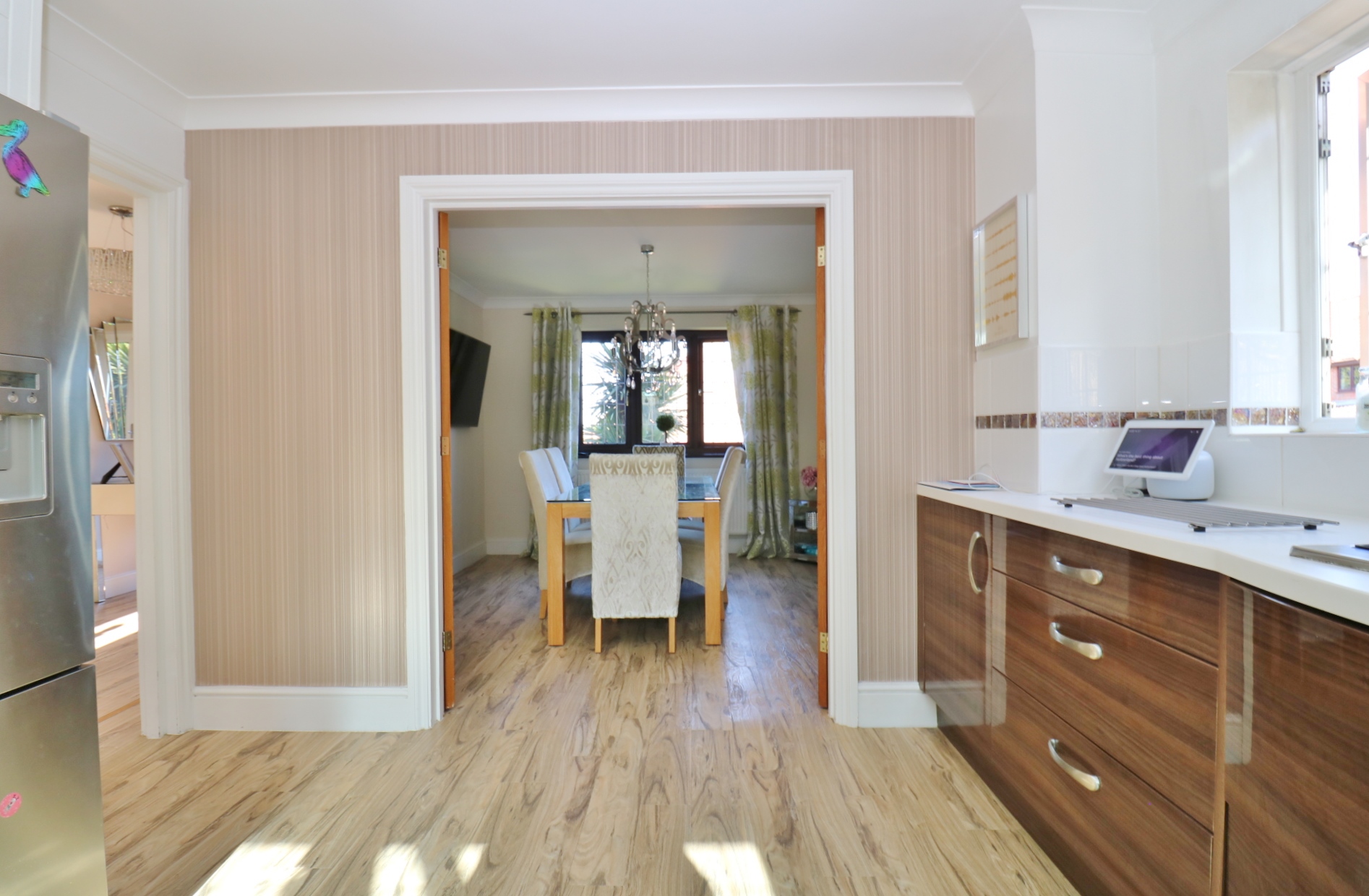 The main entrance is located on the first floor and is accessed via a set of steps to the front. The modern kitchen has been fitted with a range of wall and base units with a built-in double oven, gas hob with extractor over, space for an American style fridge/freezer and a dishwasher and features double doors leading through to the dining room.