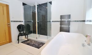 There is a double bedroom and a spacious, refitted bathroom comprising a free-standing bath, walk-in shower cubicle, vanity wash hand basin, WC and a heated towel rail.