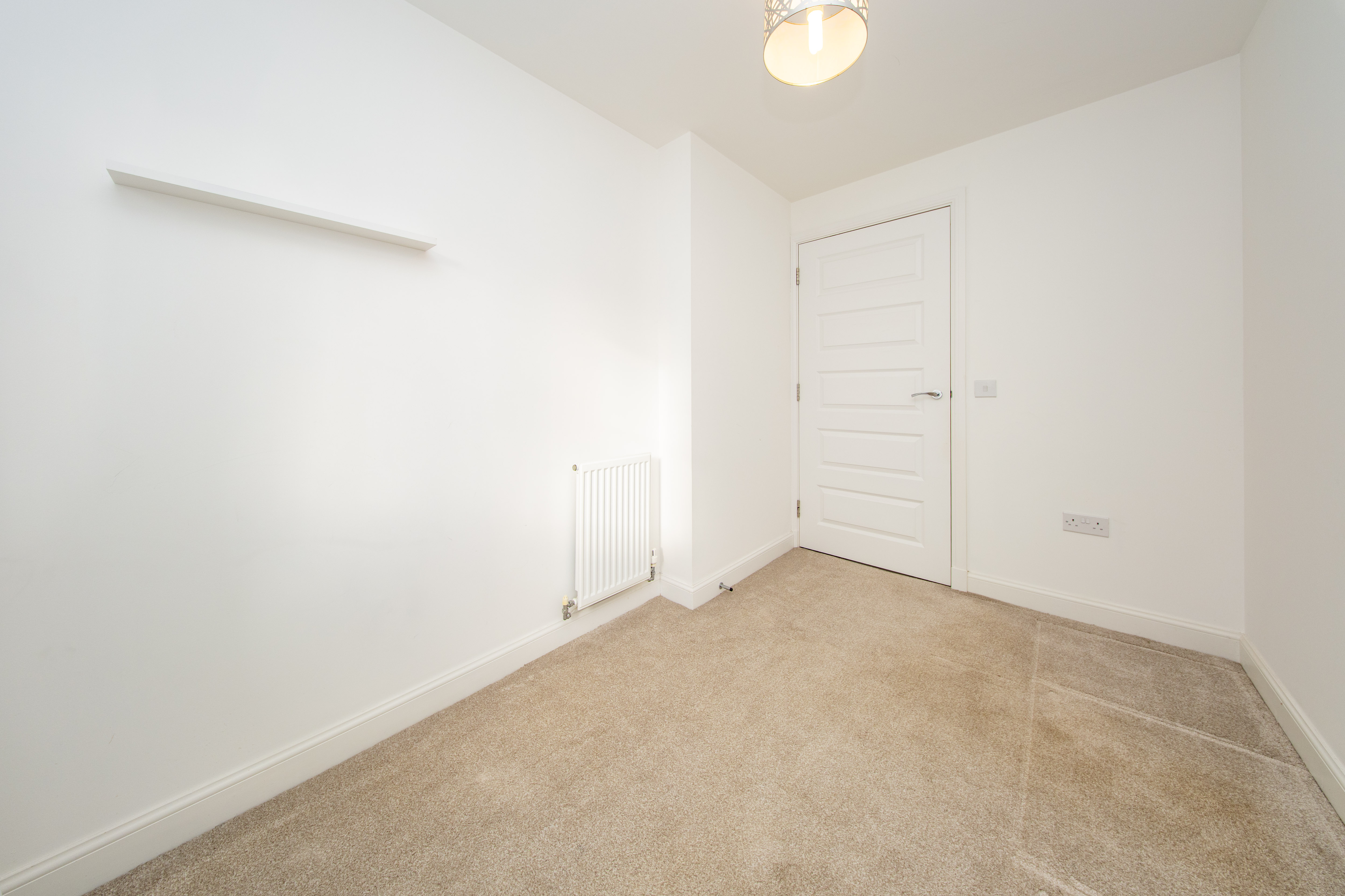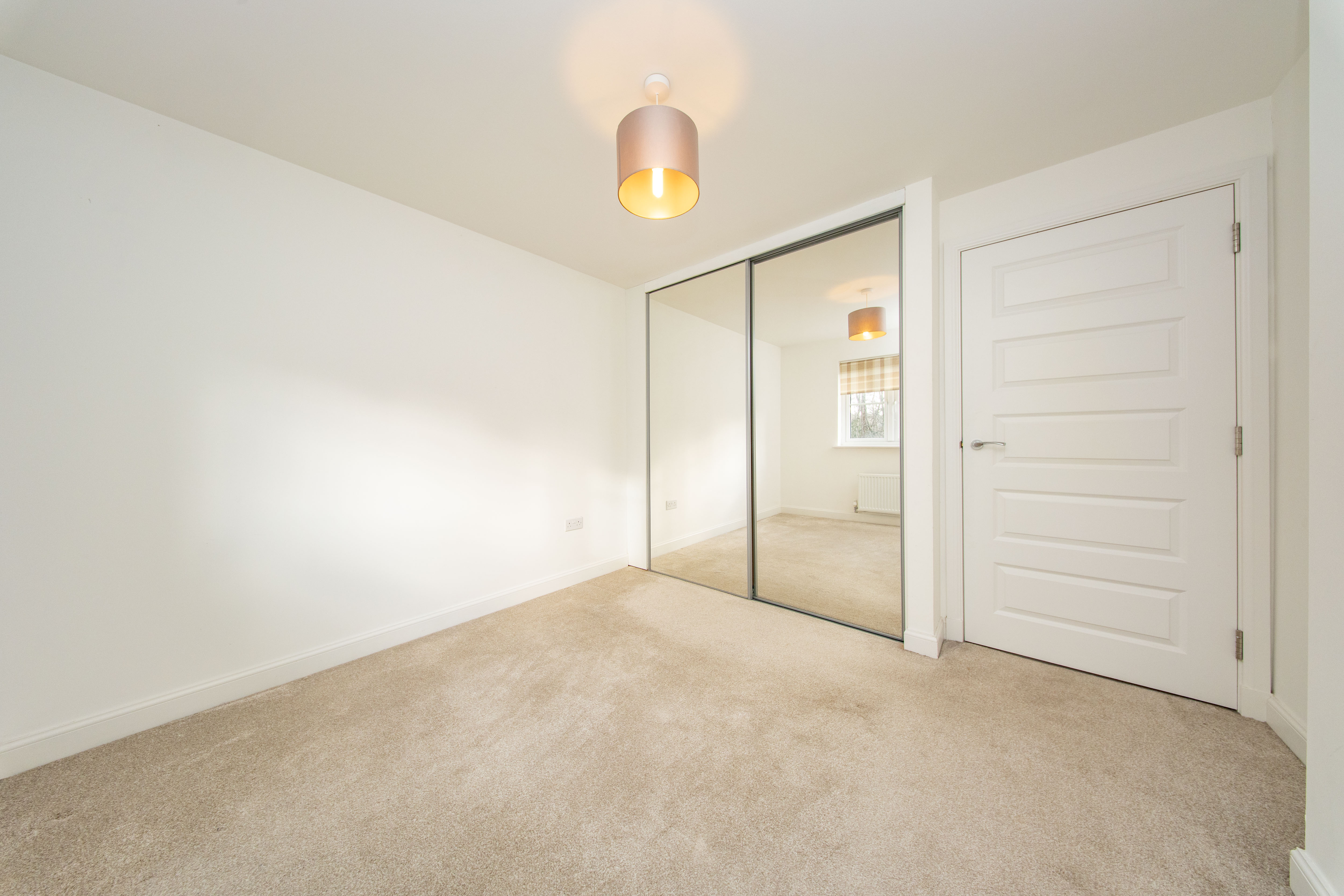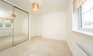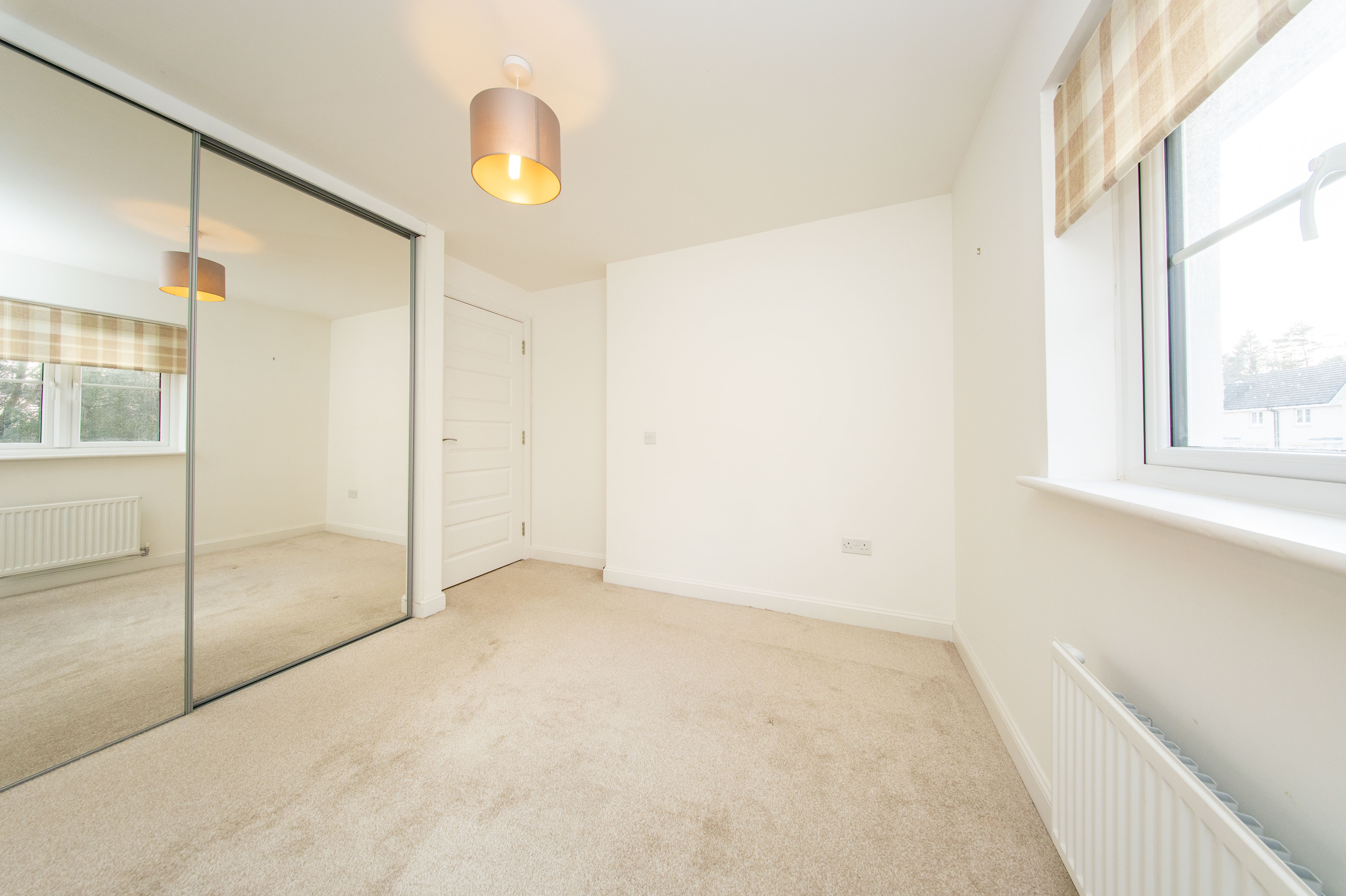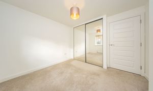 Double Bedroom located at the rear of the property with a built-in mirror door wardrobe. There is one central light fitting, painted walls, one radiator and carpet flooring.