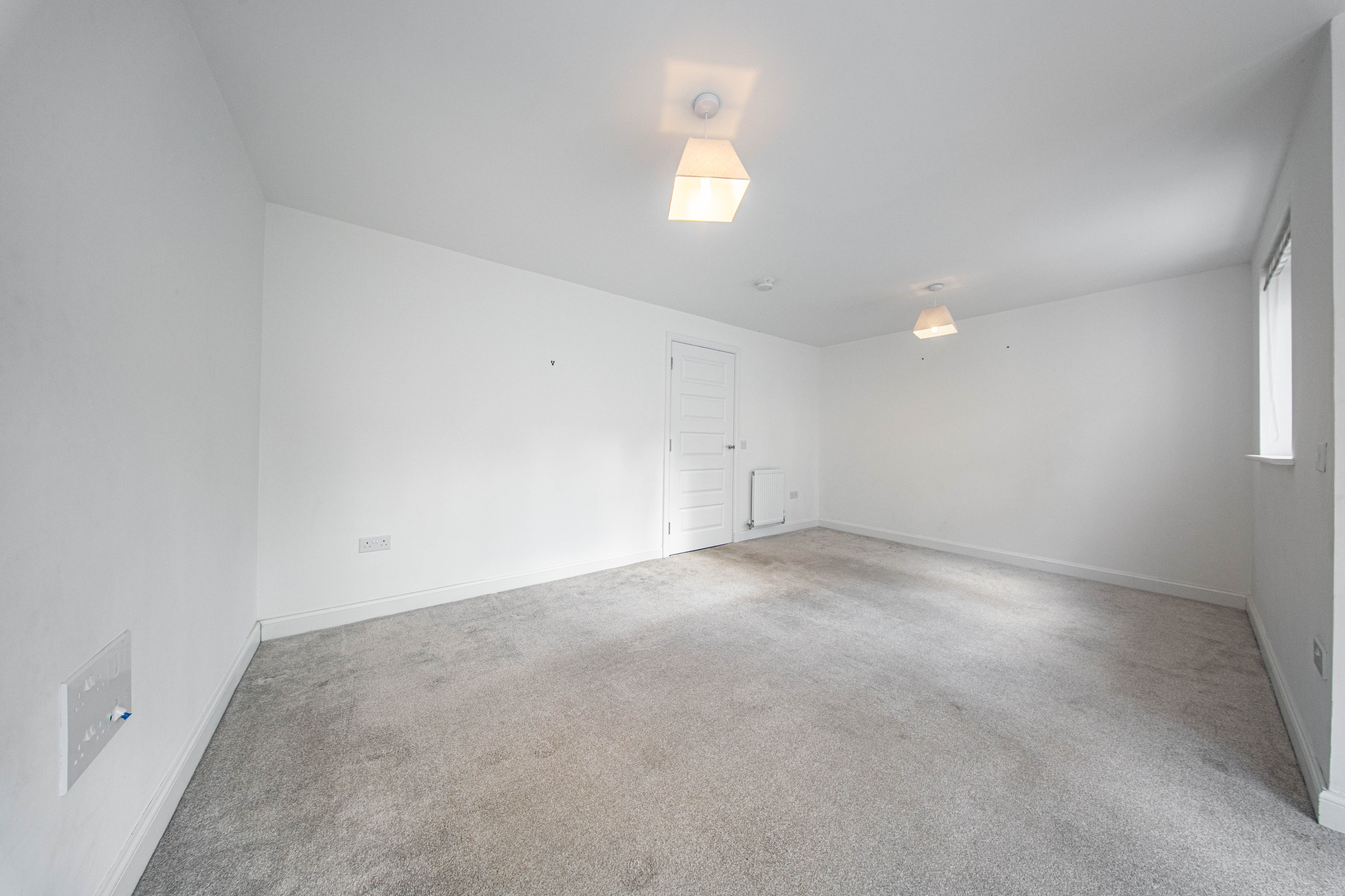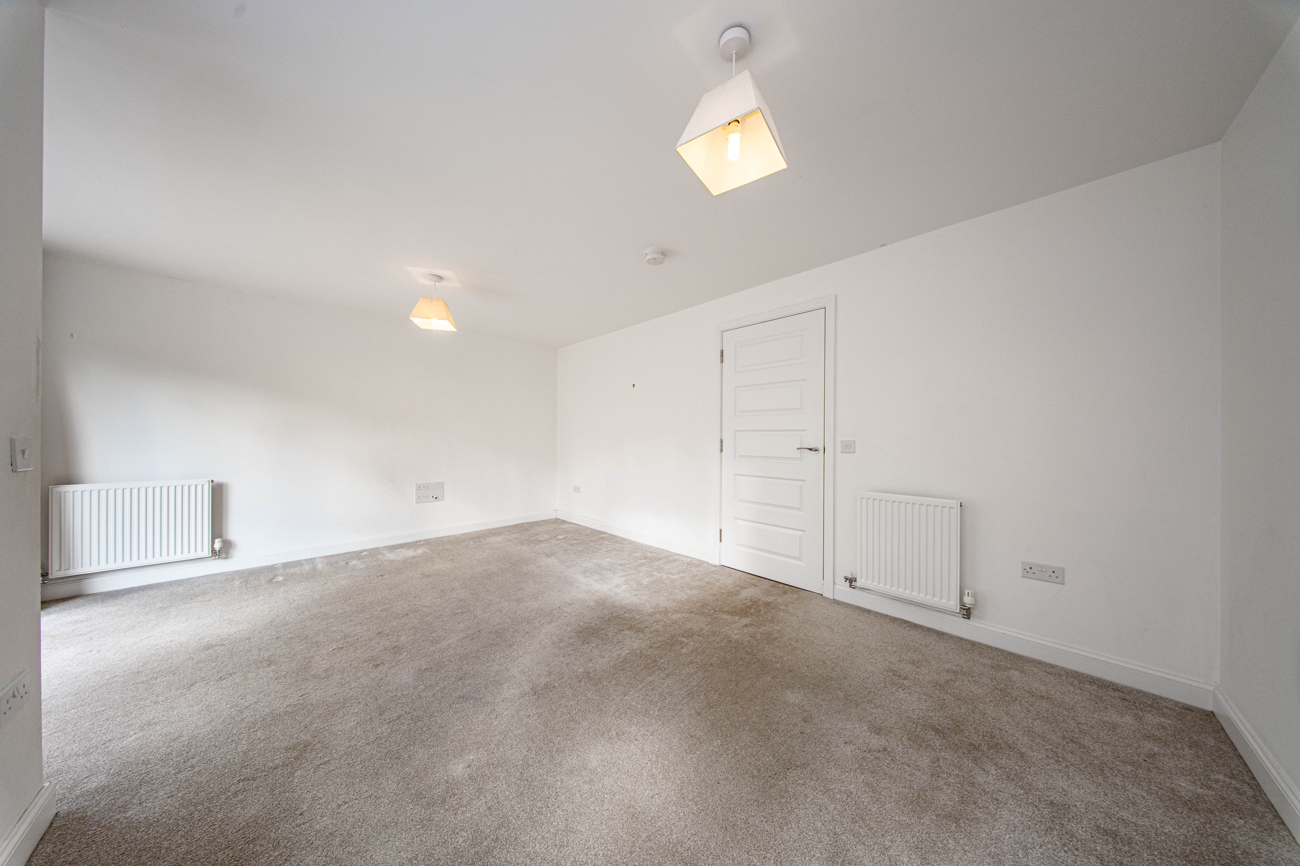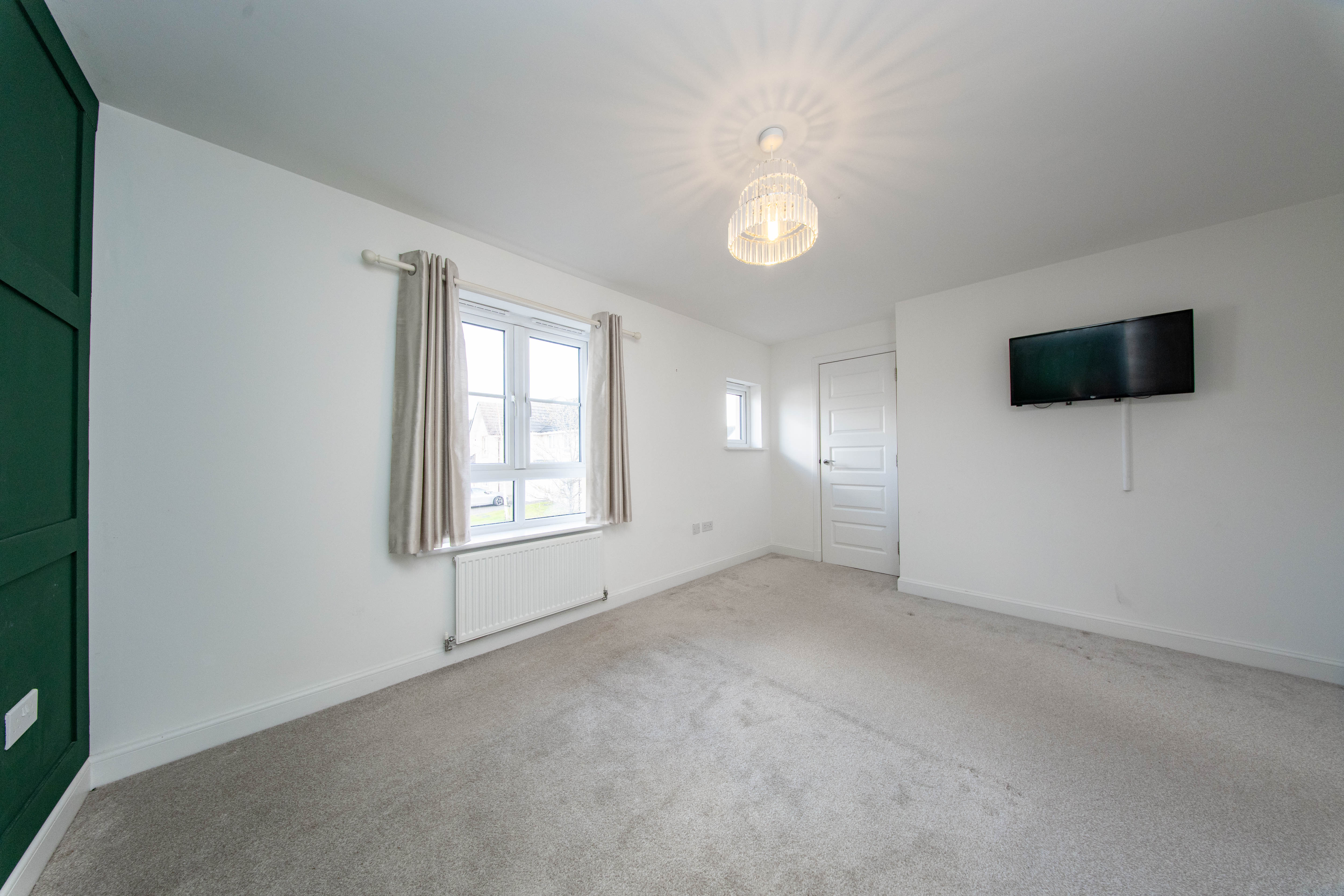 Double Bedroom located at the rear of the property with a built-in mirror door wardrobe. There is one central light fitting, painted walls, one radiator and carpet flooring.