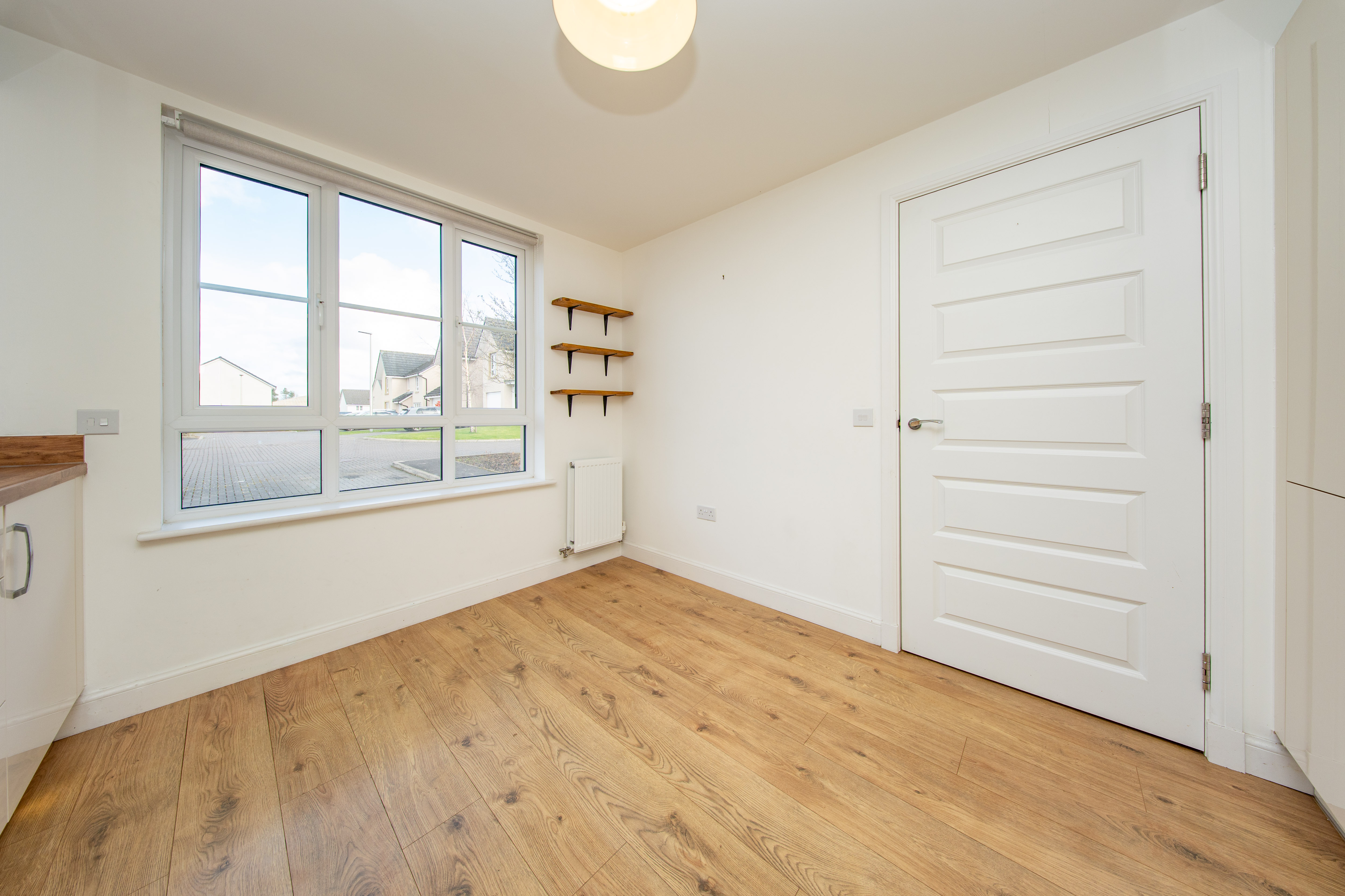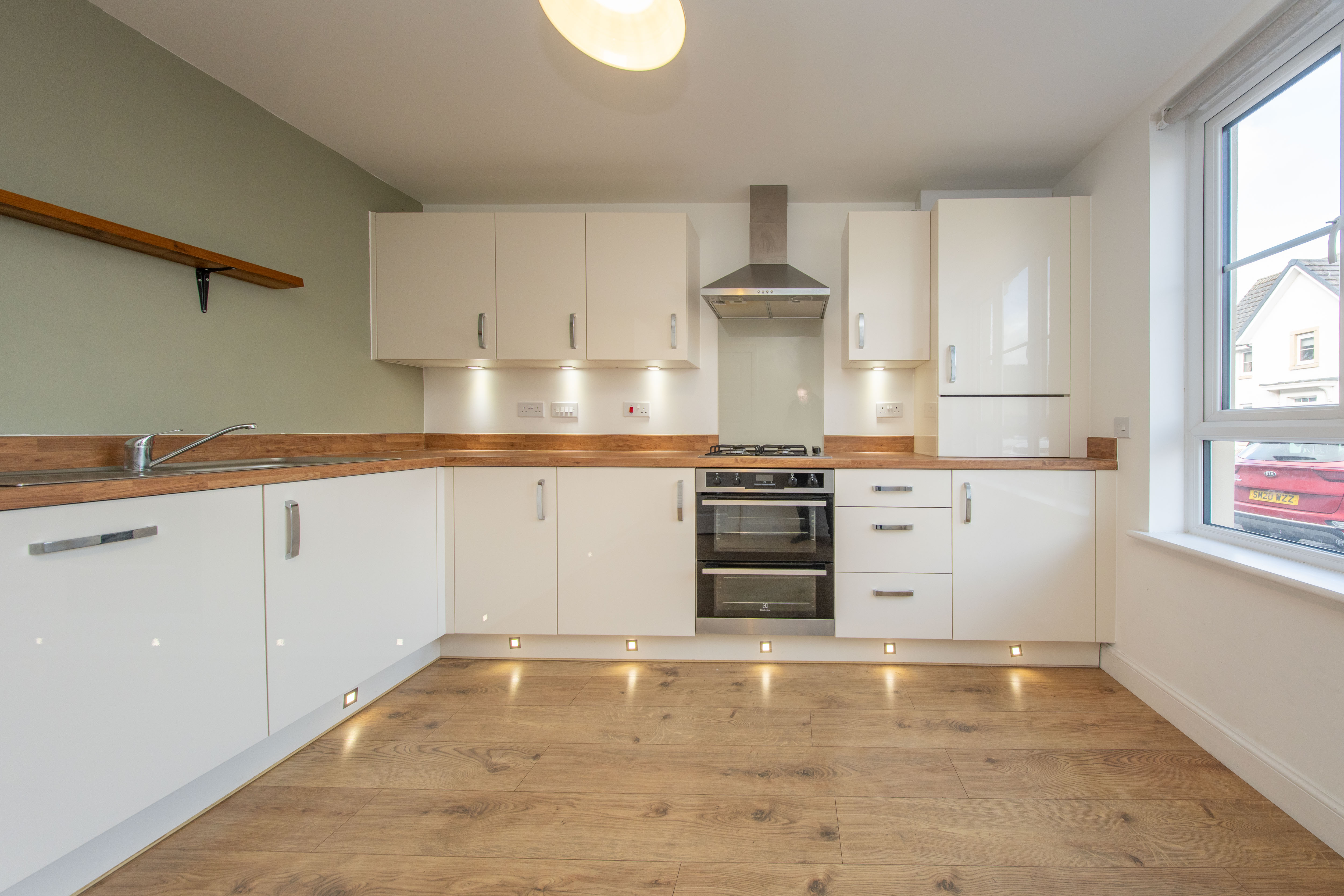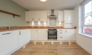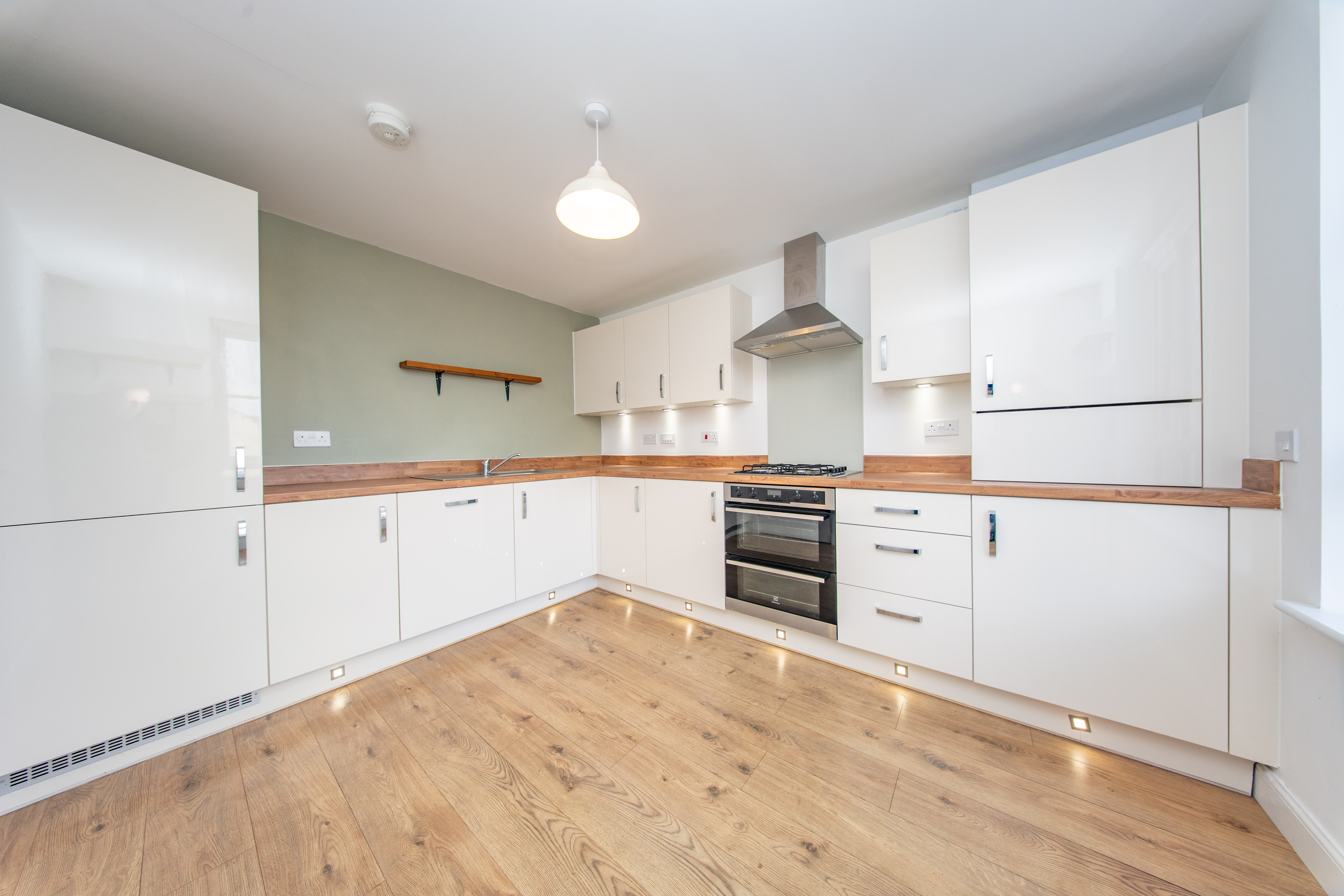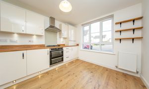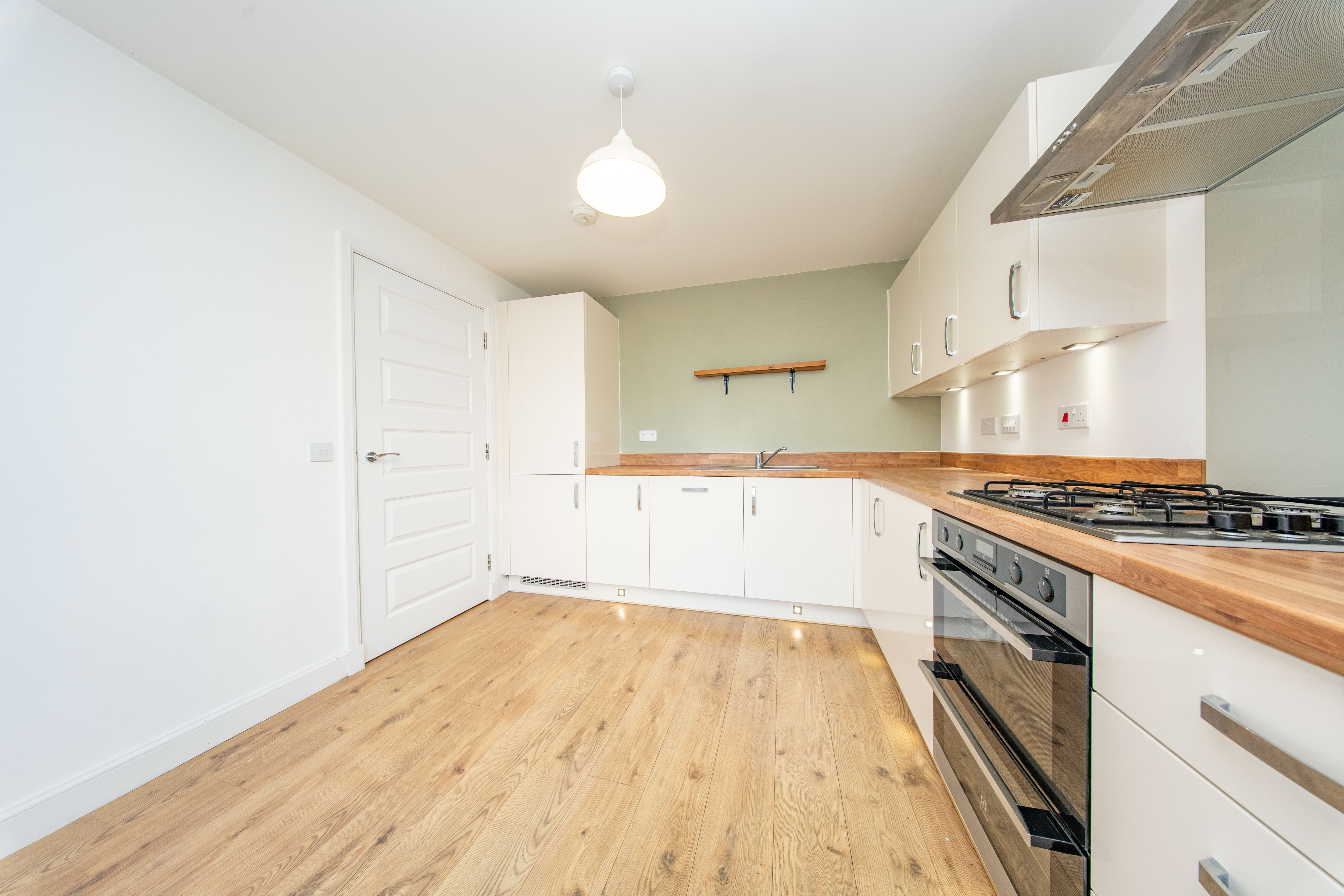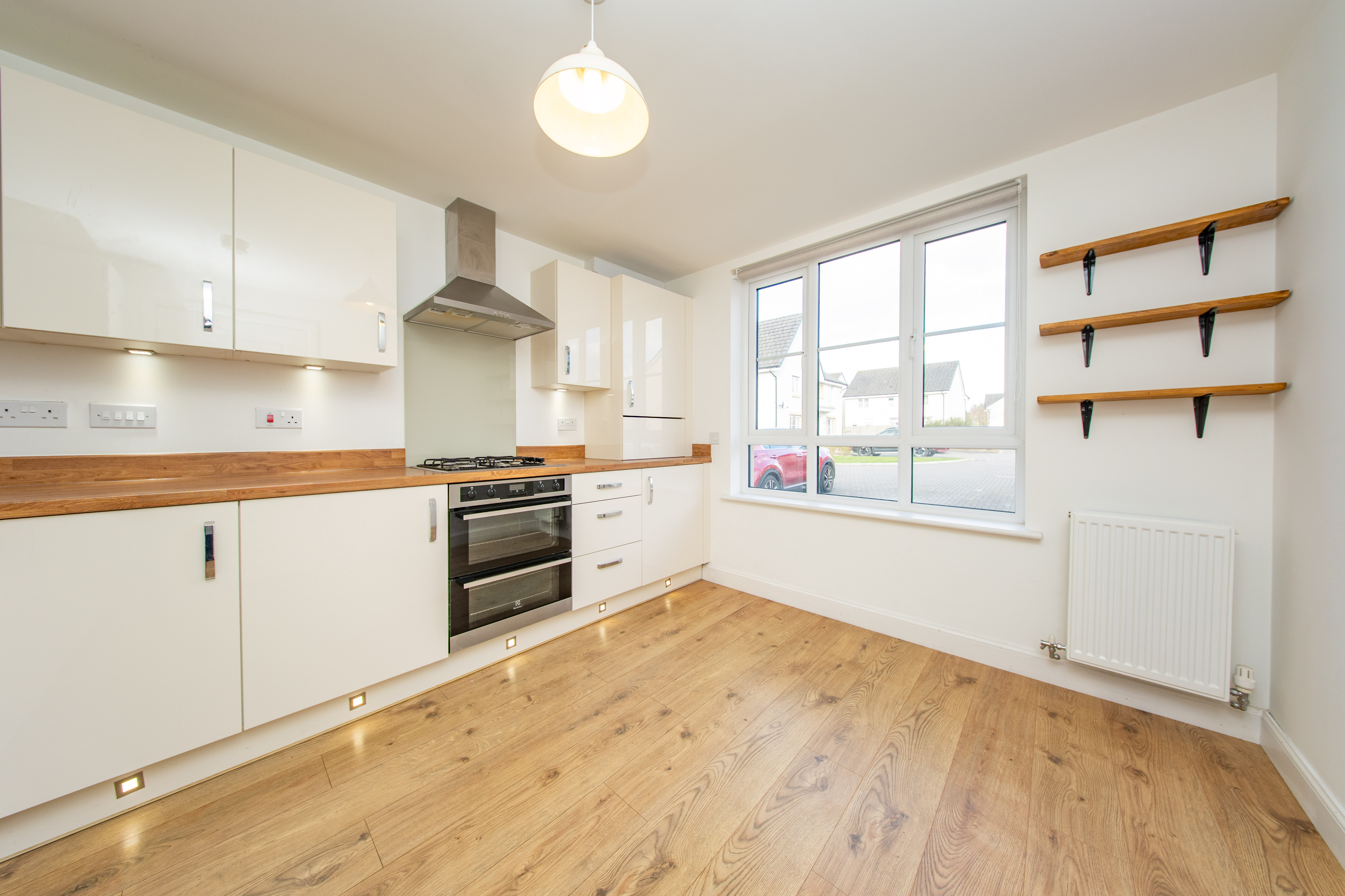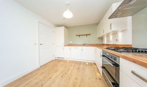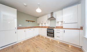 Fitted Kitchen with wall and base units, wood effect worktops, extractor hood, integrated fridge freezer, integrated four ring gas hob with splashback above, integrated oven, integrated boiler and stainless-steel sink with mixer tap. There is one central light fitting, painted walls, front facing window, one radiator and laminate flooring. Additionally, there is space for a dining table.