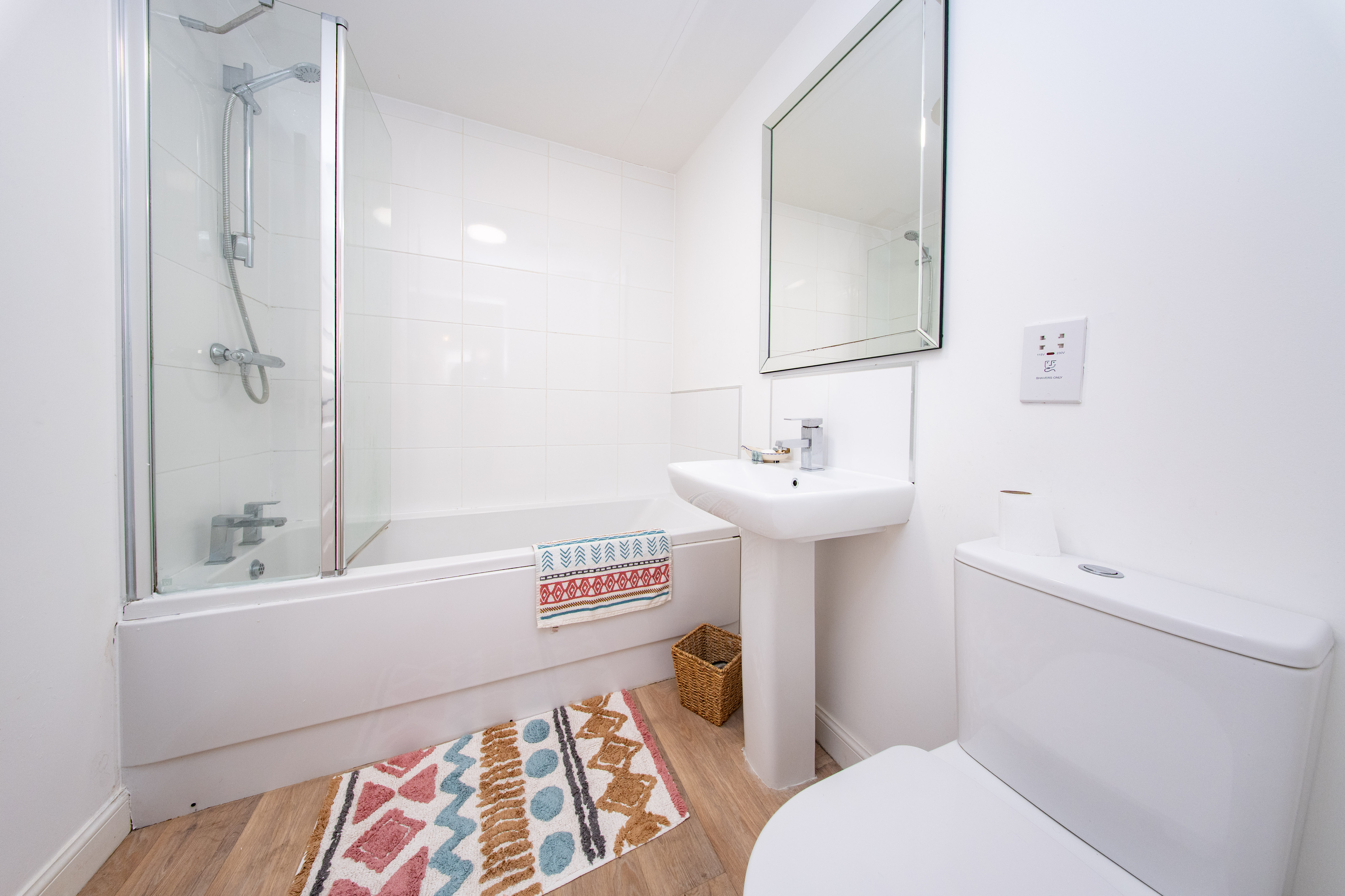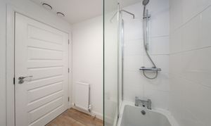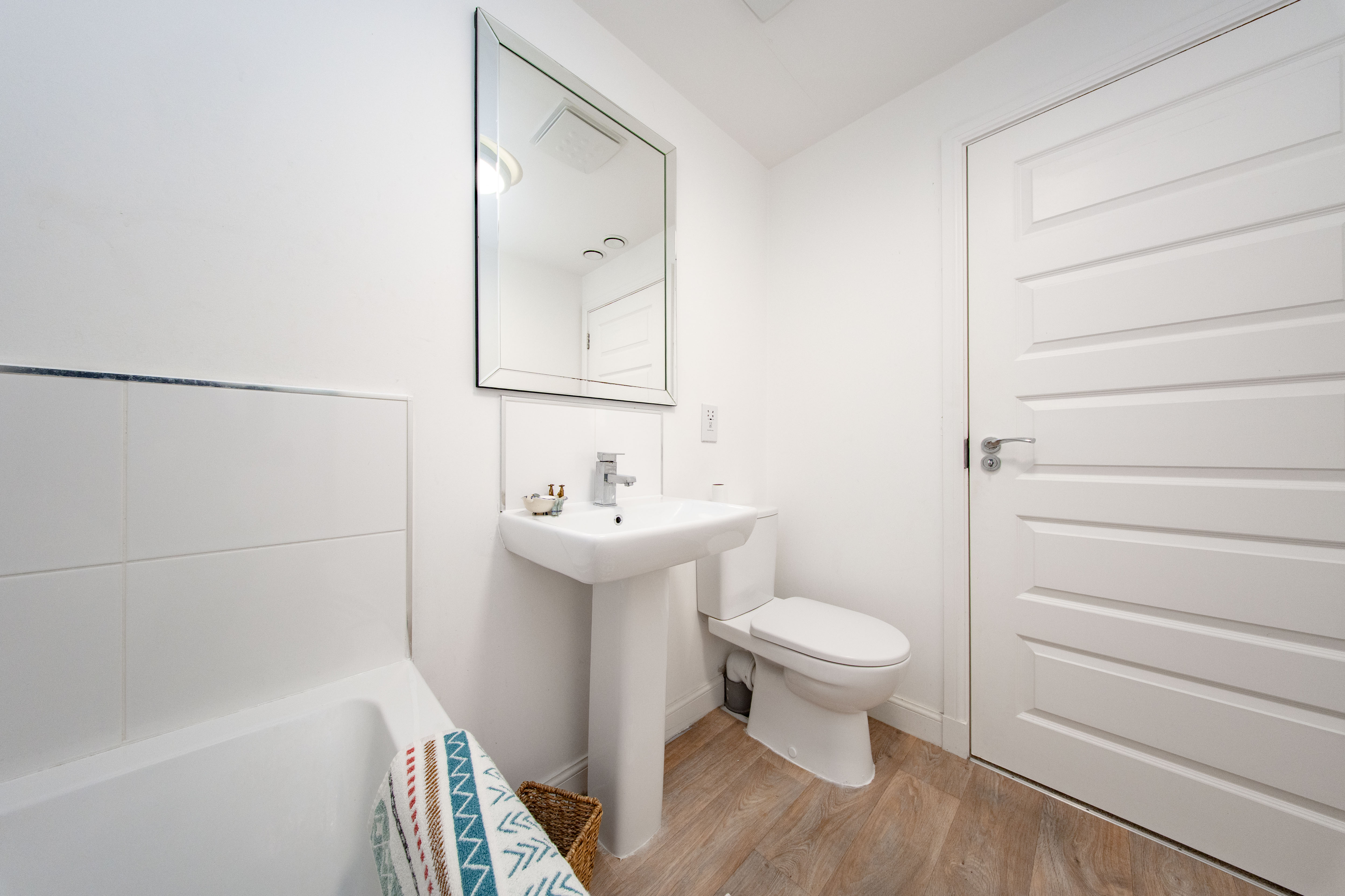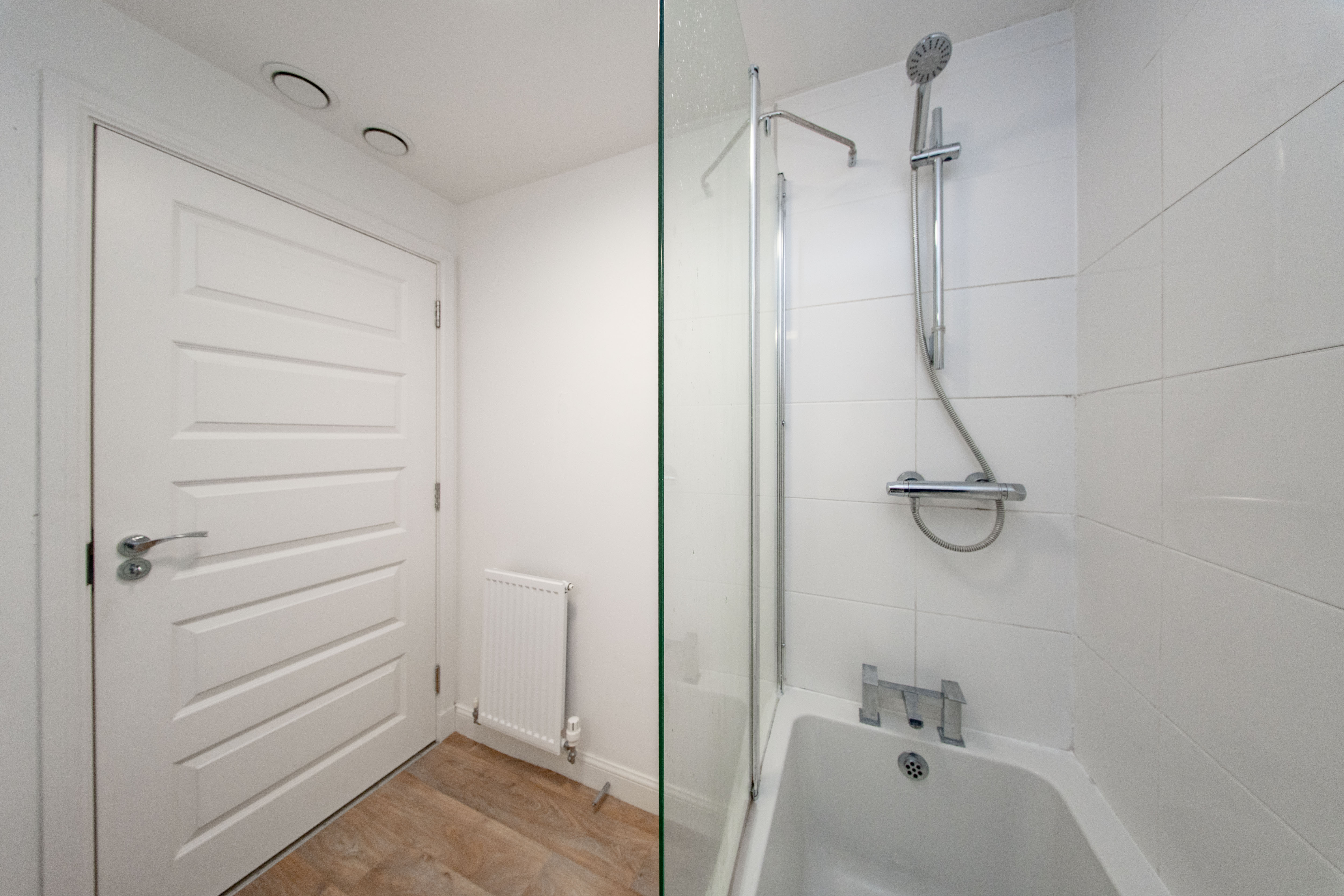 Three piece Bathroom comprising of bath with shower over, toilet, and pedestal wash hand basin with chrome tap. There is one central light fitting, white tiled walls around the bath and painted white walls, one radiator and wood effect flooring.