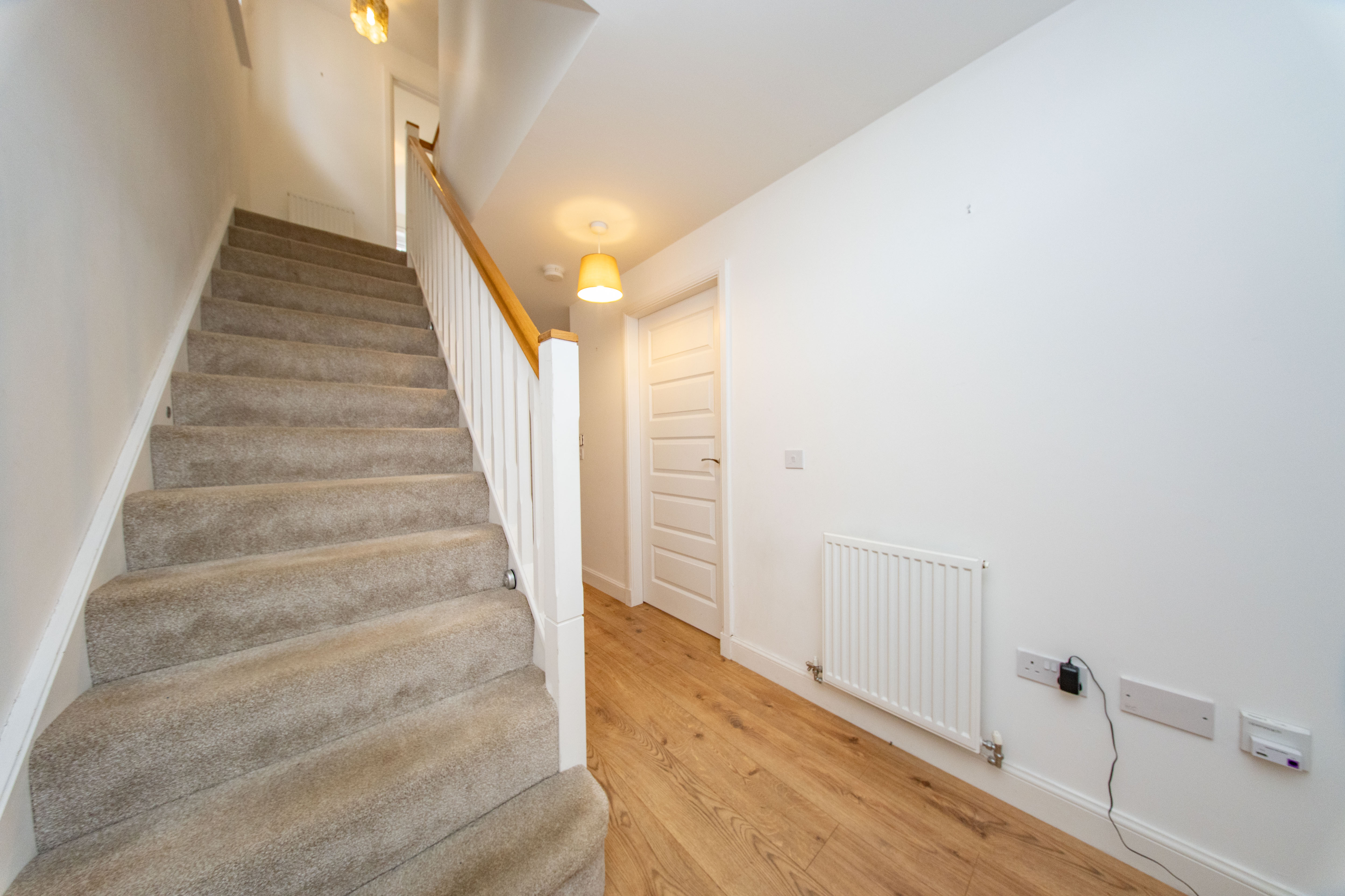Bright and welcoming entrance hallway giving access to Kitchen, Lounge, WC, built-in under stair storage and carpeted staircase to the upper level. There is one central light fitting, painted walls, one radiator and laminate flooring.