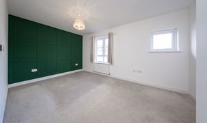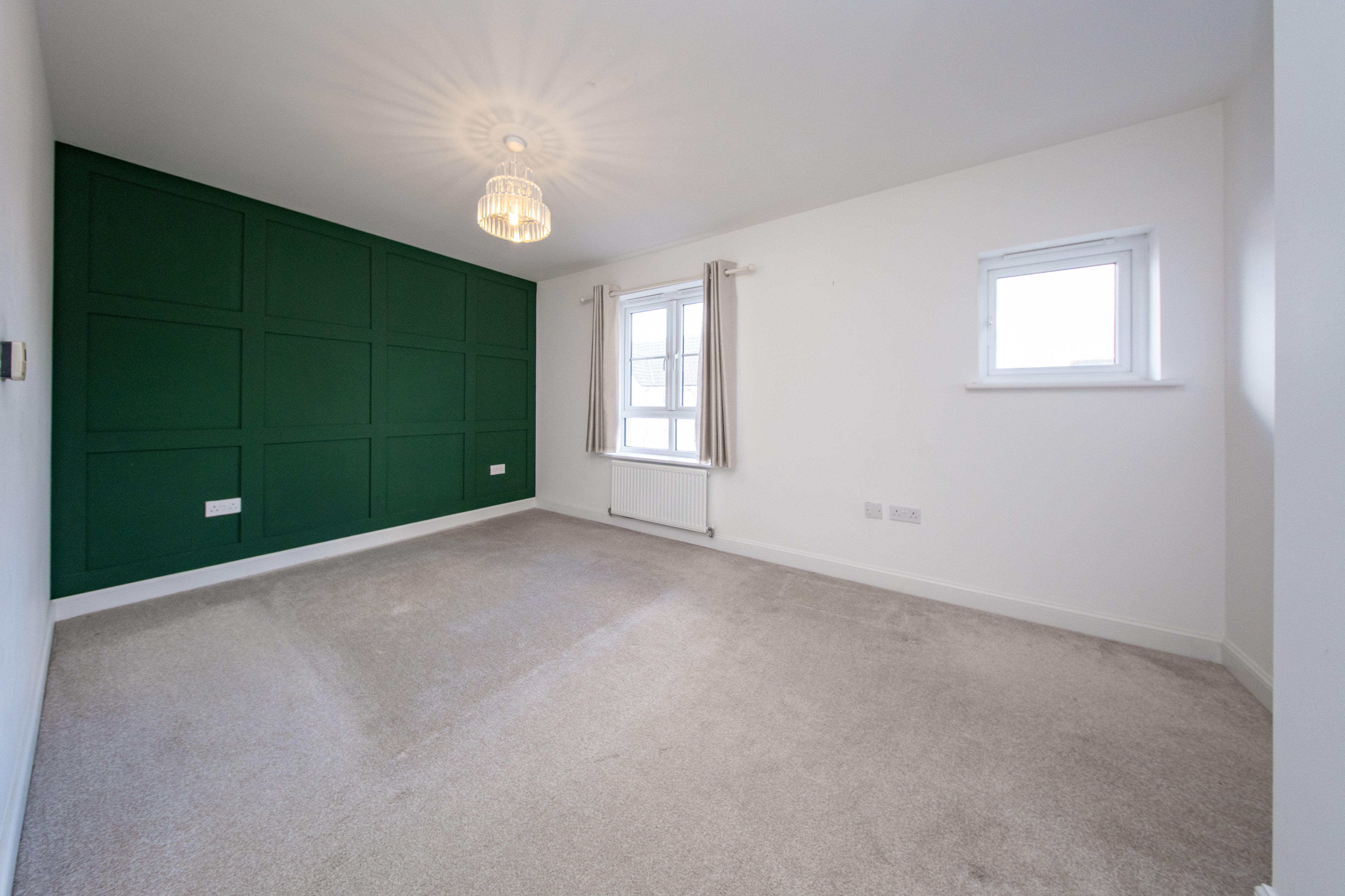Double Bedroom located at the front of the property with a gorgeous feature wall with panelling, two front facing windows and a built-in storage cupboard. There is one central light fitting, painted walls, one radiator and carpet flooring.