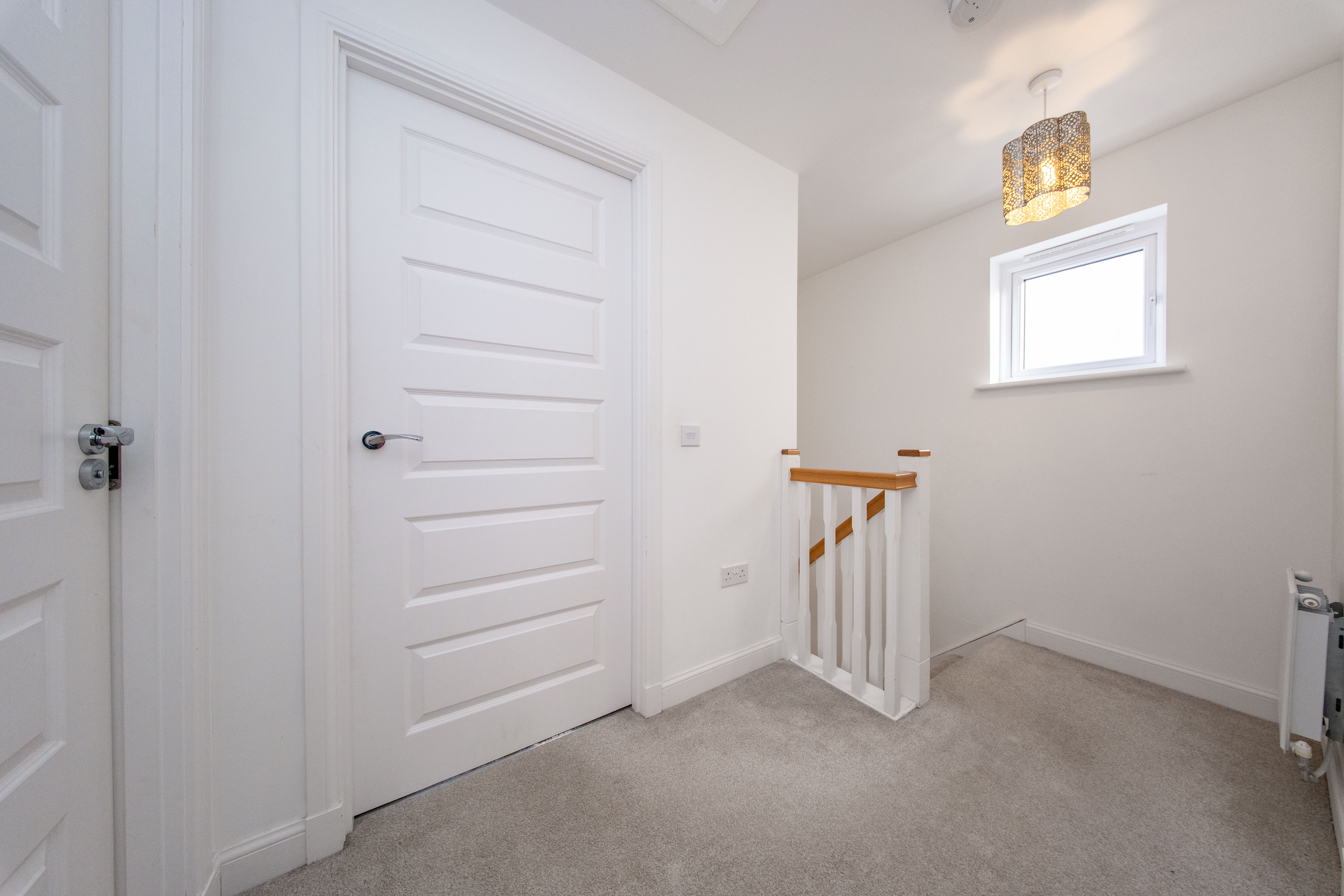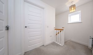 Upper Hall giving access to three Bedrooms, Bathroom and attic. There is one central light fitting, painted walls, side facing window, one radiator and carpet flooring.