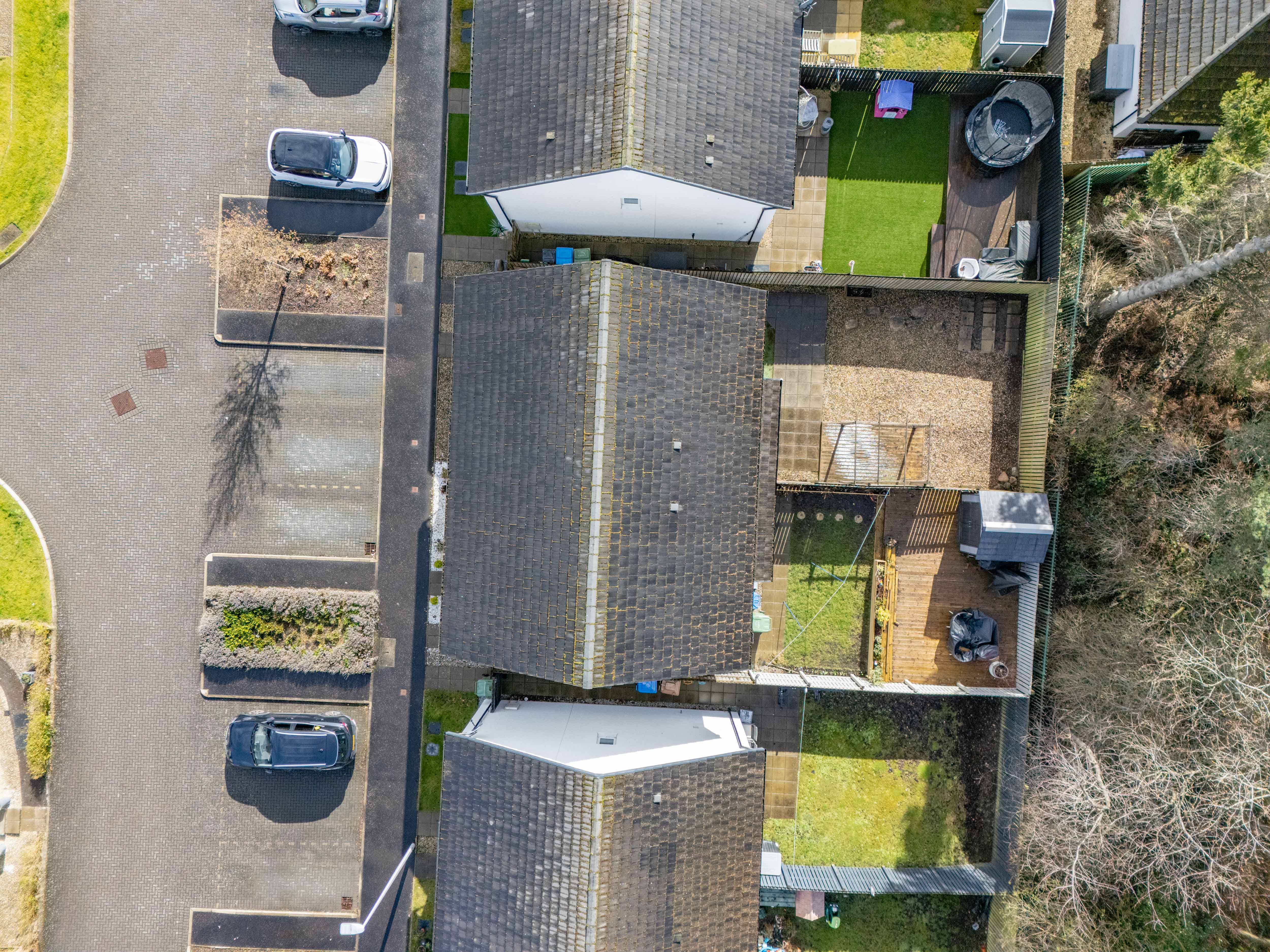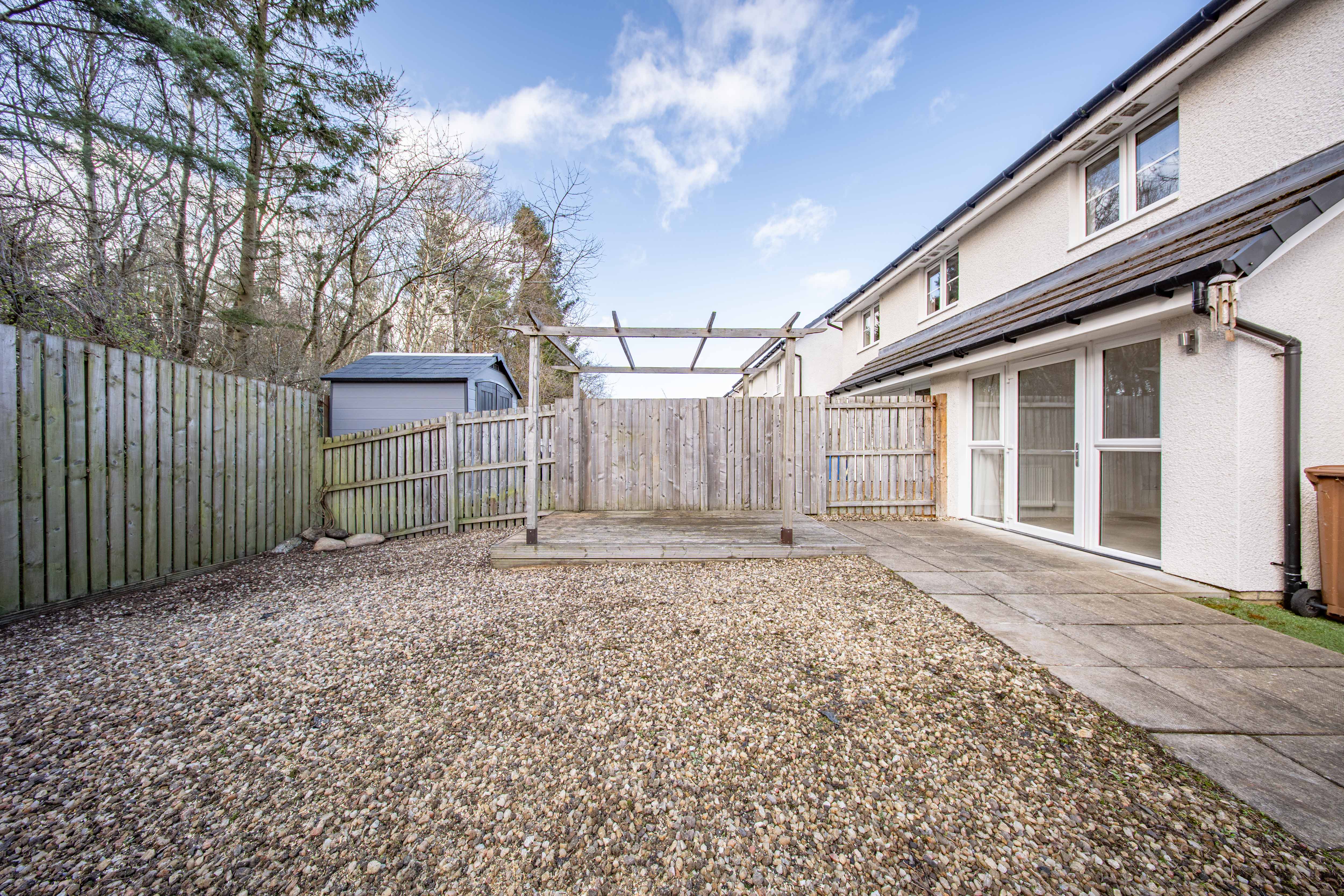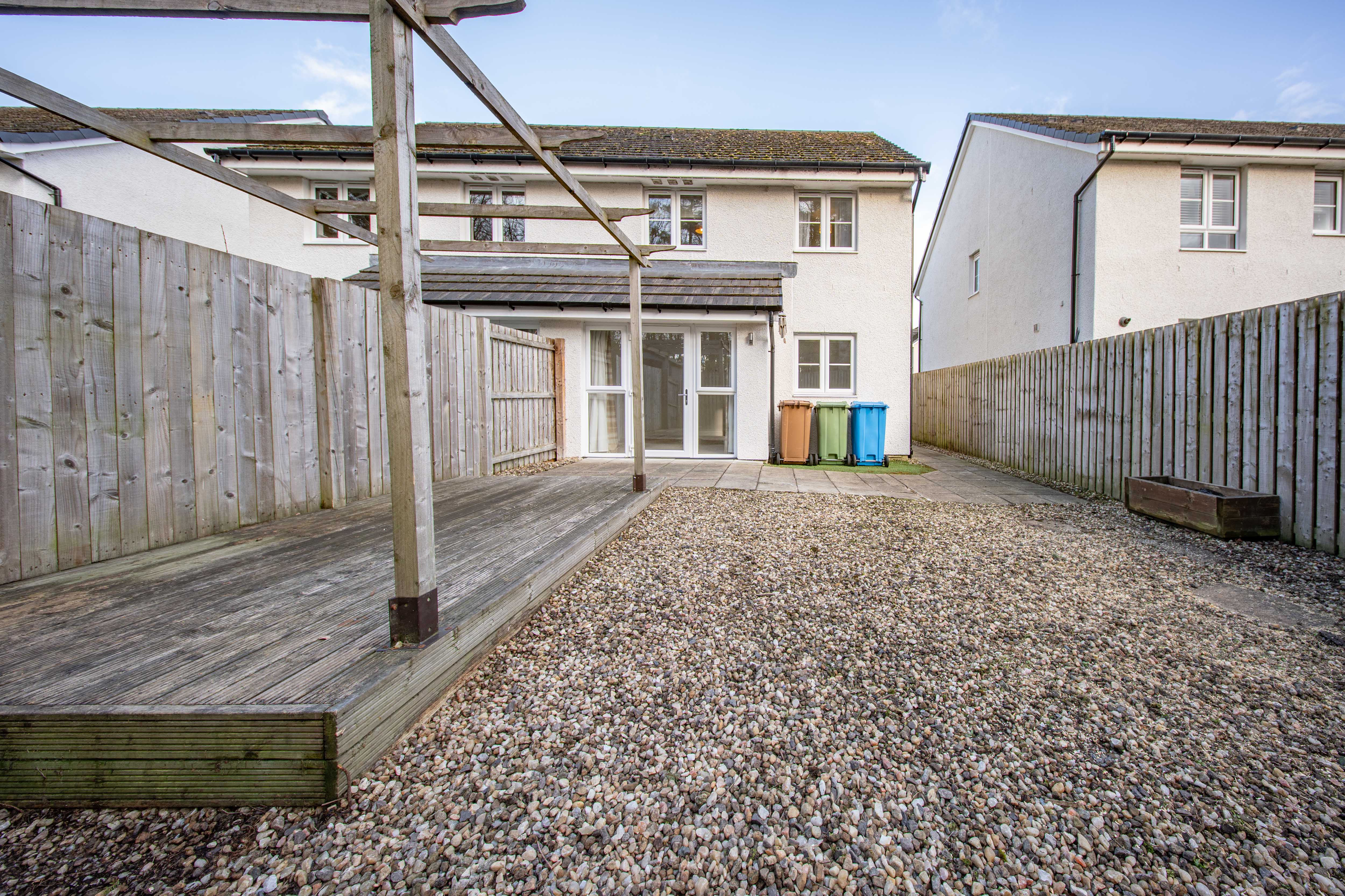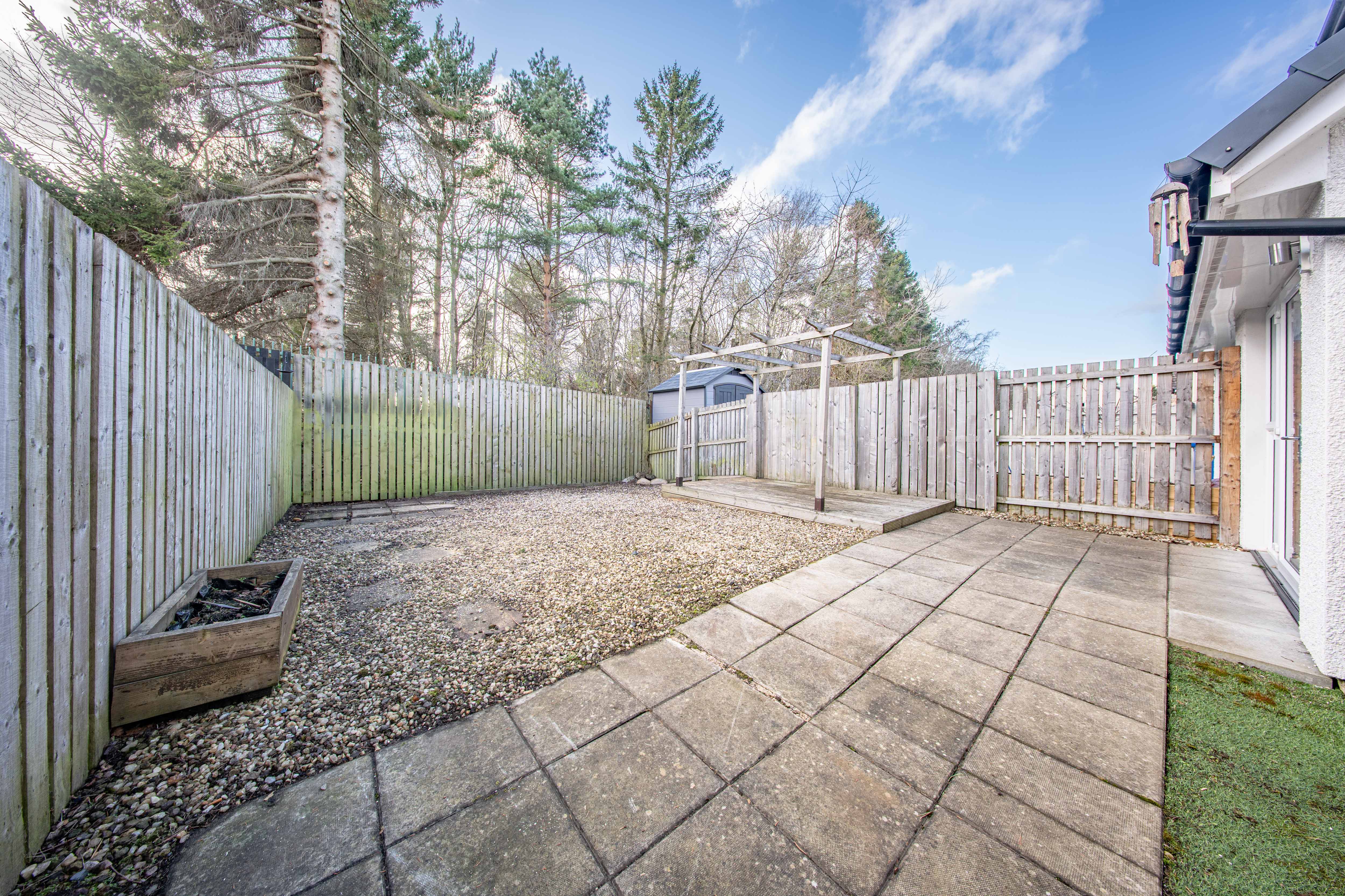 South facing garden with paved patio, paved path, gravelled area and decking with pergola. Fence surround with access to the front of the property via gate.
