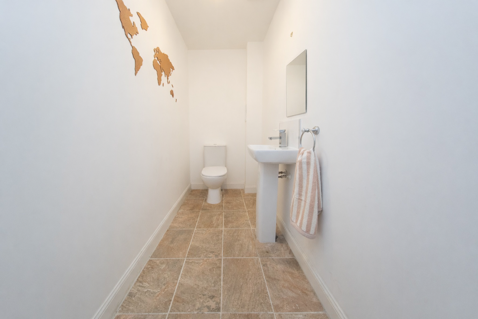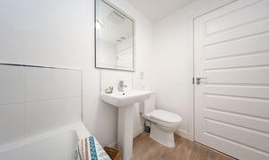 WC located between the Lounge and Kitchen; with sink and toilet. This room has one central light fitting, extractor, painted walls with tile splashback at sink, one radiator and tiled effect flooring.