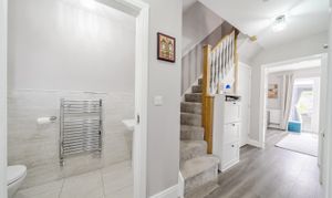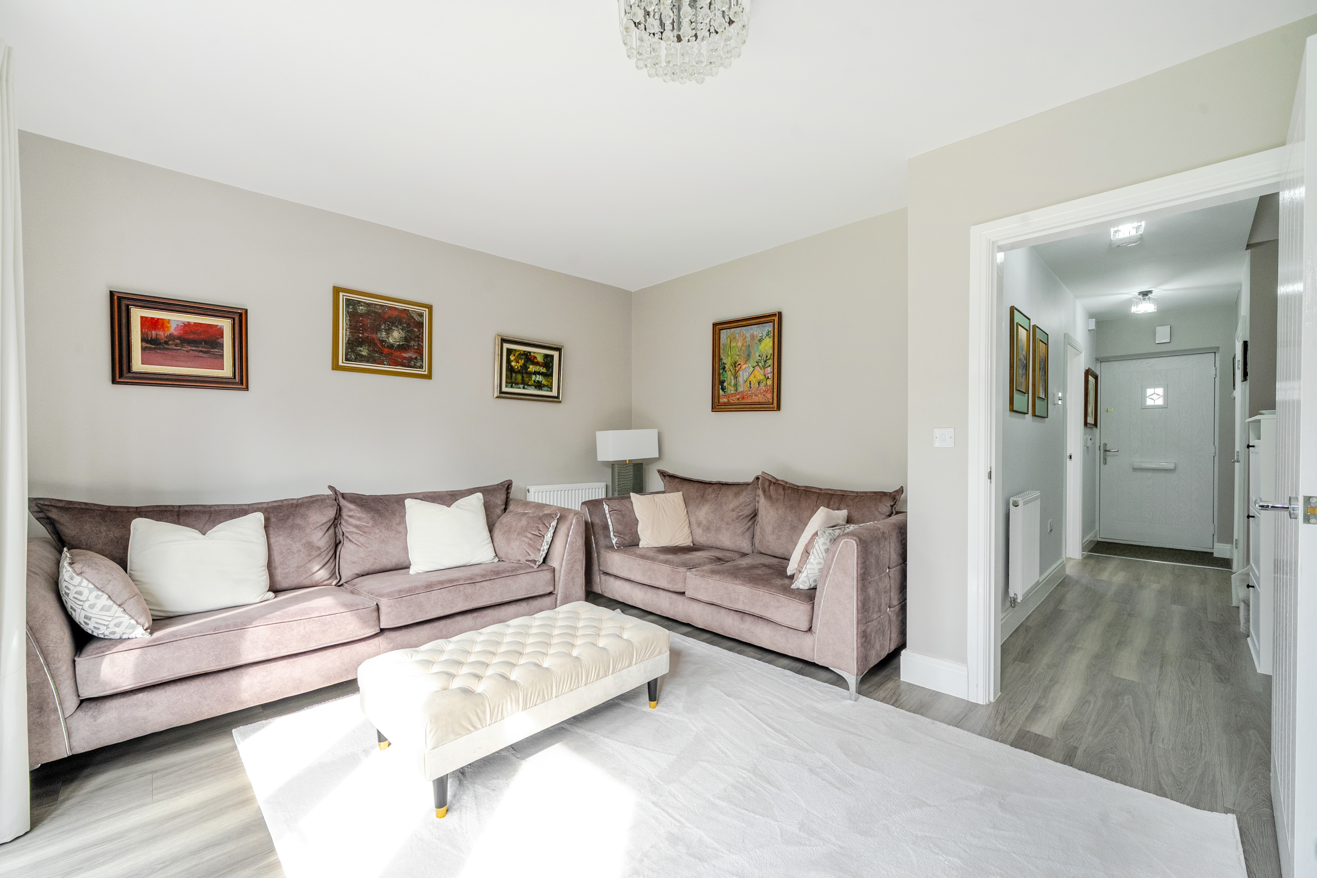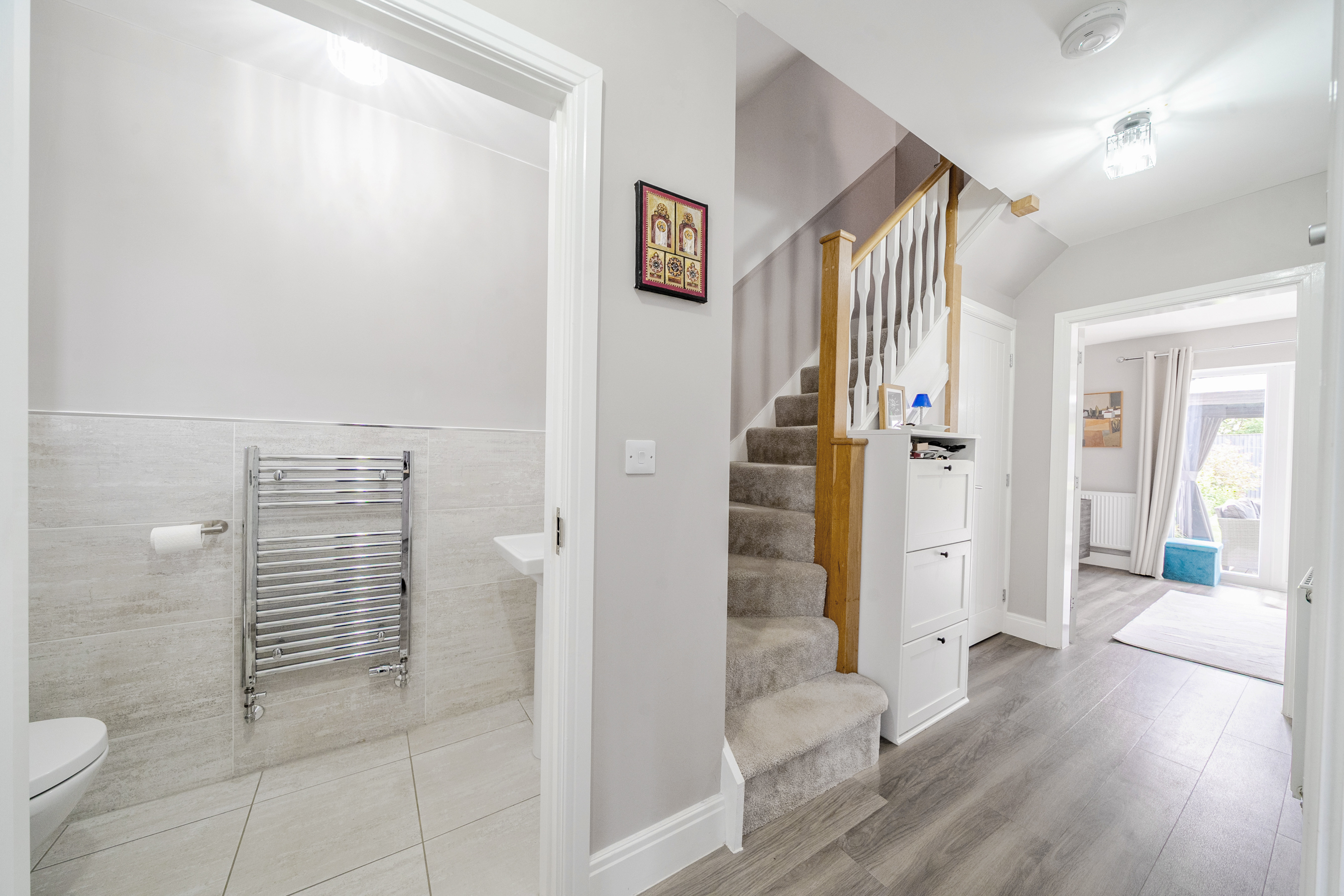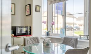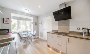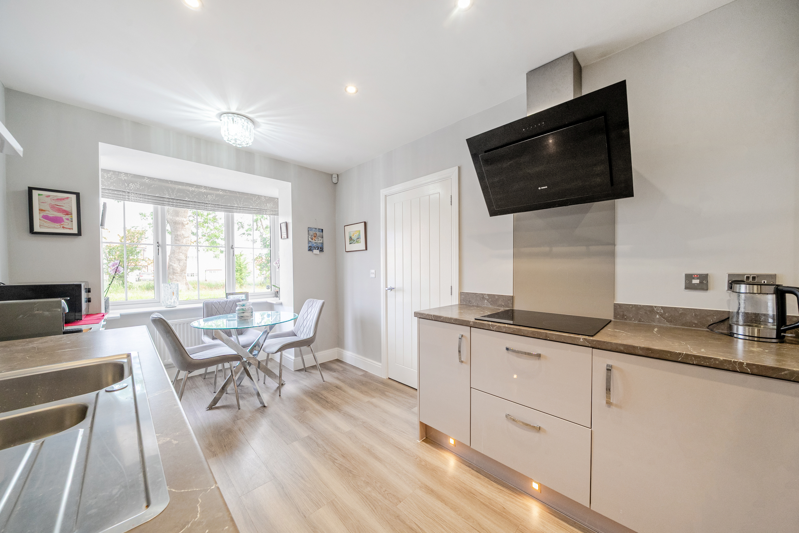 The home is approached via a tarmac driveway providing parking for two vehicles. Upon entry, the hallway includes a useful storage cupboard and a convenient downstairs WC. At the front of the property, the stylish and modern bay-fronted kitchen is fitted with high-quality units and integrated appliances, and comfortably accommodates a dining table.