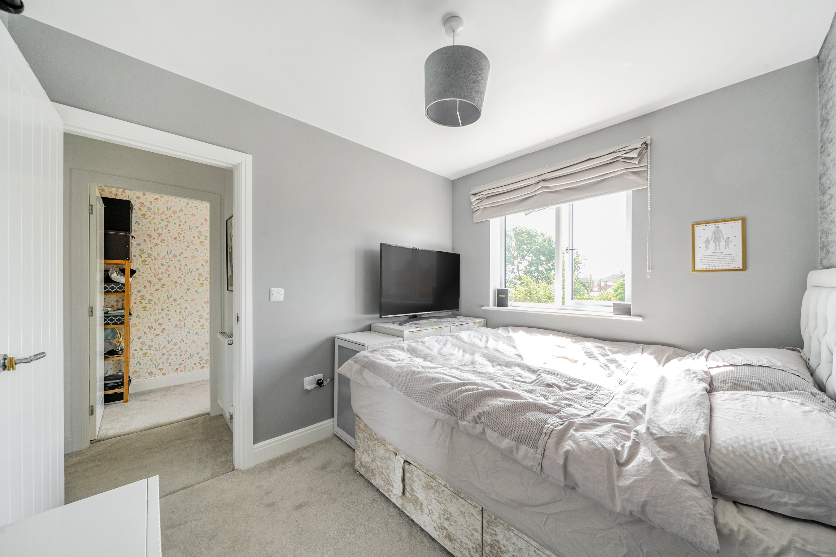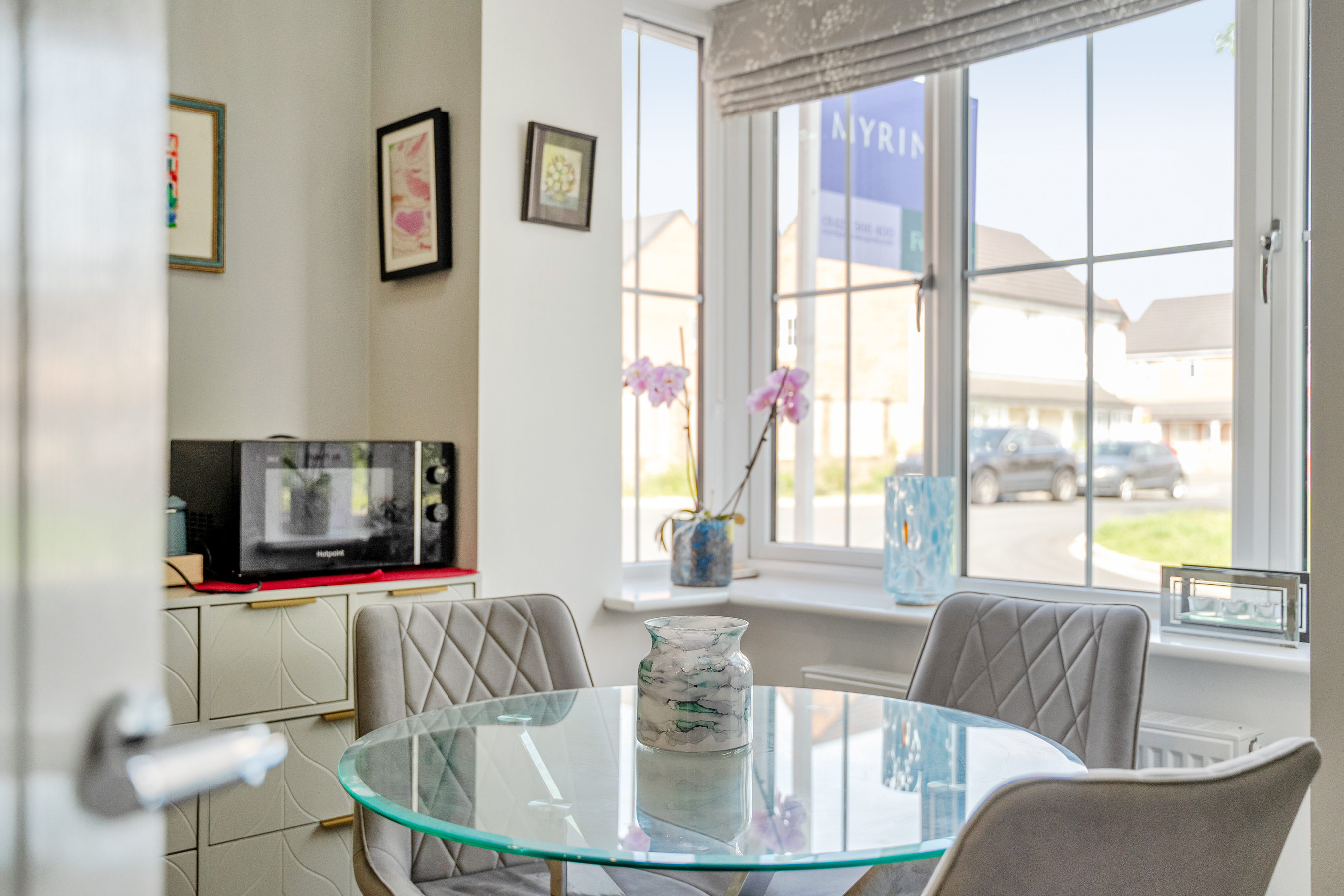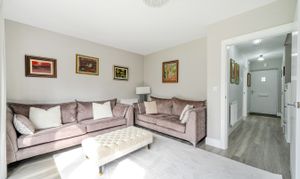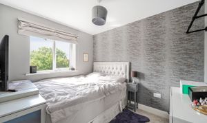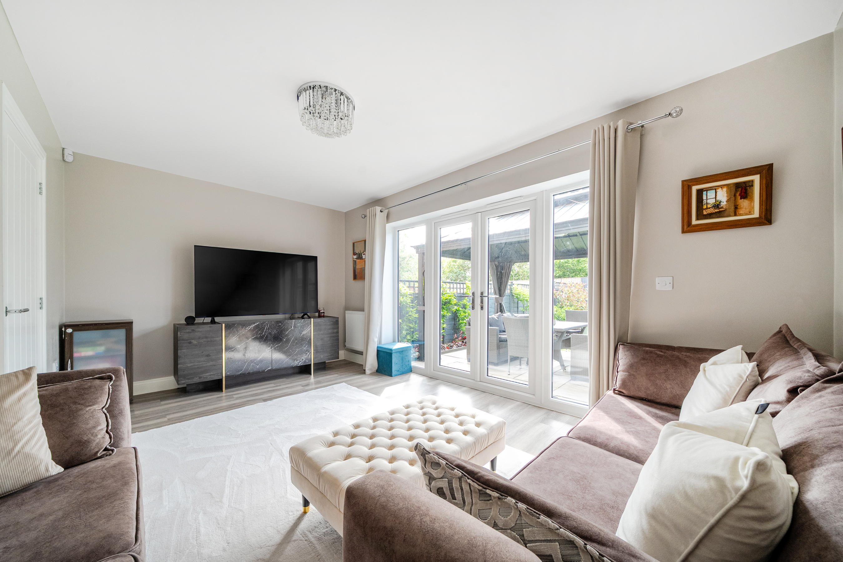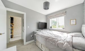 The home is approached via a tarmac driveway providing parking for two vehicles. Upon entry, the hallway includes a useful storage cupboard and a convenient downstairs WC. At the front of the property, the stylish and modern bay-fronted kitchen is fitted with high-quality units and integrated appliances, and comfortably accommodates a dining table.
