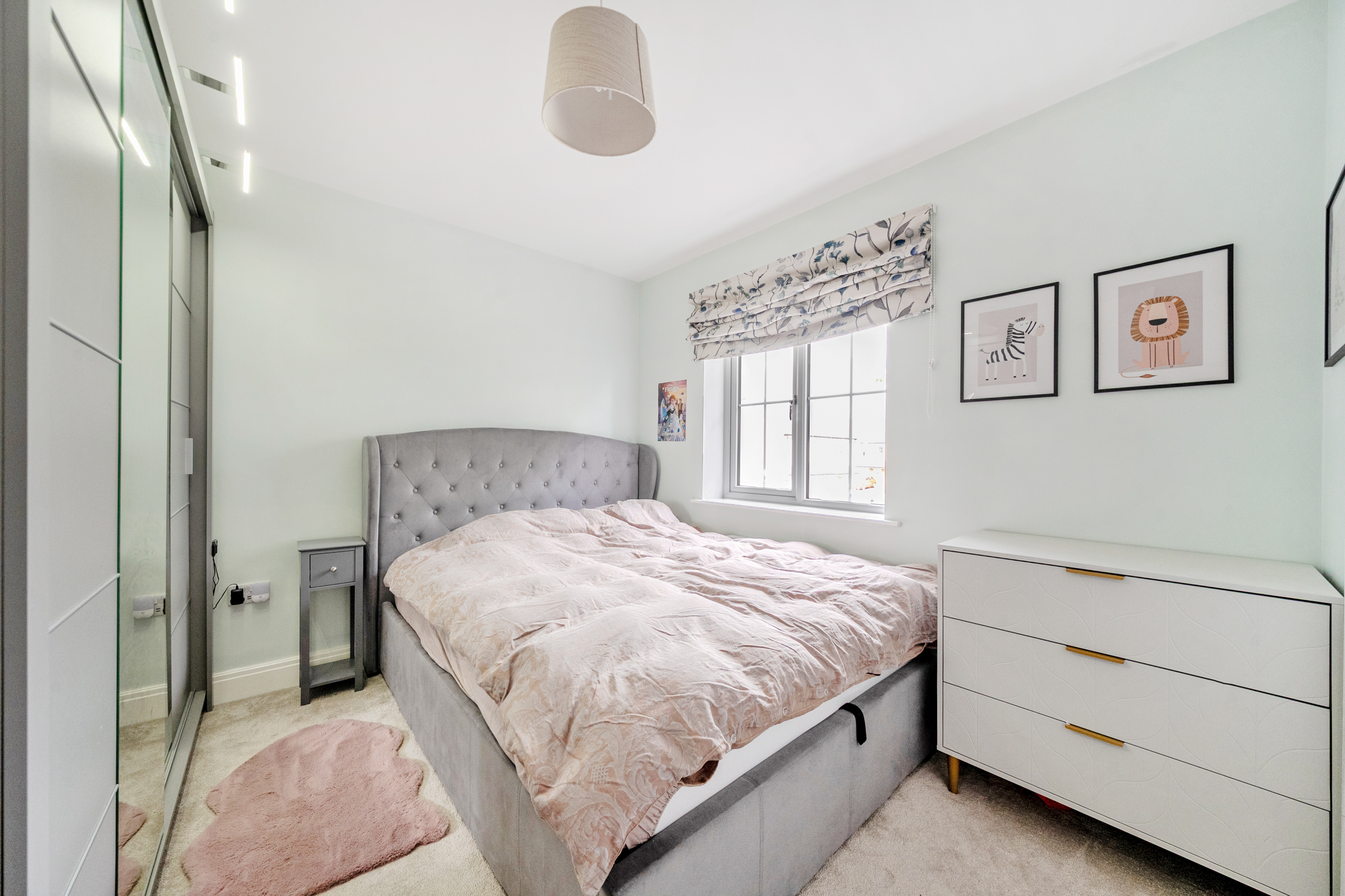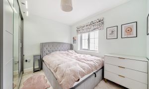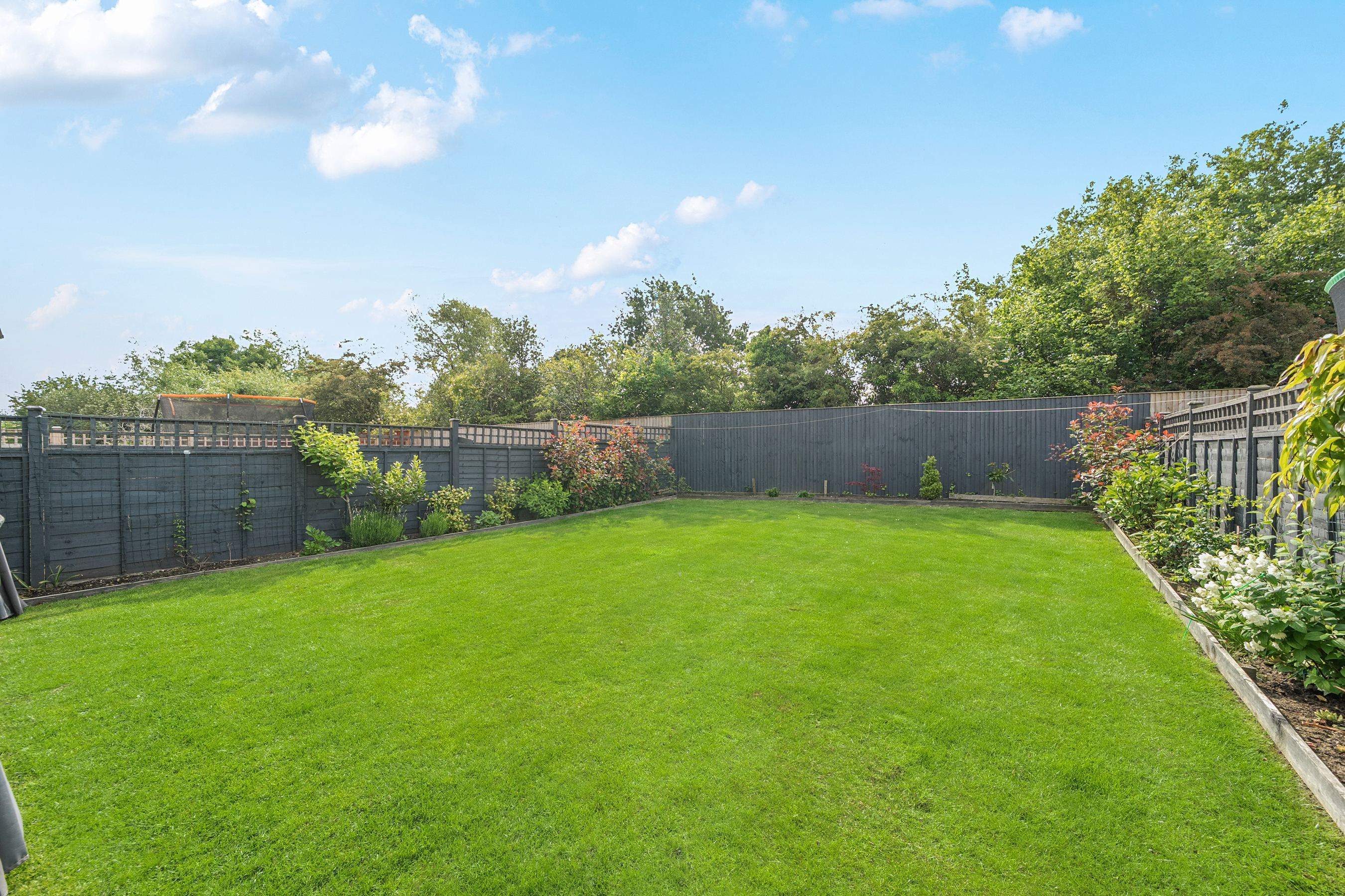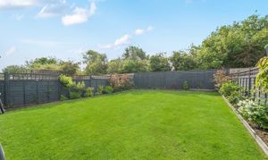 To the rear, the spacious and airy reception room is flooded with natural light and features French doors opening onto a gorgeous, fully enclosed south facing garden. The outdoor space includes a lawn, landscaped borders, and a flagged patio—perfect for entertaining or enjoying the sun throughout the day.