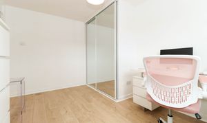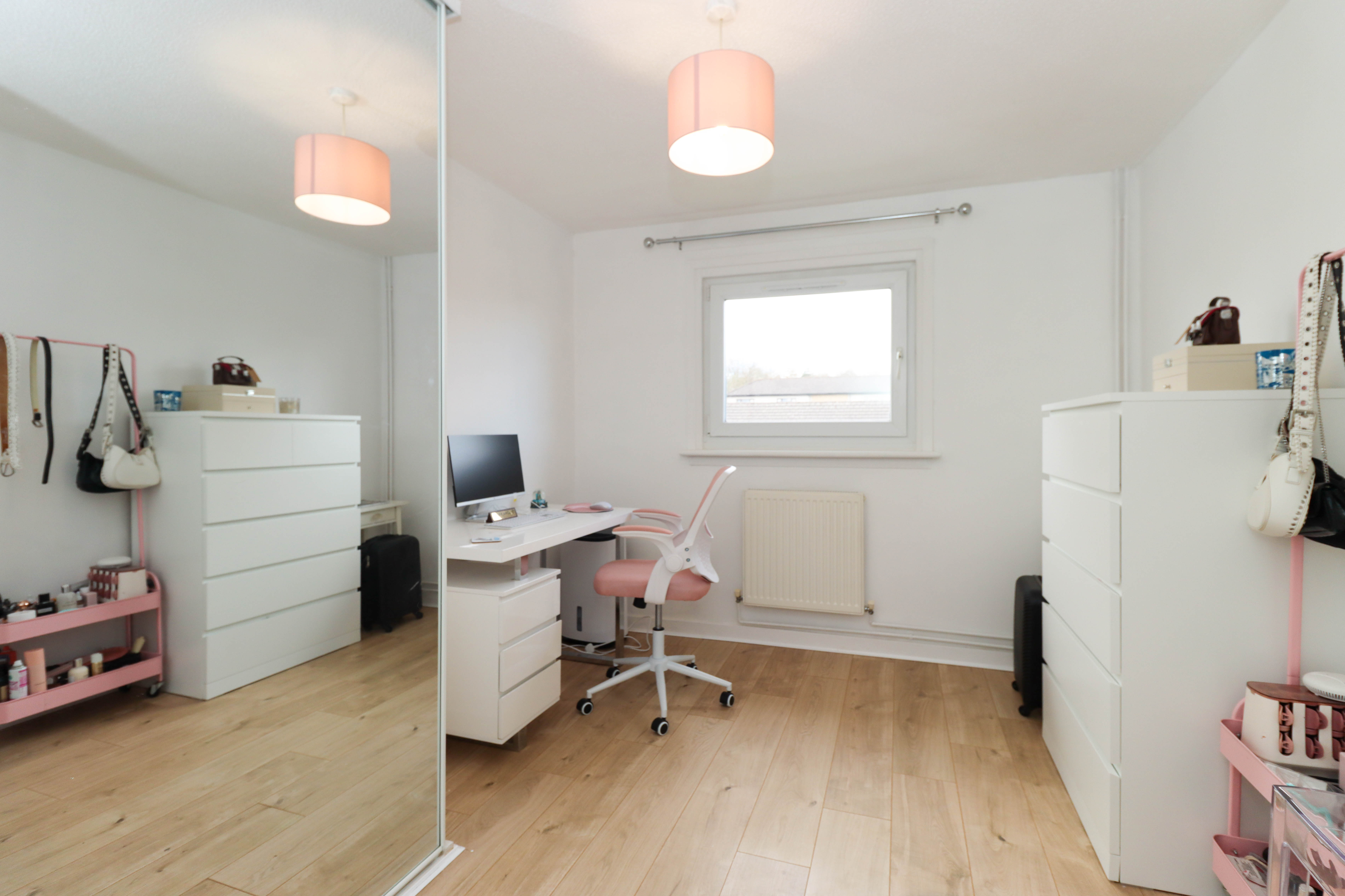 Great sized double bedroom with newly fitted built-in mirrored wardrobes and space for additional storage units. There is one central light fitting, front facing window, painted walls, one radiator and laminate flooring.