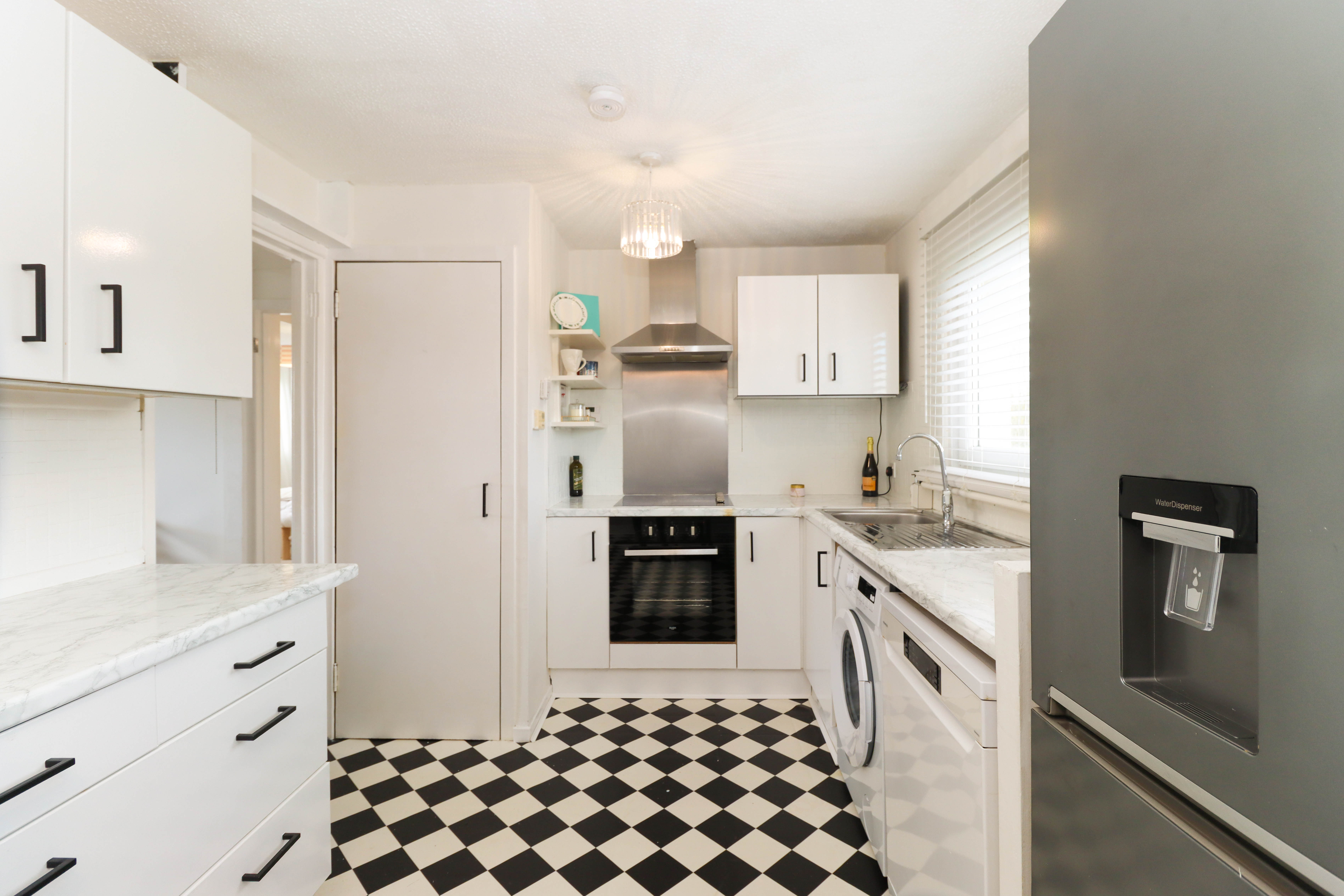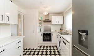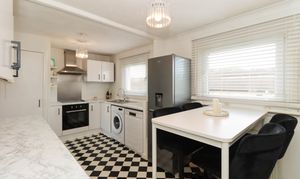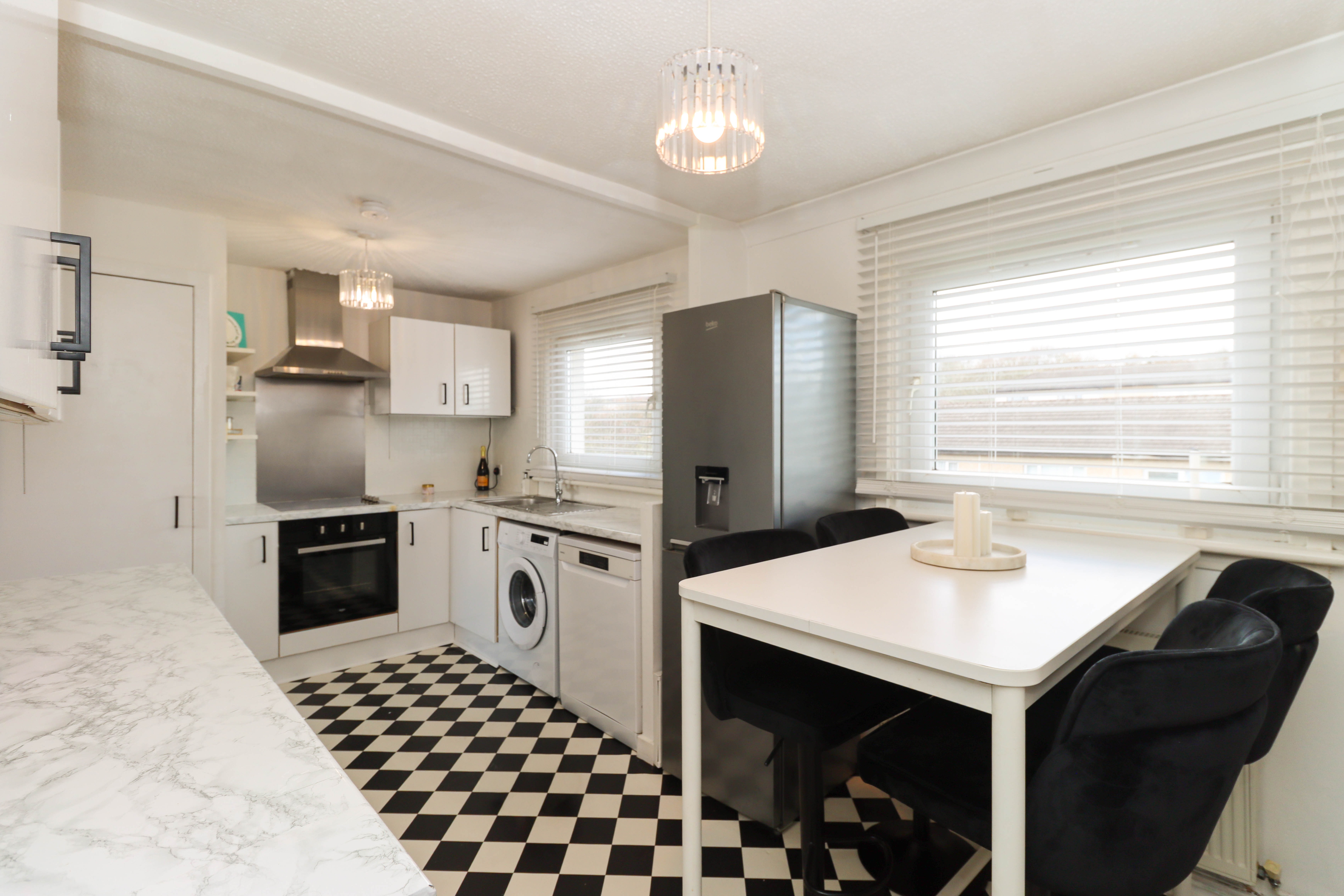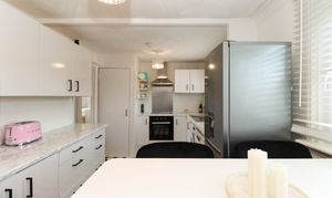 Brilliant sized modern kitchen comprising of: Fitted wall and base units, worktops, space for dining, space for white goods, extractor hood, integrated electric hob, integrated electric cooker and stainless steel sink with mixer tap. There are two central light fittings, tile and painted walls and vinyl flooring. Additionally, there are dual aspect windows and a built-in cupboard space where the newly upgrated heating system is.