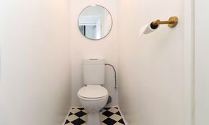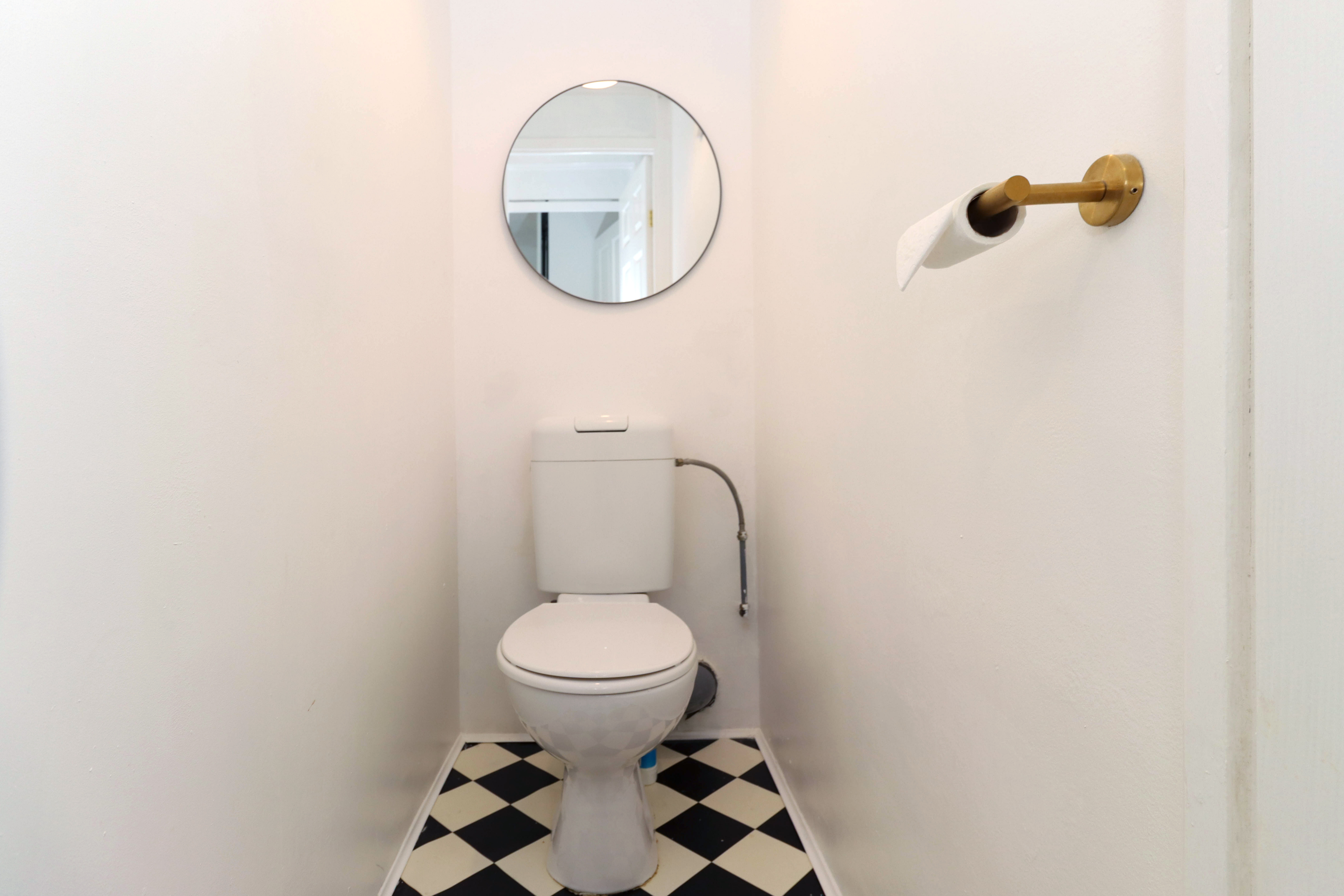 This WC has a white toilet, one central light fitting, extractor fan, neutral painted walls and vinyl flooring.