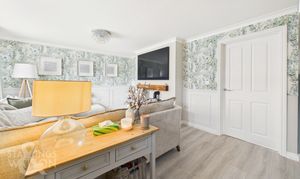 Stepping inside, the spacious sitting room greets you with a porch style entrance space providing room for coats and shoes, with attractive wood panelling and stairs rising to the first floor landing with storage space below. A front facing sash style window overlooks the garden with a feature fireplace with tiled hearth. A door takes you to the L-shaped kitchen/dining room which enjoys a light and bright feel with garden views, and wood effect flooring to the dining area with an attractive wood panelled wall to one side, and built-in storage cupboard under the stairs. French doors lead out to the garden whilst the kitchen offers a fitted range of storage units with integrated cooking appliances including an inset electric ceramic hob, built-in electric double oven, with tiled splash-backs and extractor fan. Space is provided for general white goods including a fridge freezer and dishwasher, with a breakfast bar providing further seating. The ground floor cloak/utility room leads off the kitchen which also includes a built-in work surface and room for a washing machine and tumble dryer, with tiled flooring underfoot.