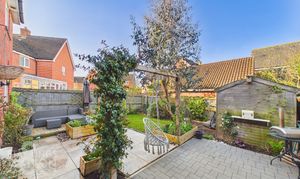 THE GREAT OUTDOORS The rear garden has been fully landscaped to include a large central lawn area with paving and decking leading out from the kitchen French doors. Enjoying a secluded aspect with timber fence boundaries and a range of mature planting, double timber gates open up to the adjacent carport allowing for further parking or a block-paved seating/storage area, with a timber built shed.