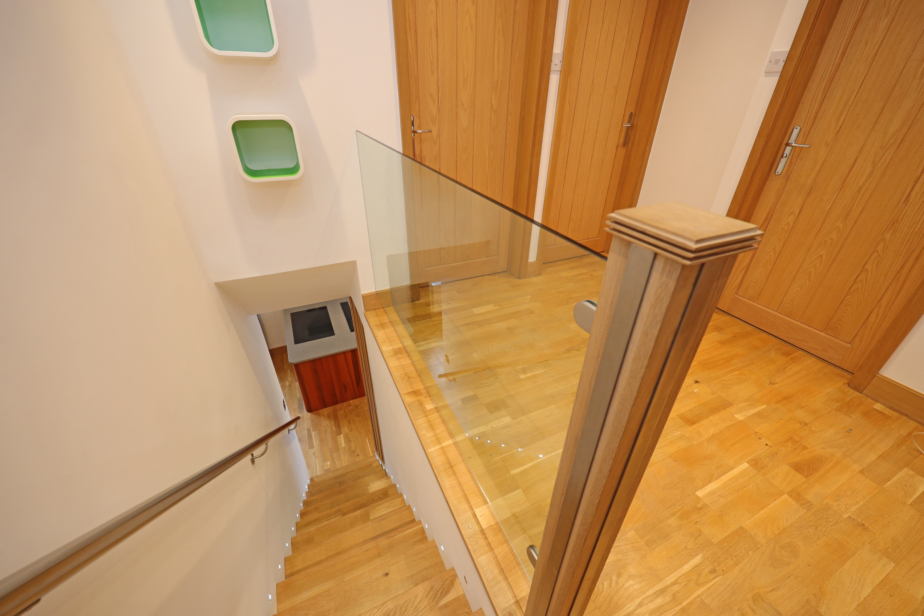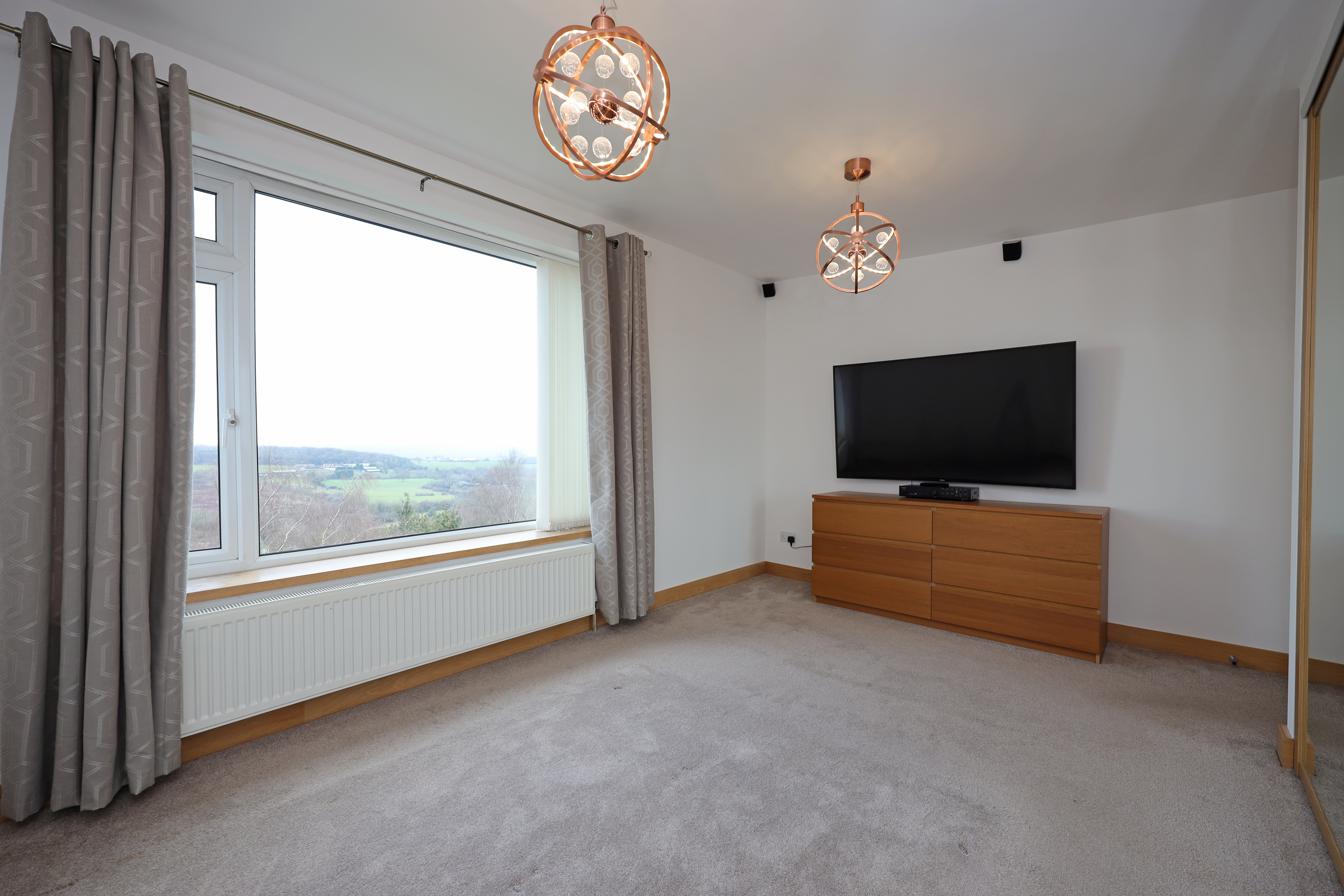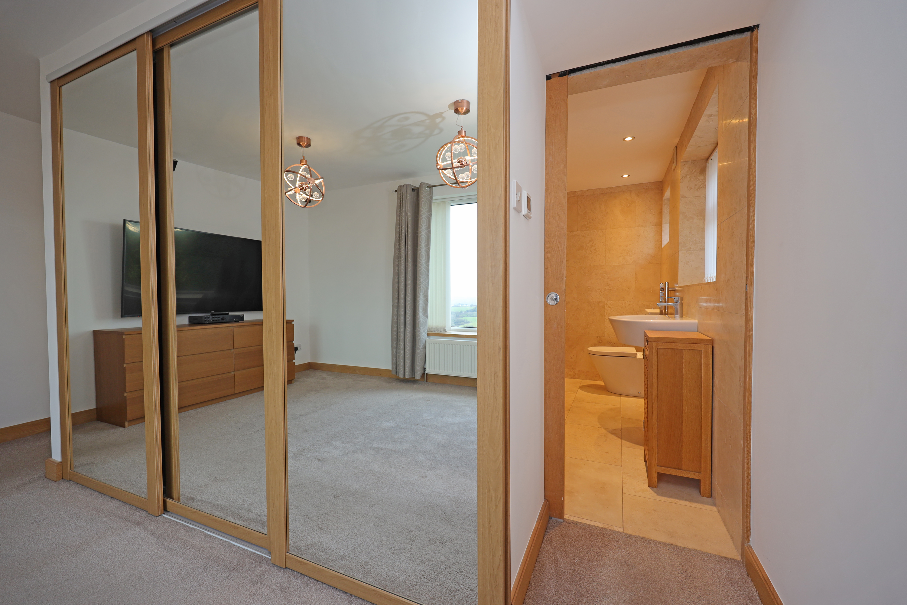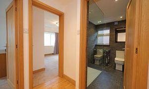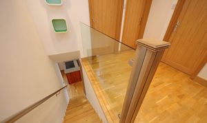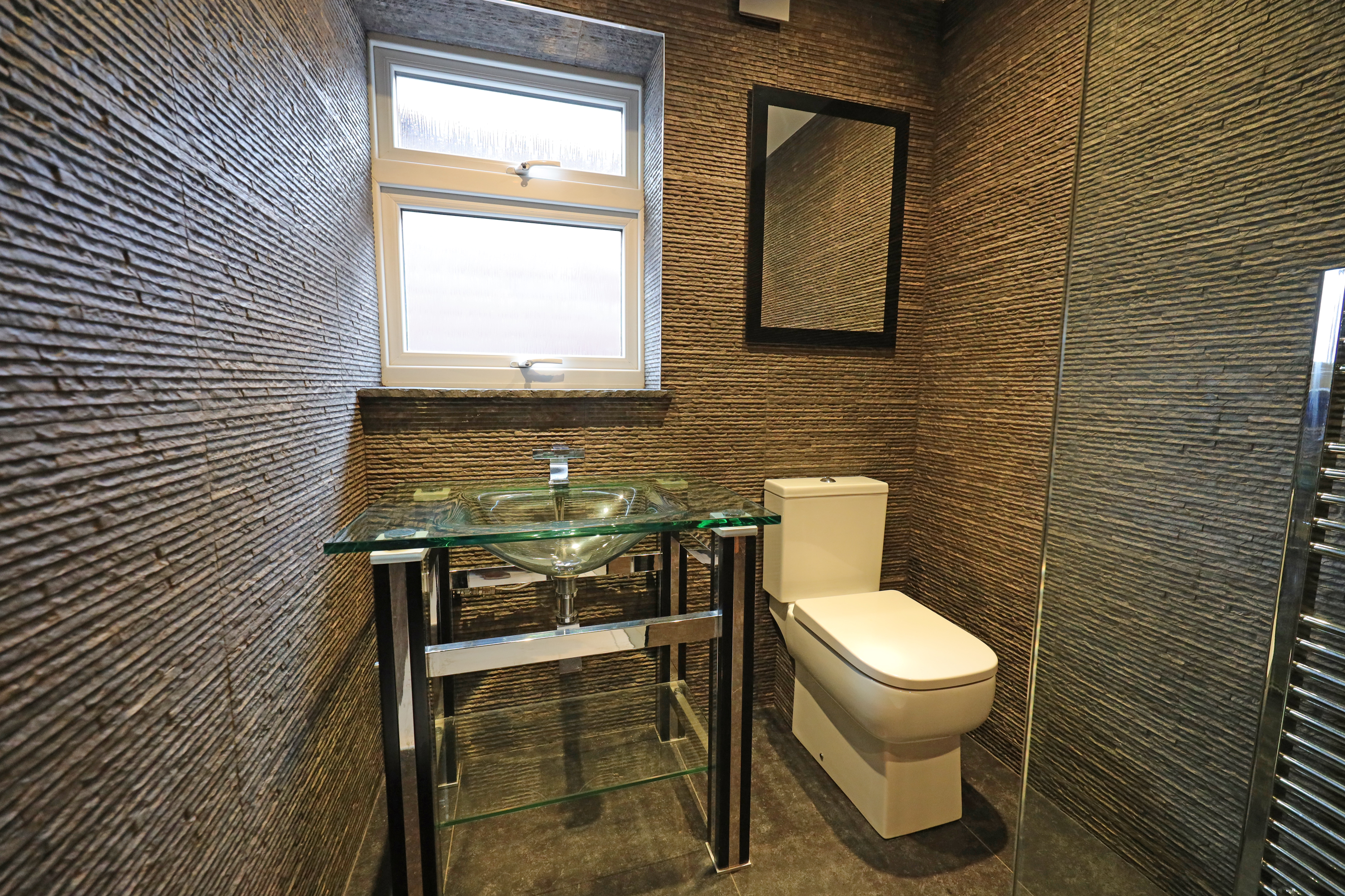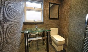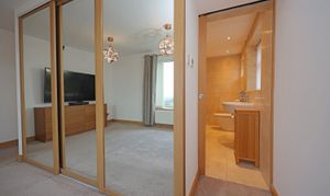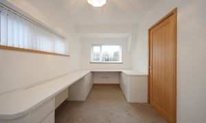 Central reception hallway with modern oak internal doors open to the bedroom accommodation and shower room. There is a modern upright radiator and a glass balustrade stairway leads to the lower ground floor reception and kitchen area. The master bedroom has a large rear facing window to take full advantage of the views and is fitted with triple wardrobe units with mirrored sliding doors including concealed entrance to a luxurious fully equipped ensuite bathroom. This is fitted with a raised feature bath with inset TV, concealed waterfall tap and wet room, shower area with raindrop thermostatic shower, wall hung vanity wash basin and enclosed WC. There are three further practical size bedrooms including a second guest bedroom having further fitted wardrobes and rearview aspect. The front bedrooms offer versatility to be used as alternative family reception/study areas which includes one bedroom currently fitted with a range of office cupboard storage units. The other bedroom has ladder access to the loft roof void, which contains the central heating boiler. There is also an additional showroom to service these bedrooms which is fitted with a stylish modern suite with feature tiling and comprises; walk in shower with glass splash screen and mains thermostatic control, WC and a feature glass tabletop wash basin.