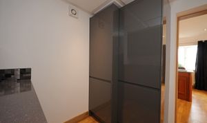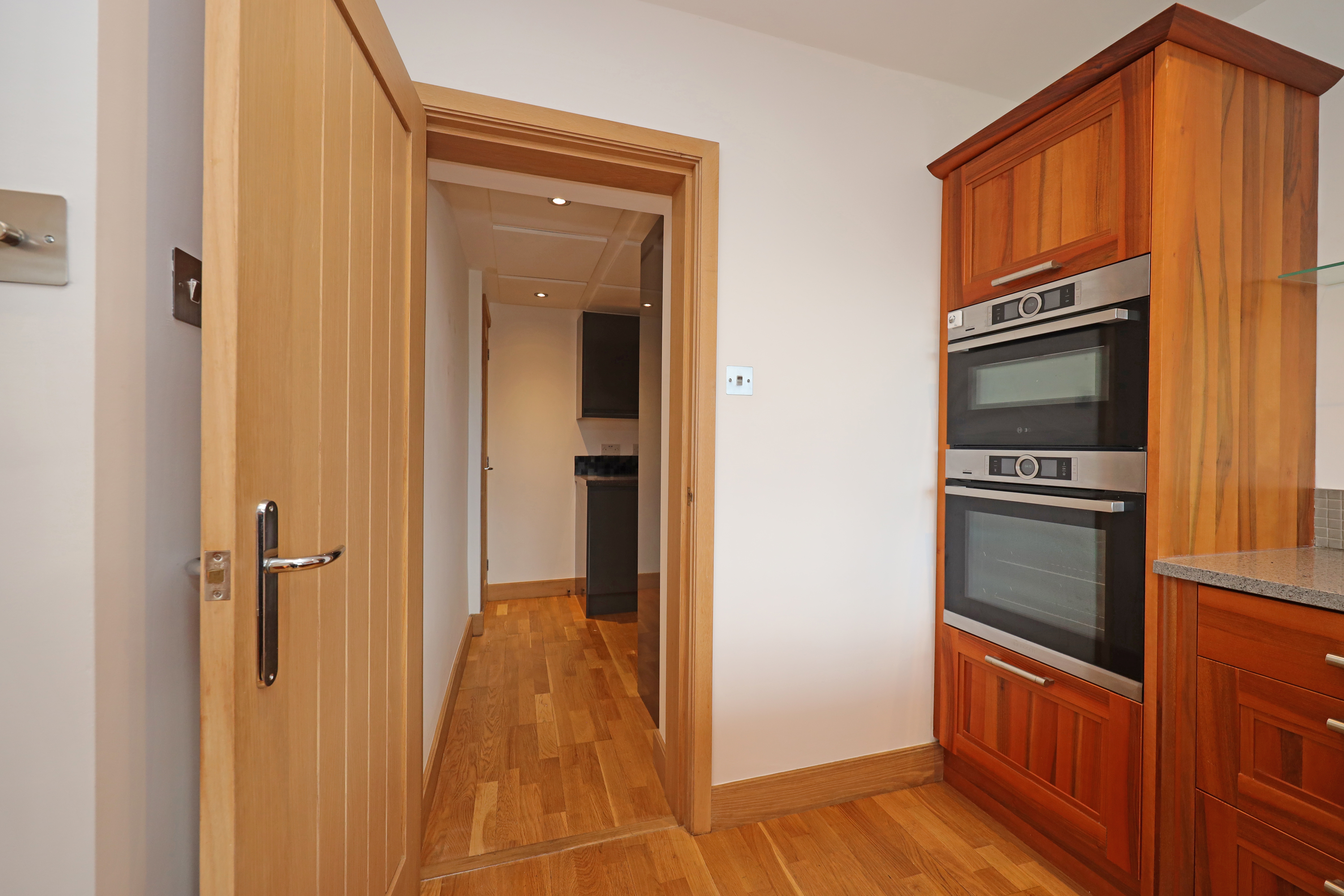 A staircase from the reception hallway with LED foot lighting leads to the lower ground floor reception area. This provides a stylish and full width open plan living and dining space with kitchen area. Further views are enjoyed, including patio doors opening onto an elevated patio, creating an ideal summer and entertaining space. The kitchen area is fitted with a well equipped contemporary range including peninsula breakfast area with granite worktops and a one and a half inset sink. There is a full range of appliance integration to include fitted electric oven, matching combined microwave oven, twin integrated fridges, and large five ring induction hob with concealed surface mounted extractor. There is a separate utility with gloss fitted base/wall units, integrated dishwasher, full upright integrated freezer and larder cupboard. A further door leads to a walk in storage area with integrated shelving and additional pull-out shelving to further concealed under stairs storage.