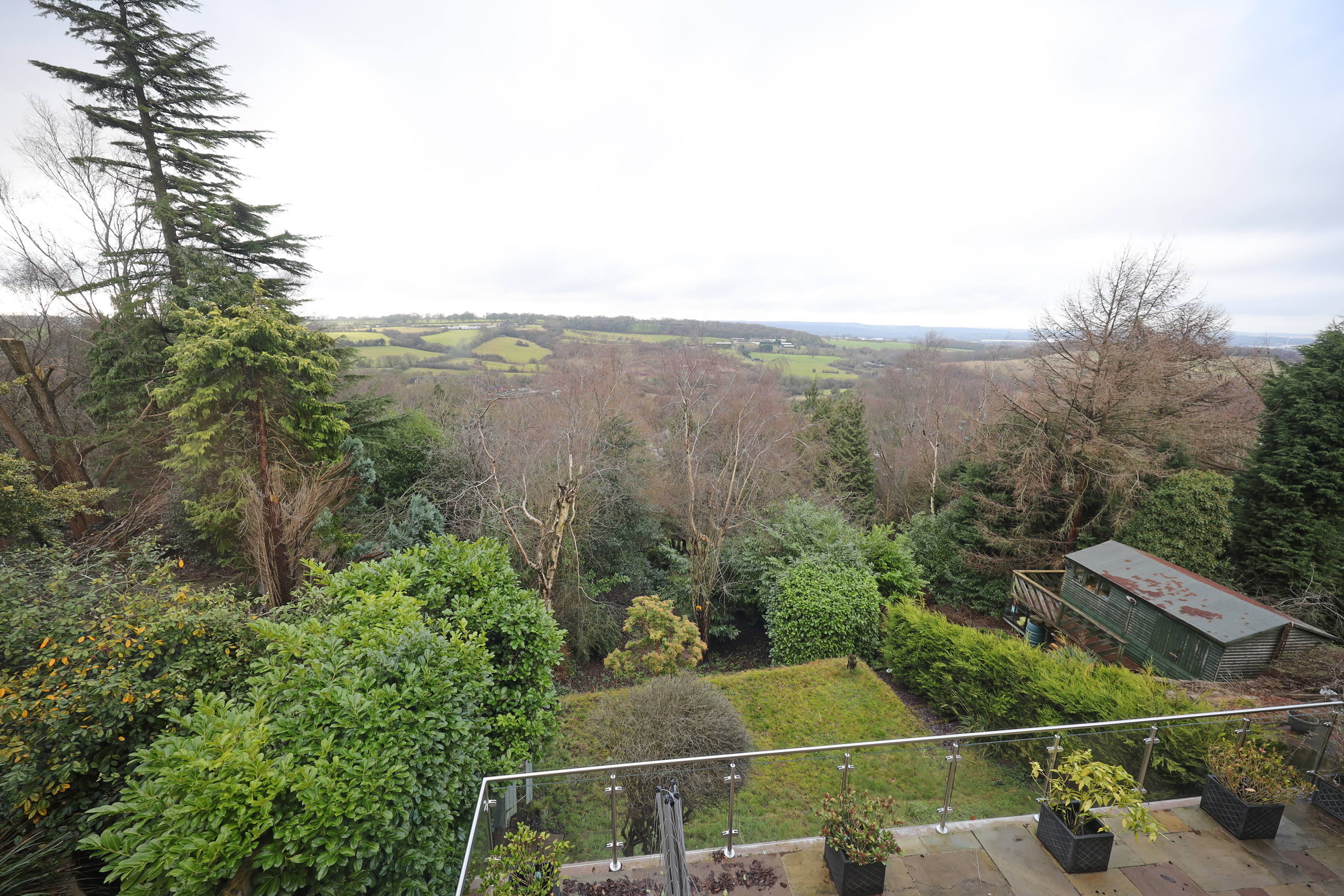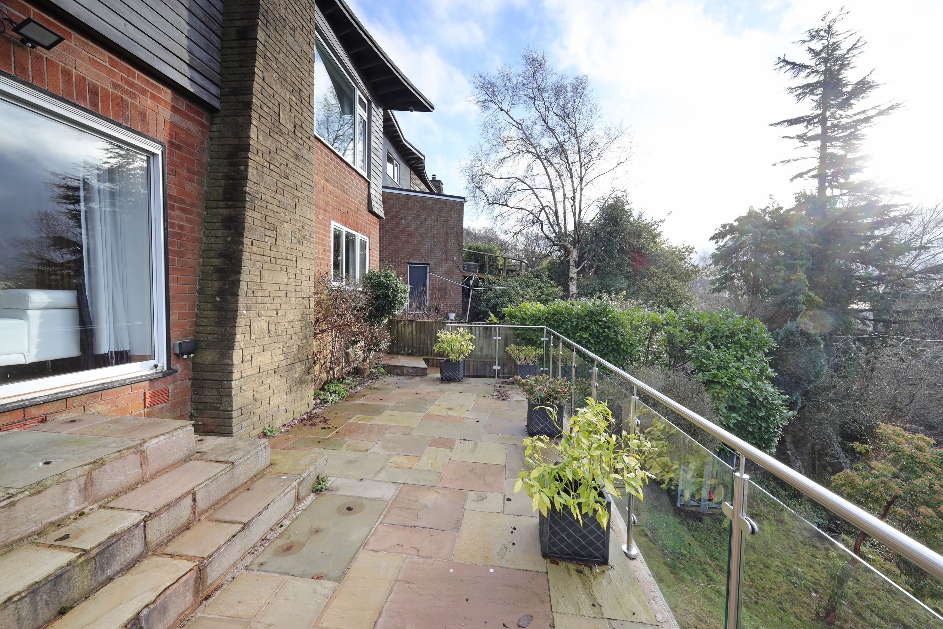 To the exterior there is a block paved driveway providing parking to the front and a lawn area. Access can be obtained to either side of the property with steps down and lead to an Indian Stone paved terrace rear patio with protective glass balustrade enjoying far reaching panoramic westerly views and creates a perfect summer entertaining terrace. Steps lead down to a second tiered lawn area with retaining wall and further steps down to the lower garden area which is abundant with mature trees and shrubbery.