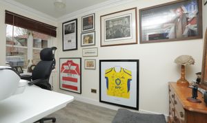 The dining room at the rear of the house overlooks the garden, creating a delightful setting for both casual and formal dining. The kitchen is a bright, airy room with ceramic tiled flooring, and it is thoughtfully fitted with a range of elegant wooden wall and floor units, complemented by laminate work surfaces. Large windows offer picturesque views of the garden, and a wide opening leads into the breakfast room, providing an additional space for casual dining or social gatherings. Adjacent to the kitchen is a utility room, which offers excellent practicality with a door leading to the outside. Completing the ground floor is a well-proportioned study, which could also serve as a ground-floor bedroom, and a conveniently placed cloakroom for guests.