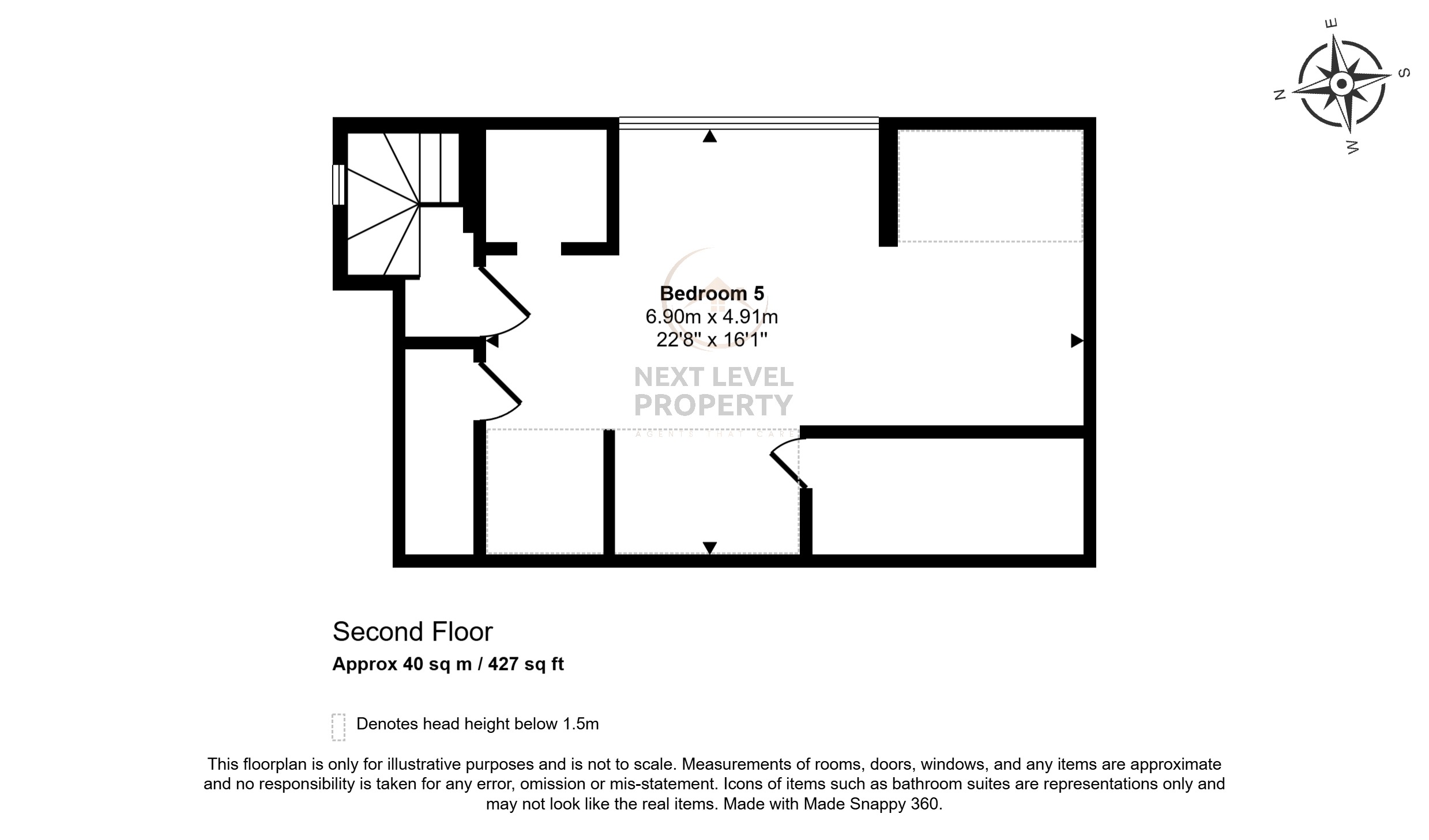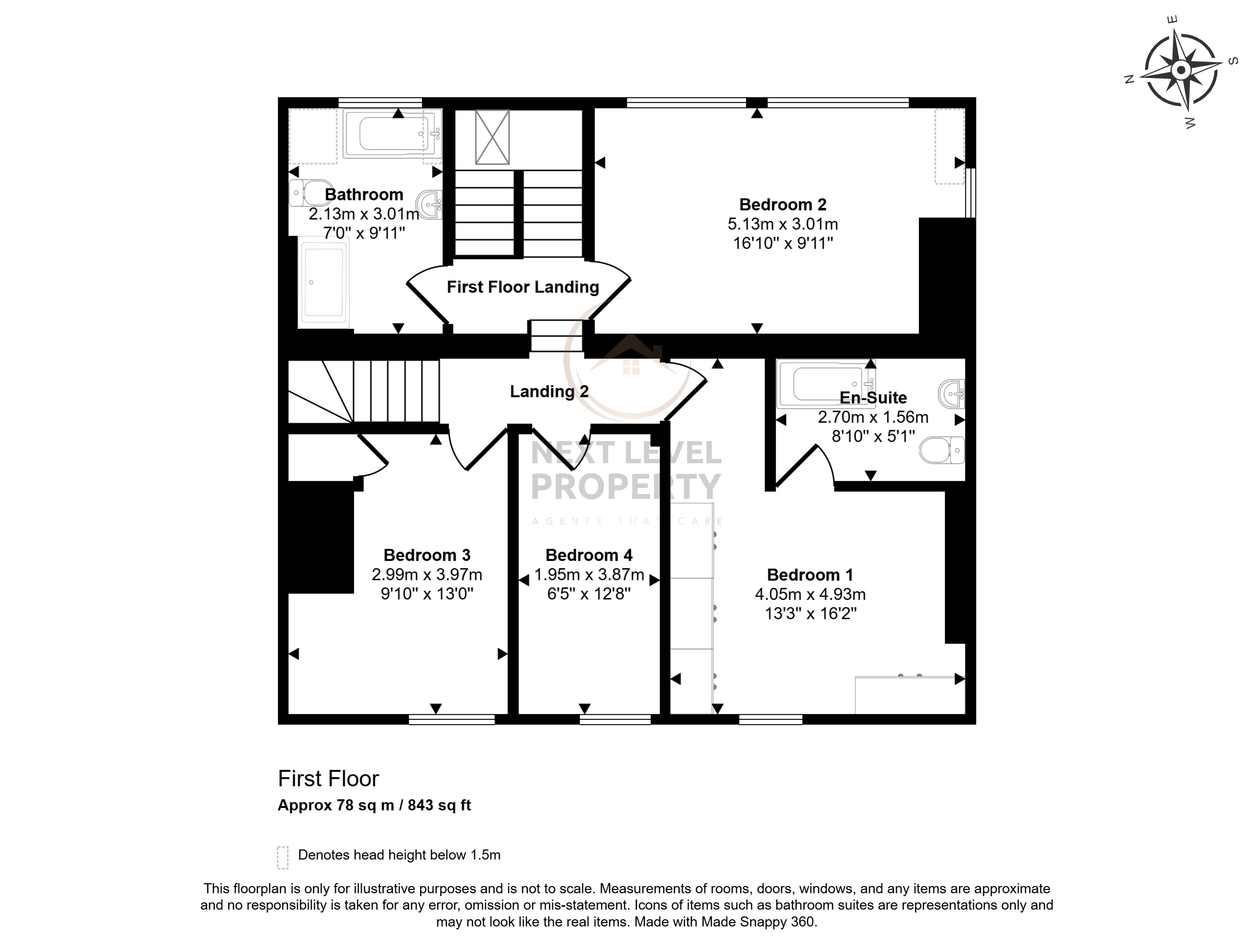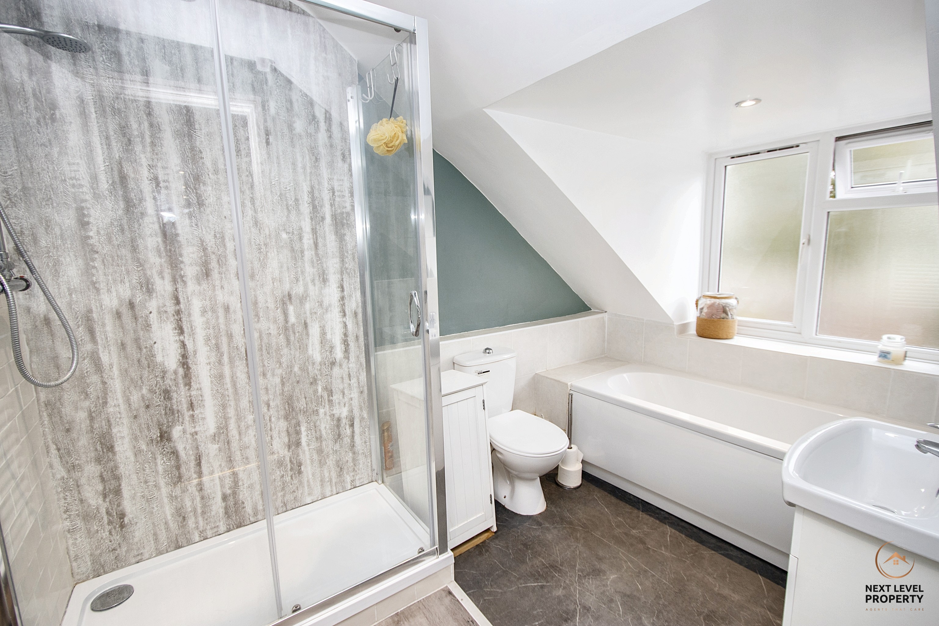 The split-level landing provides access to four of the five bedrooms and the family bathroom, with a further staircase rising to the second floor where the fifth bedroom is located. This layout adds character to the home while ensuring a natural flow between the living spaces and sleeping accommodation