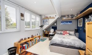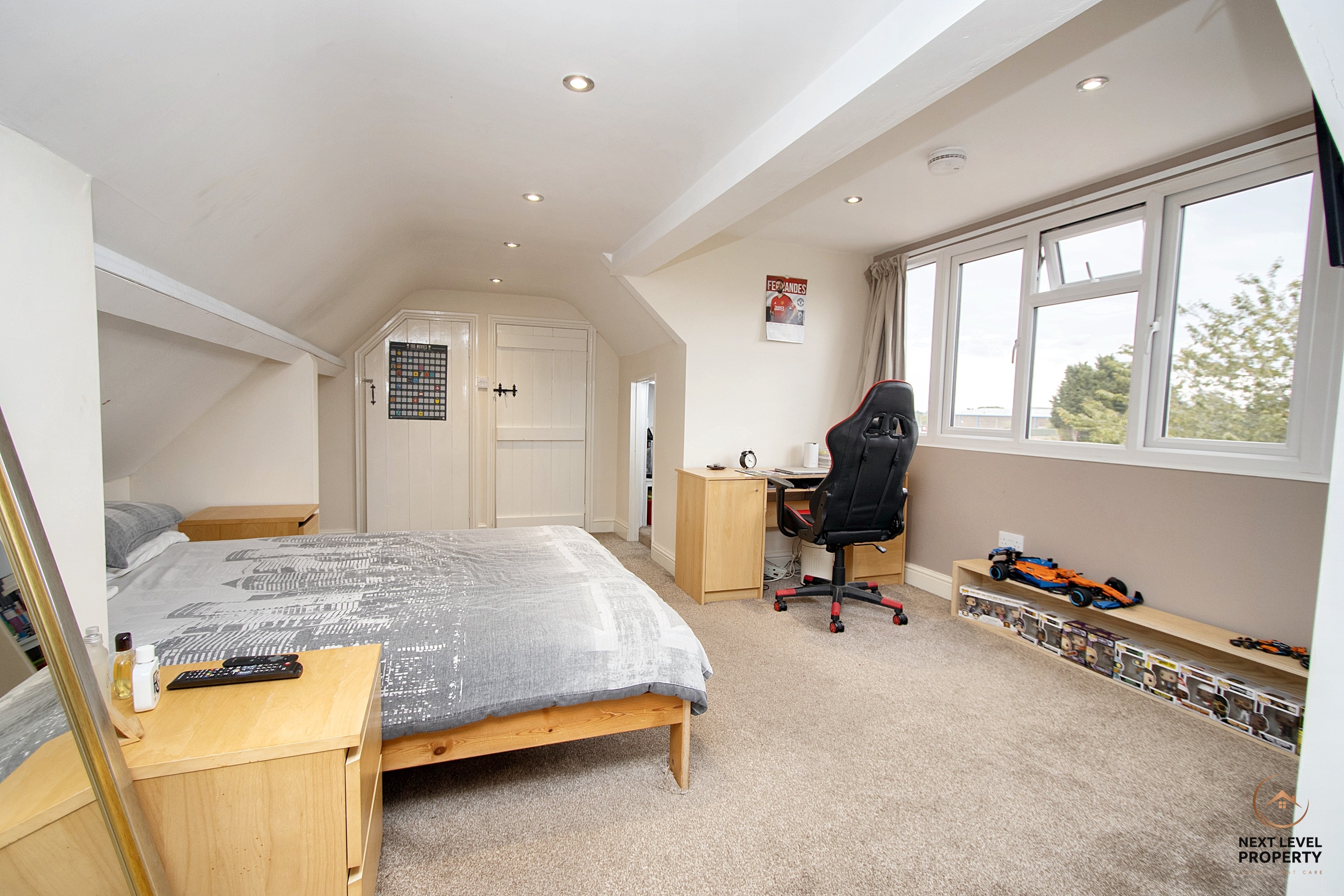 Occupying the top floor, Bedroom 5 is the largest of all the bedrooms and offers an impressive amount of space. A walk-in dressing area and two storage rooms with fitted doors add excellent practicality, while a large dormer window to the rear provides far-reaching garden views and floods the room with natural light