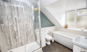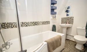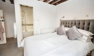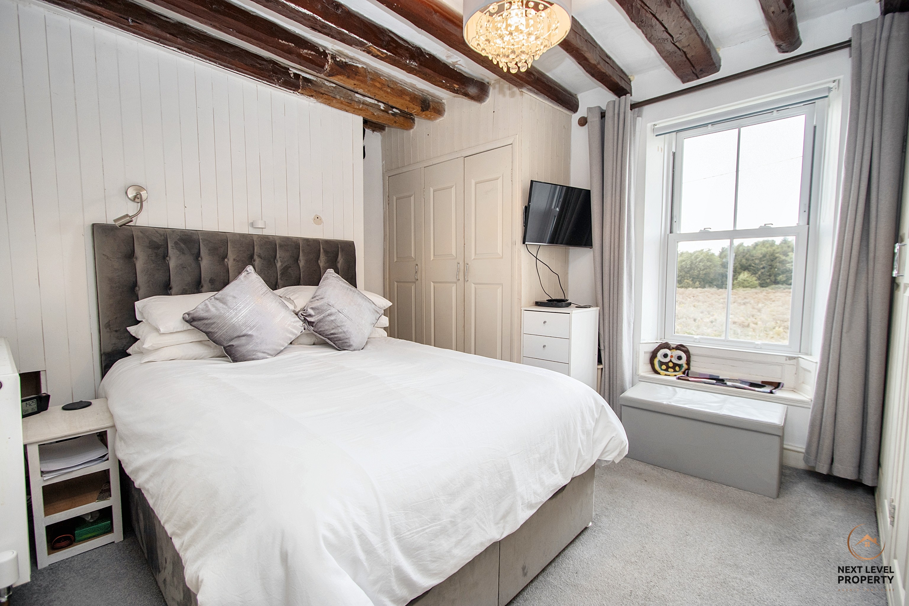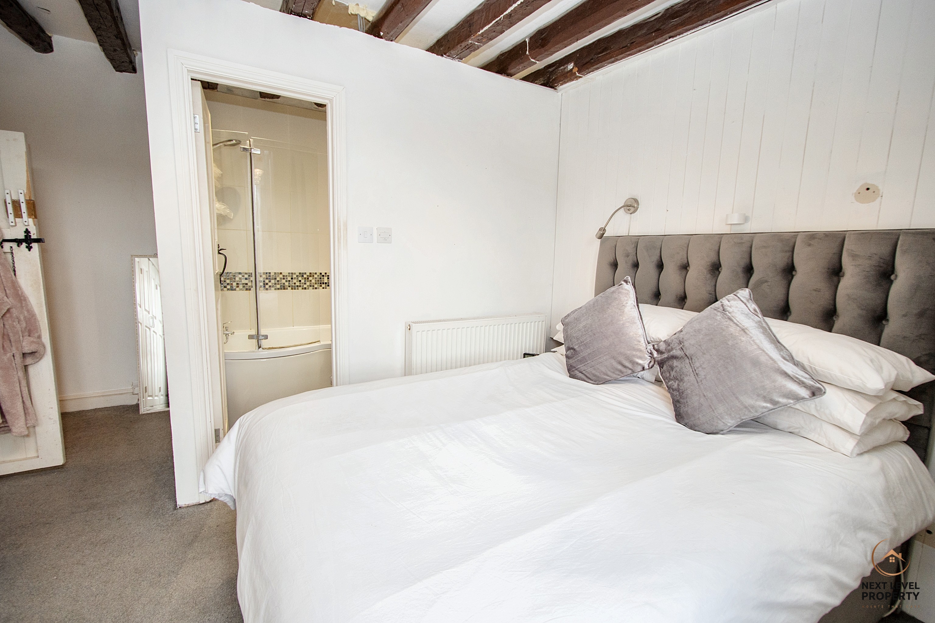 A well-proportioned double bedroom featuring exposed character beams and fitted wardrobes, with a sash window to the front adding charm and natural light. The en-suite bathroom is fitted with a P-shaped bath with shower over, low-level WC, pedestal hand basin and radiator, complemented by tiled splashbacks for a neat finish