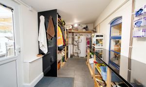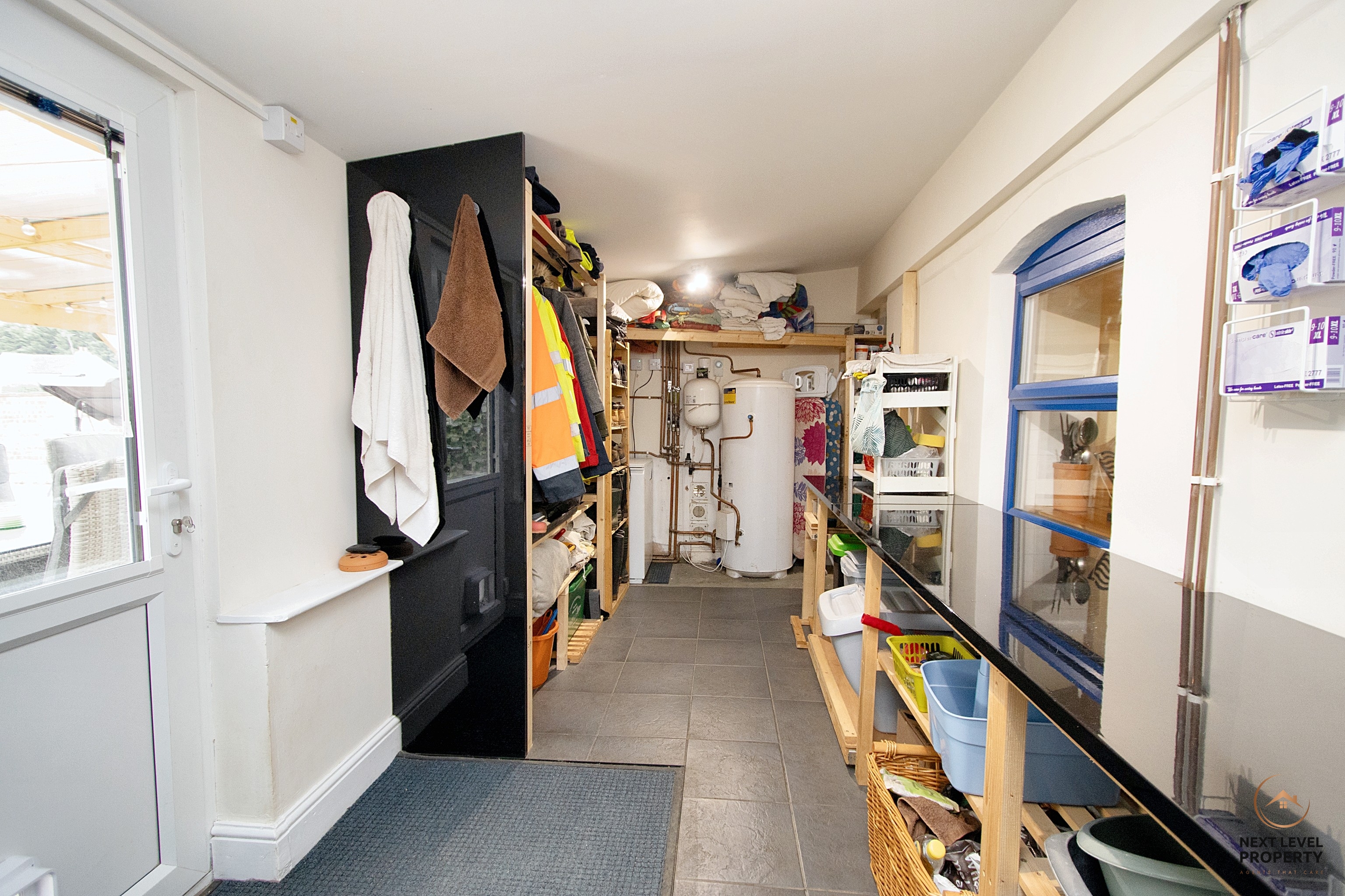 A highly practical space offering a variety of storage options including shelving, coat hooks and a fitted bench. Housing the boiler and hot water tank, this room also provides everyday convenience with direct access to the rear entrance